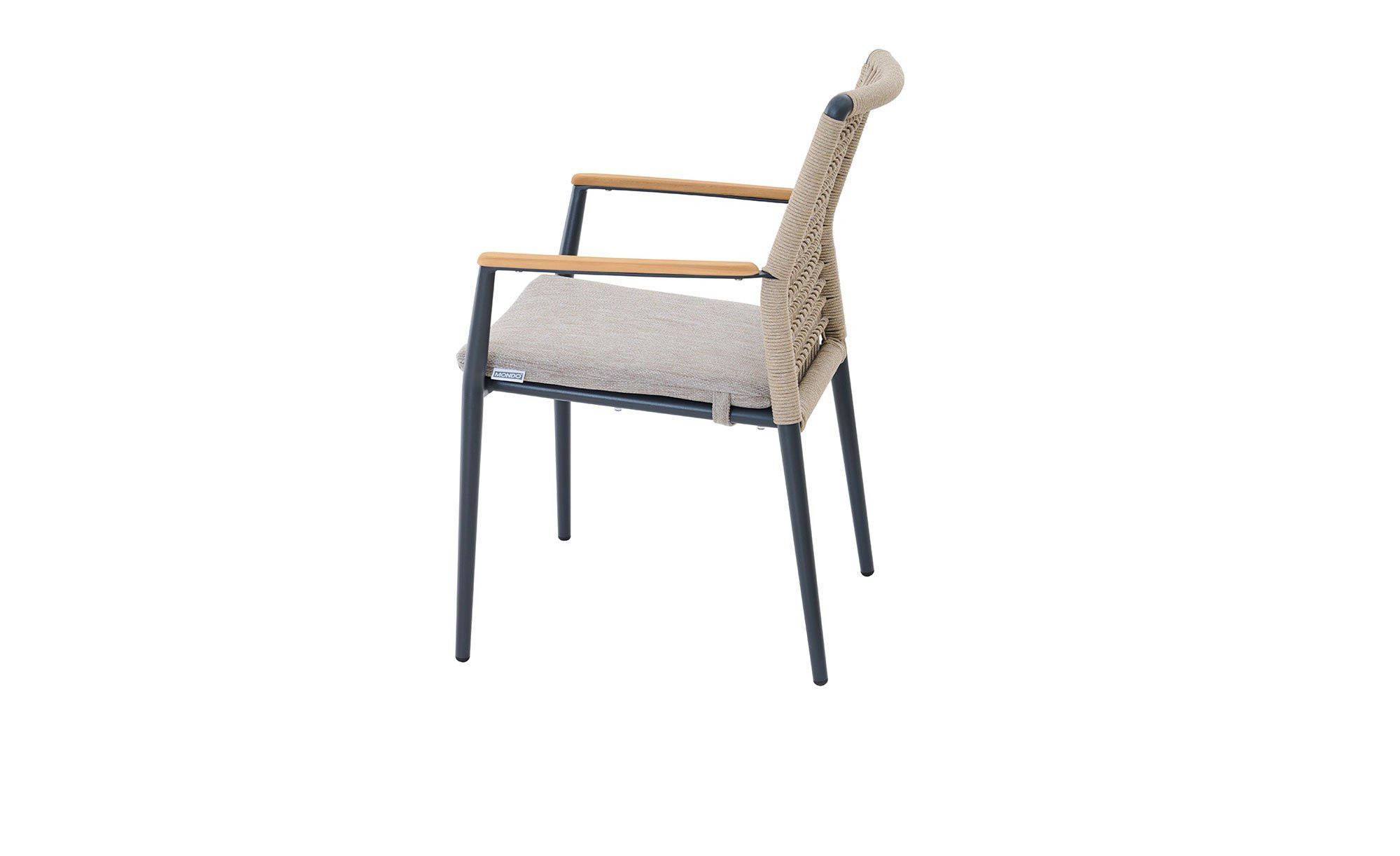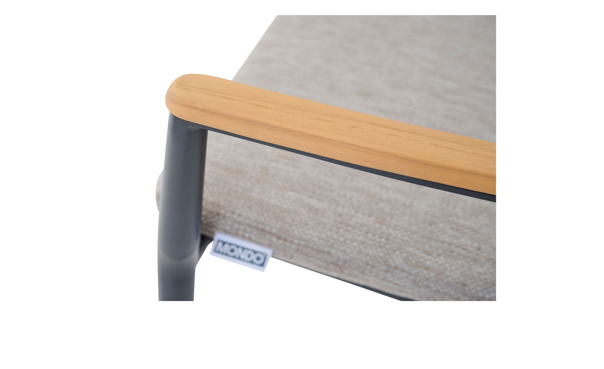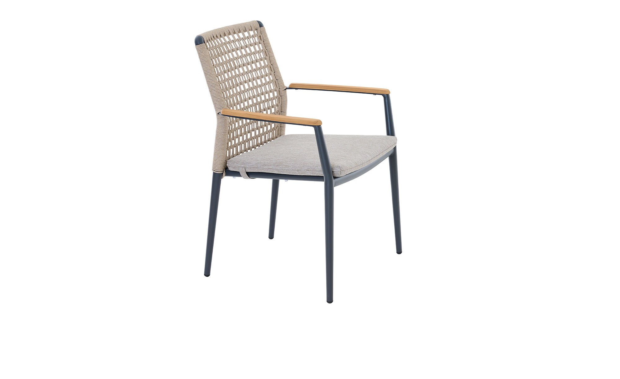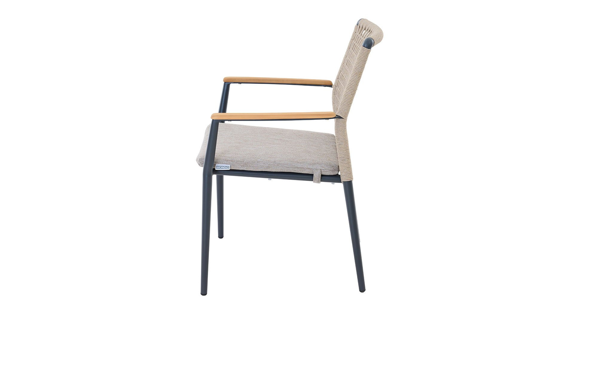 Der Gartenstuhl MONDO Latea verfügt über ein stabiles Aluminium-Gestell mit vier Füßen. Es ist in einem matten Anthrazit gehalten und pulverbeschichtet. Absolute Hingucker sind die Armleh-nen-Auflagen aus Teakholz, am Rücken findet sich eine Fläche aus Rope (Seil). Für noch mehr Komfort wird ein passendes Polster mit einem Polypropylen-Bezug im Ton Taupe direkt mitgelie-fert. Ausgesprochen praktisch: Das ca. 62 x 84 x 56,5 cm große Möbelstück von MONDO ist bei Bedarf stapelbar! Sie können es also bei Nichtnutzung, etwa im Winter, schnell und platzsparend ver-stauen.
