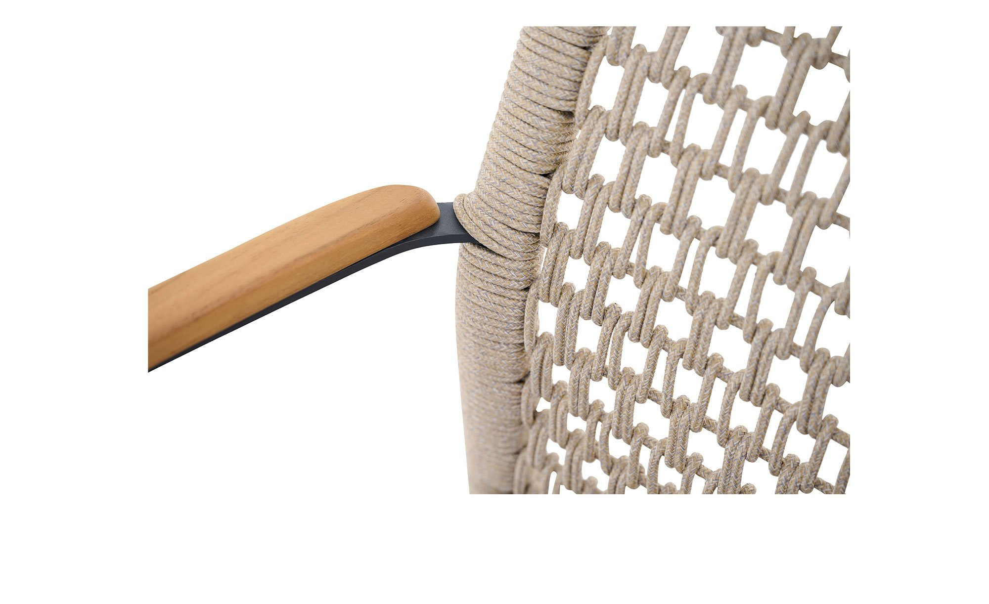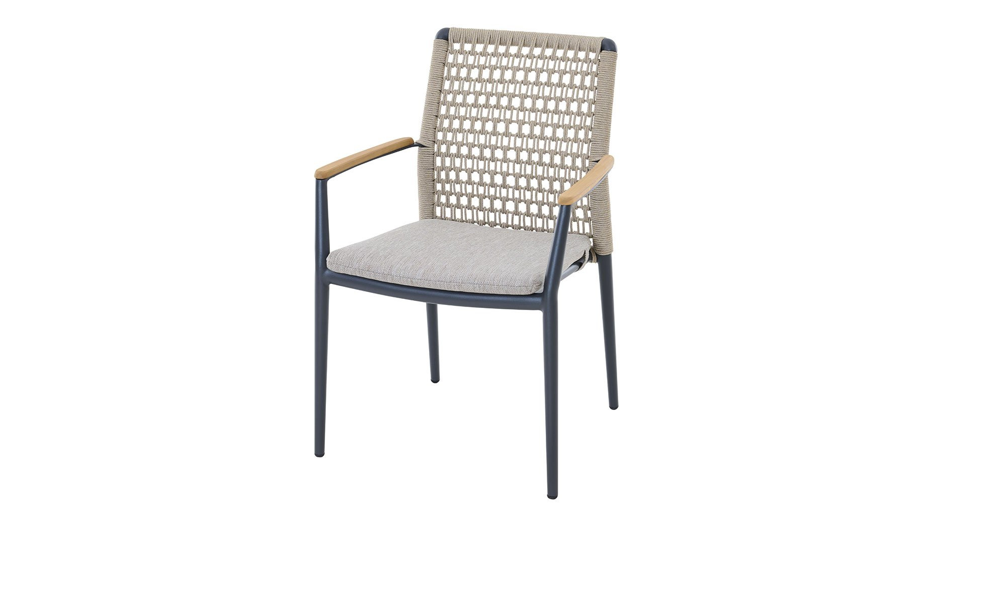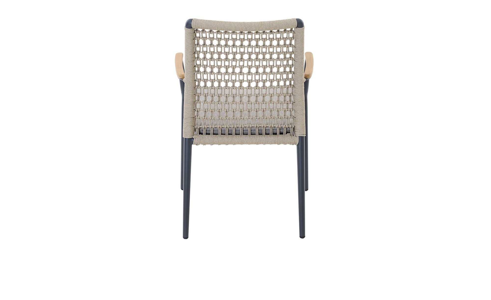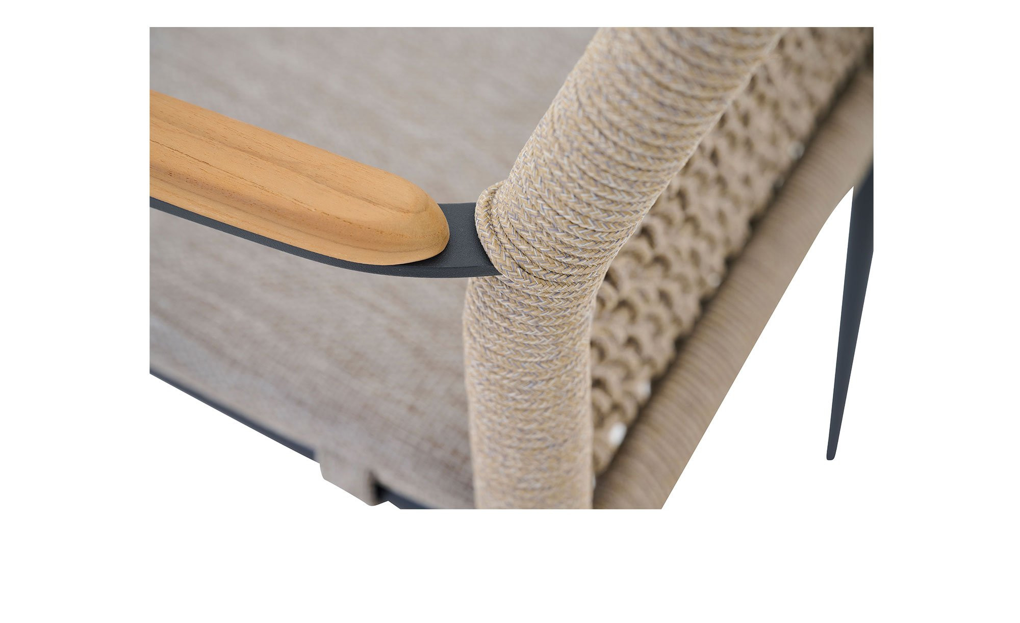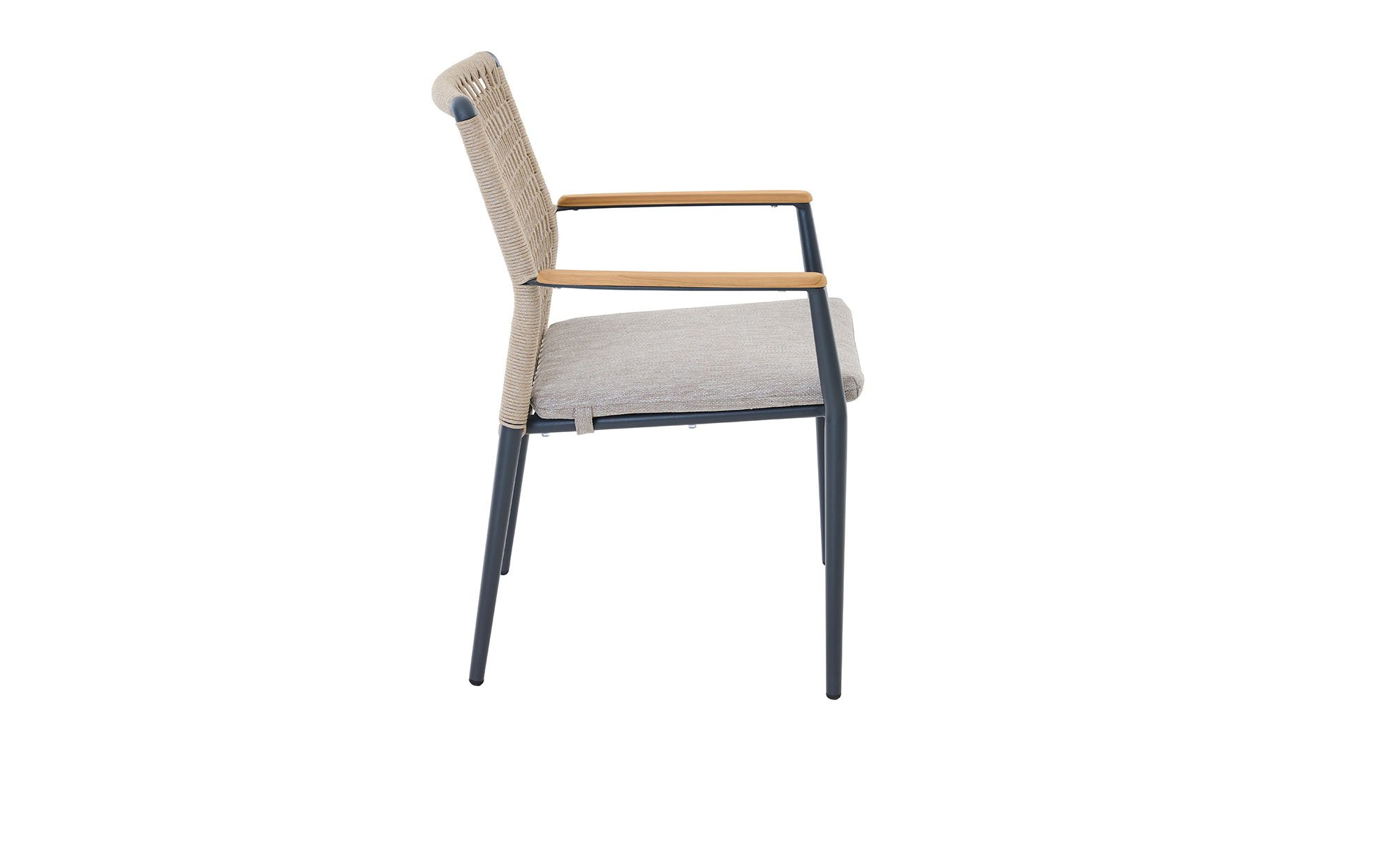Der Gartenstuhl MONDO Latea verfügt über ein stabiles Aluminium-Gestell mit vier Füßen. Es ist in einem matten Anthrazit gehalten und pulverbeschichtet. Absolute Hingucker sind die Armleh-nen-Auflagen aus Teakholz, am Rücken findet sich eine Fläche aus Rope (Seil). Für noch mehr Komfort wird ein passendes Polster mit einem Polypropylen-Bezug im Ton Taupe direkt mitgelie-fert. Ausgesprochen praktisch: Das ca. 62 x 84 x 56,5 cm große Möbelstück von MONDO ist bei Bedarf stapelbar! Sie können es also bei Nichtnutzung, etwa im Winter, schnell und platzsparend ver-stauen.