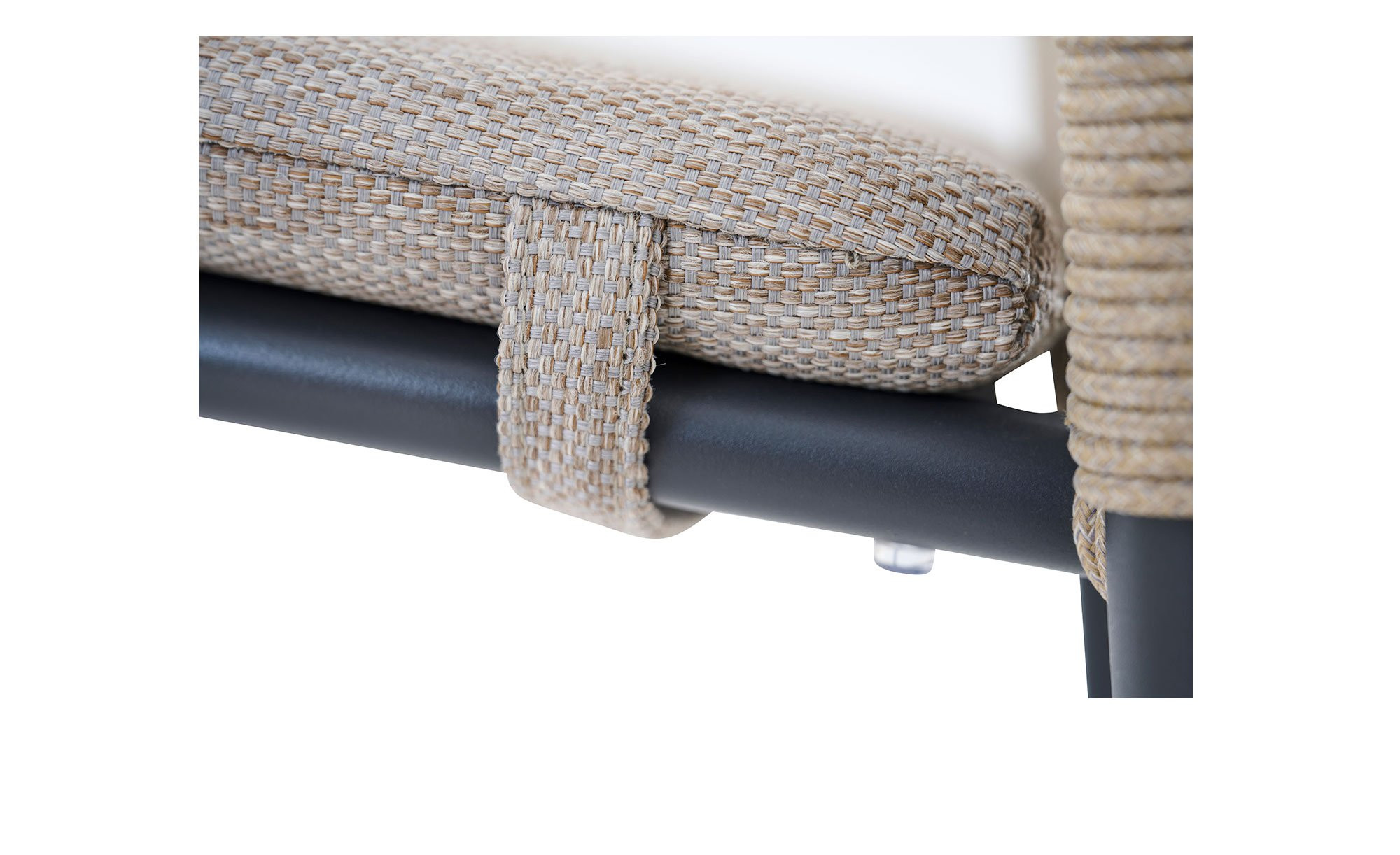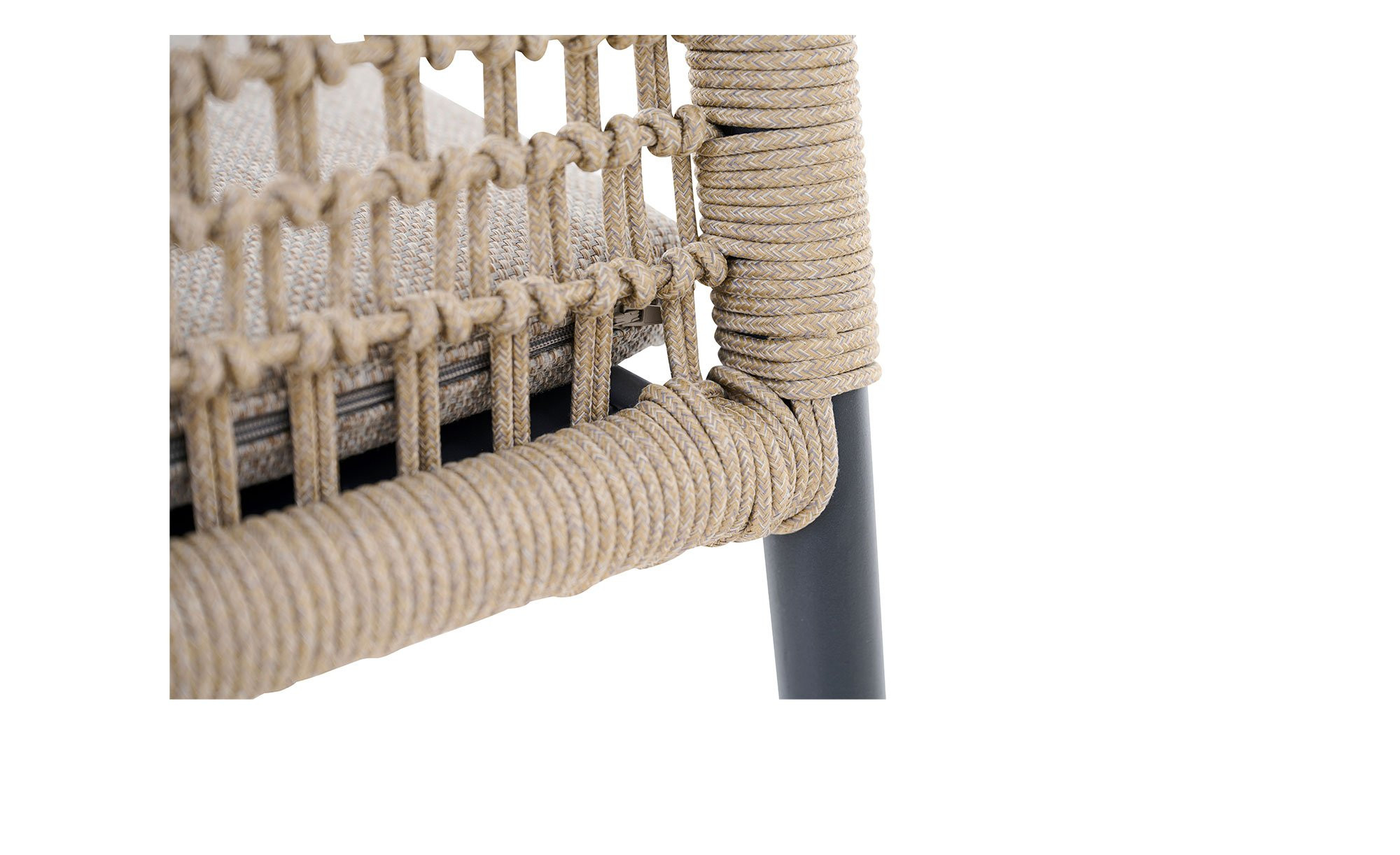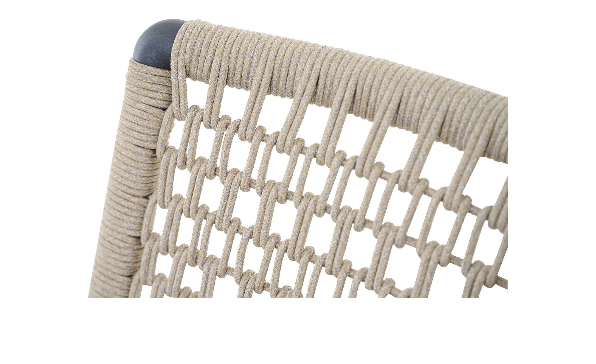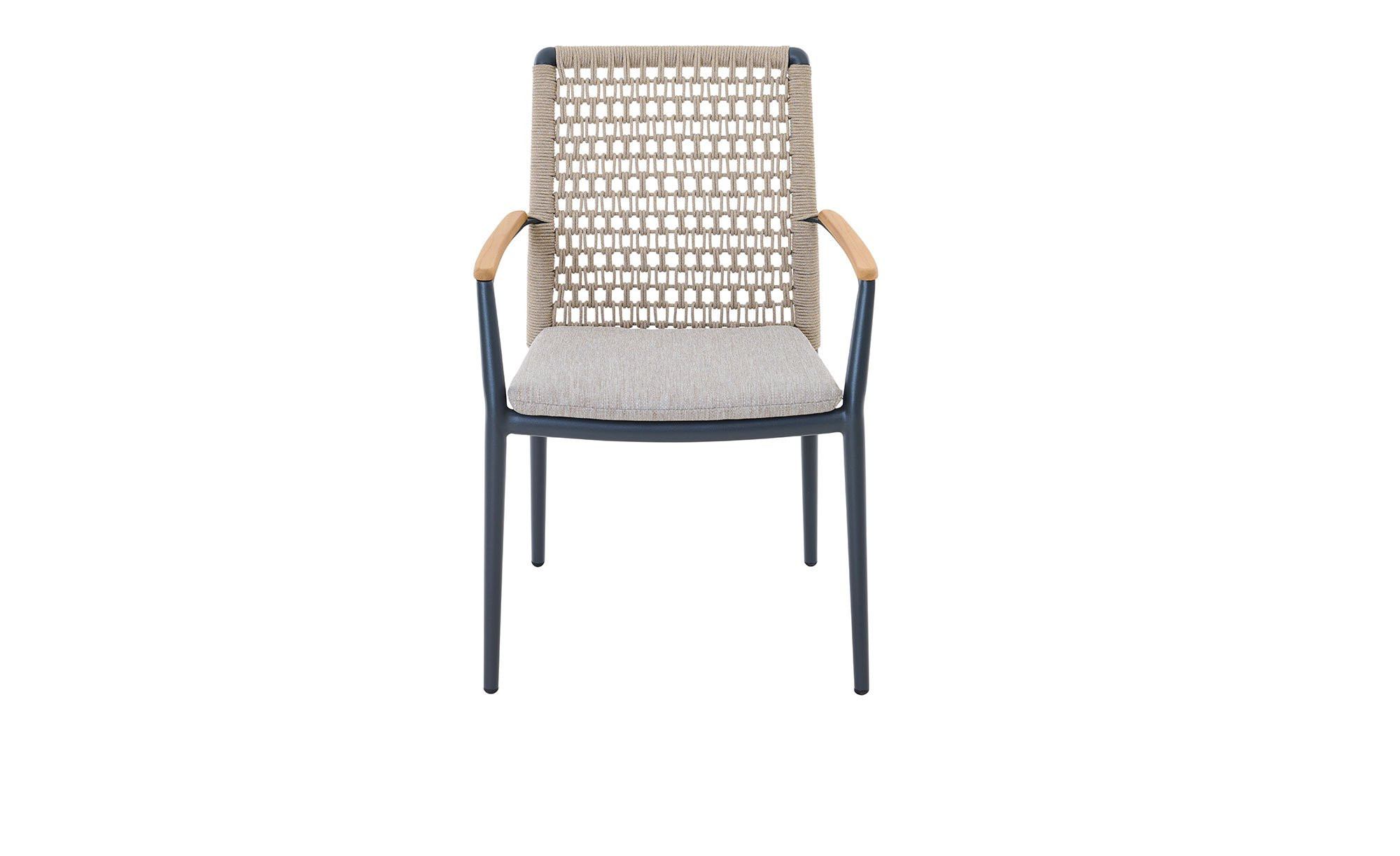 Der Gartenstuhl MONDO Latea verfügt über ein stabiles Aluminium-Gestell mit vier Füßen. Es ist in einem matten Anthrazit gehalten und pulverbeschichtet. Absolute Hingucker sind die Armleh-nen-Auflagen aus Teakholz, am Rücken findet sich eine Fläche aus Rope (Seil). Für noch mehr Komfort wird ein passendes Polster mit einem Polypropylen-Bezug im Ton Taupe direkt mitgelie-fert. Ausgesprochen praktisch: Das ca. 62 x 84 x 56,5 cm große Möbelstück von MONDO ist bei Bedarf stapelbar! Sie können es also bei Nichtnutzung, etwa im Winter, schnell und platzsparend ver-stauen.