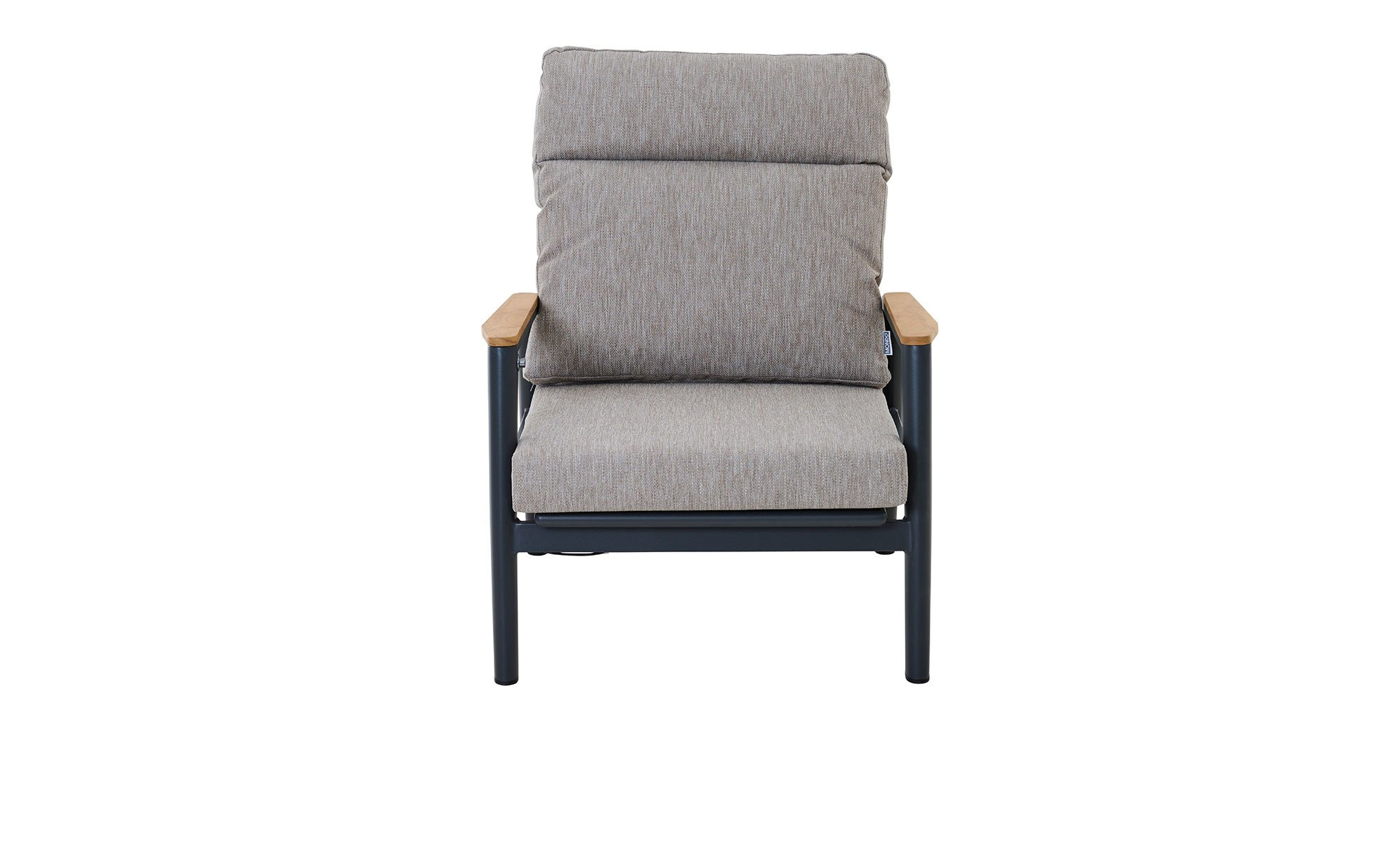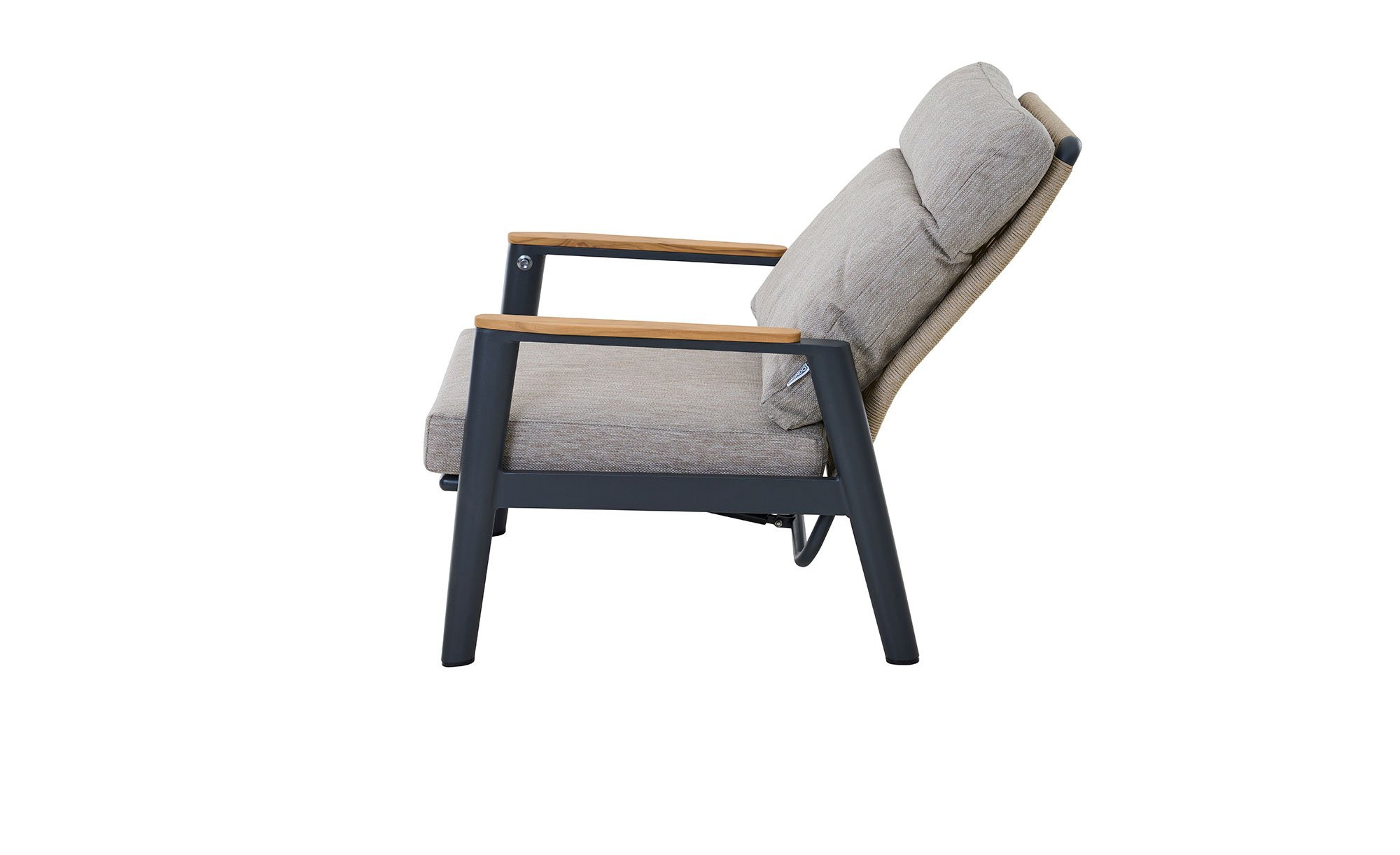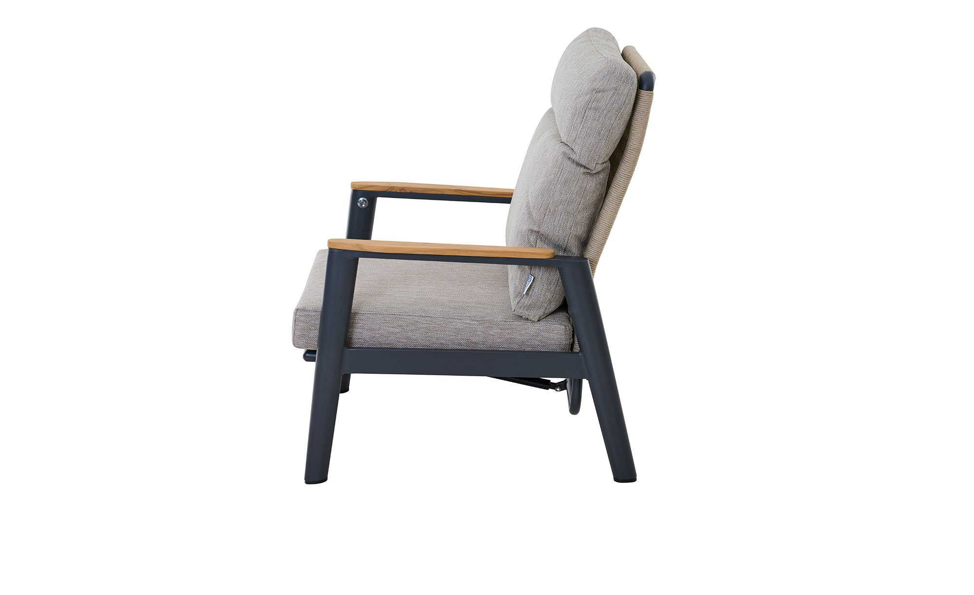 Der Artikel misst ca. 79 x 92 x 86 cm und verfügt über ein 4-Fuß-Gestell aus Aluminium. Seine Farbgebung in Anthrazit sowie die matte Pulverbeschichtung tragen zur edlen Ausstrahlung bei. Zusätzlich dürfen Sie sich auf Armlehnenonlays aus holzfarbenem Teakholz freuen, die einen natürlichen Akzent setzen. Besonders praktisch: Der Gartenstuhl MONDO Latea ist stufenlos verstellbar und lässt sich somit Ihren individuellen Wünschen anpassen! Zusätzlich gehören bequeme Kissen mit grauen Bezügen aus 100 % Polypropylen zum Angebot. Sie komplettieren das Wohlfühl-Paket für den Garten, die Terrasse oder den Balkon.
