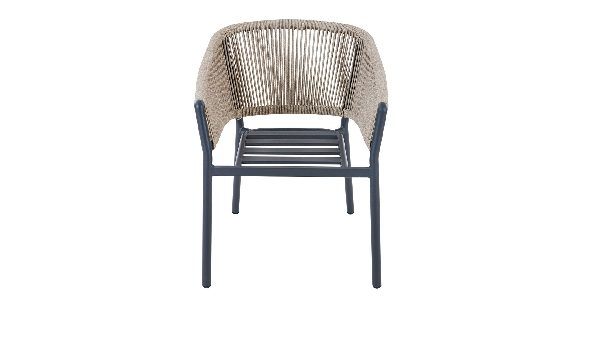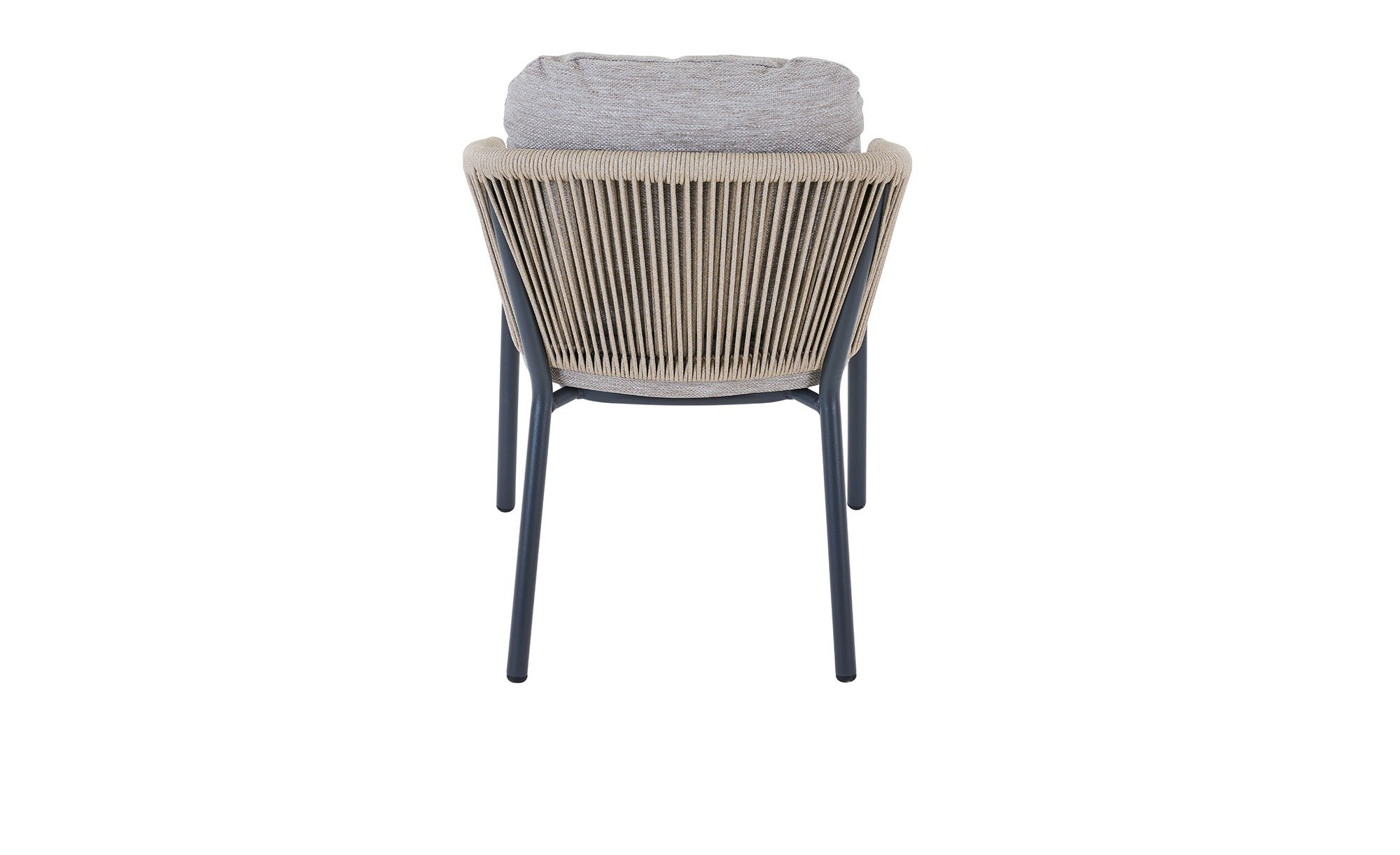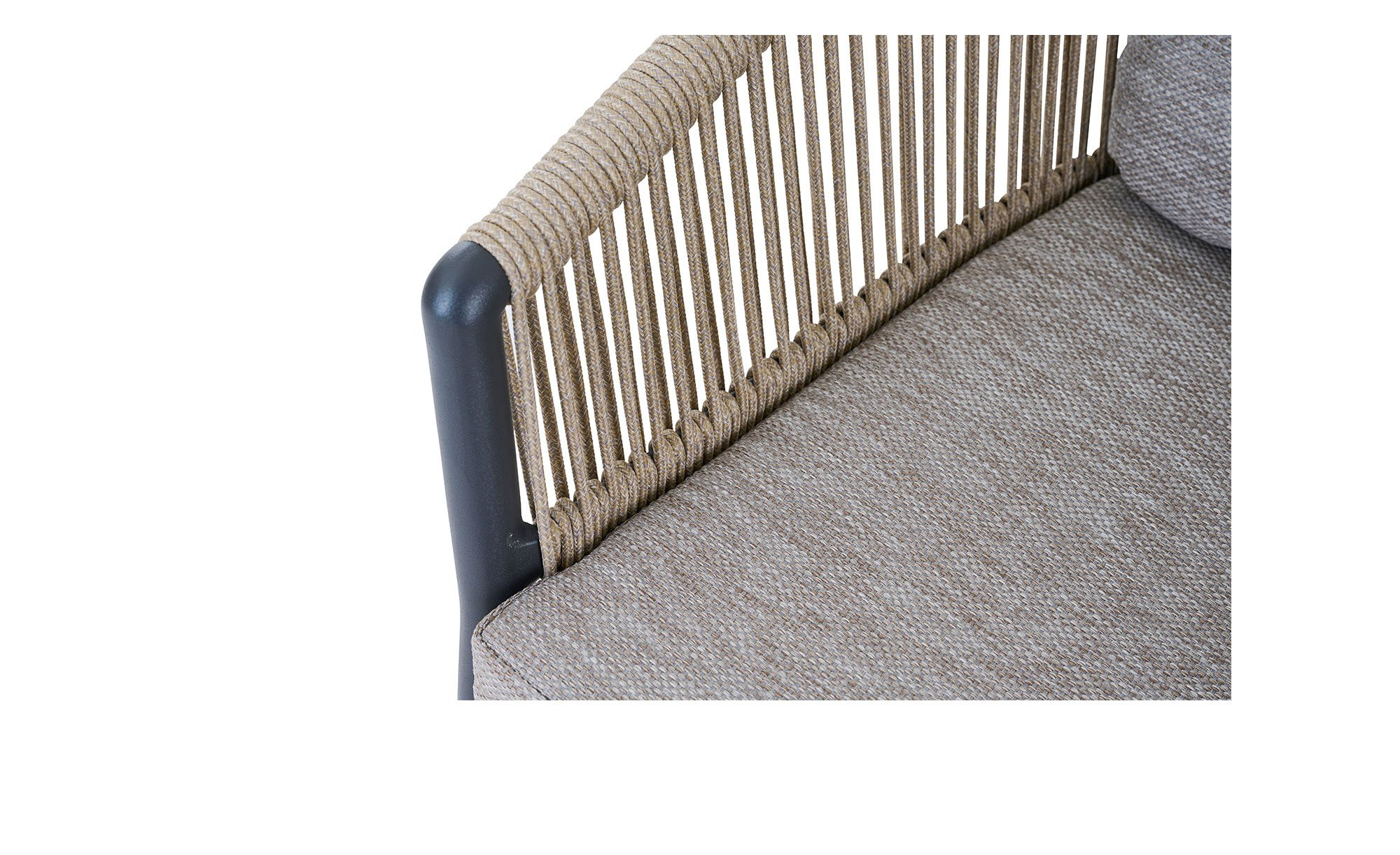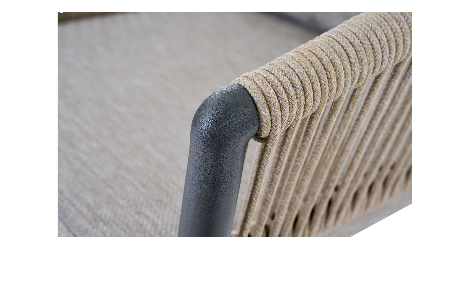 Ein stabiles Aluminiumgestell mit vier Füßen sorgt für sicheren Halt und einen stabilen Stand beim Gartenstuhl MONDO Latea. Es ist in einem matten Anthrazit gehalten und verfügt über eine Pulverbeschichtung. Zusätzlich erwarten Sie am Rücken sowie an den Armlehnen Flächen aus einer gespannten Kordel. Mit ihrem Mix-Taupe-Farbton passt sie ideal zu den ebenfalls im Angebot enthaltenen Auflagen in Taupe.
