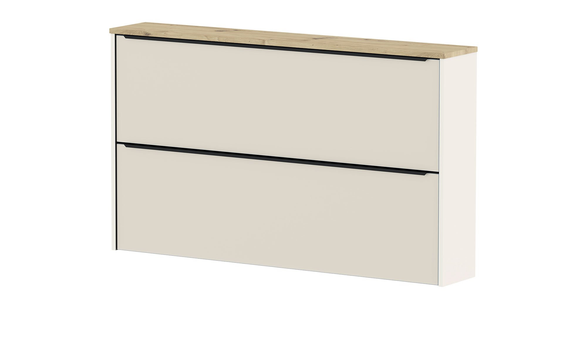 Neben einem MDF-Korpus erwartet Sie bei dem ca. 137 x 80 x 23 cm großen Möbelstück auch eine stilvolle Antifingerprint-Glasfront. Beide Bestandteile sind in einem matten Sand-Ton gestaltet, während die Oberplatte mit ihrer Eiche-Nachbildung einen natürlichen Akzent setzt. Stilvoll wird es hingegen durch die schwarzen Griffleisten aus Aluminium.
