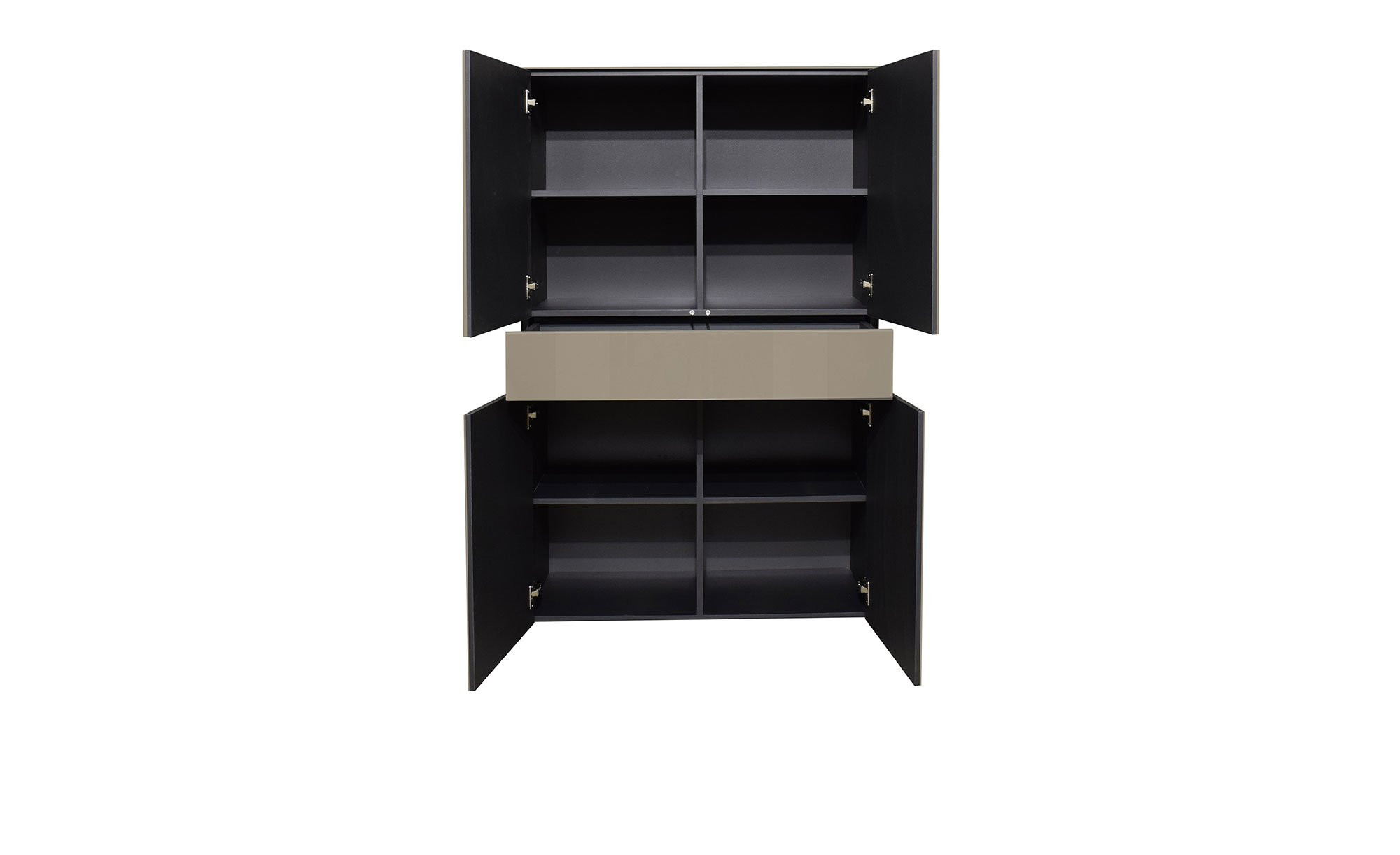 Für Ordnung sorgen vier Türen mit insgesamt vier Einlegeböden sowie zwei zusätzliche Mittelböden. Eine integrierte Schublade mit Soft-Close-Funktion ergänzt das Stauraumangebot. Alle Frontelemente sind mit einer praktischen Push-to-open-Funktion ausgestattet. Schwarze Kunststofffüße sorgen für Stabilität und runden das elegante Design ab.