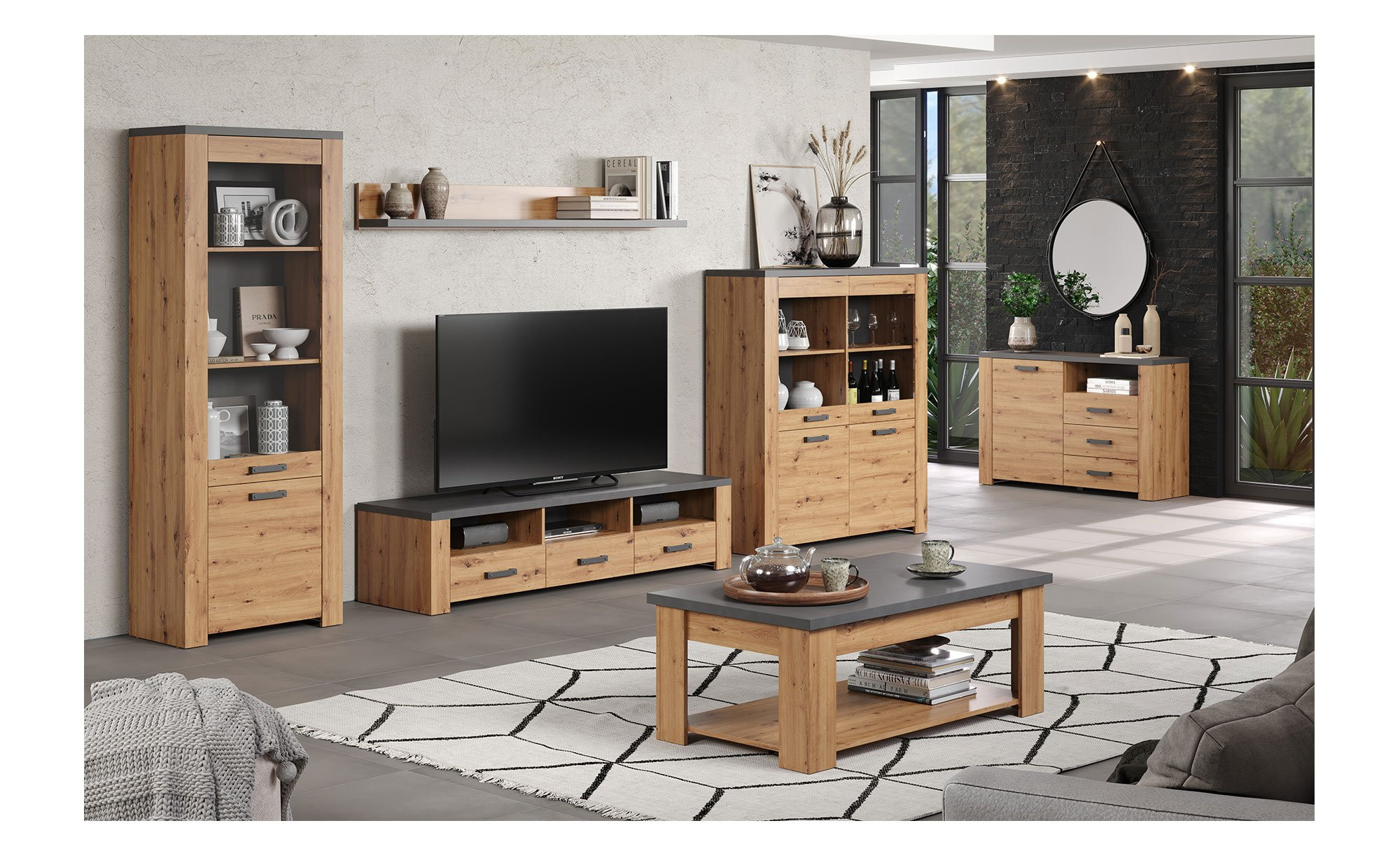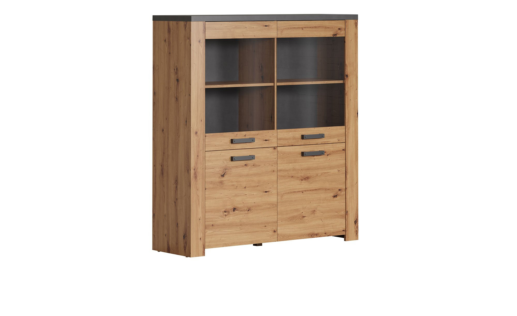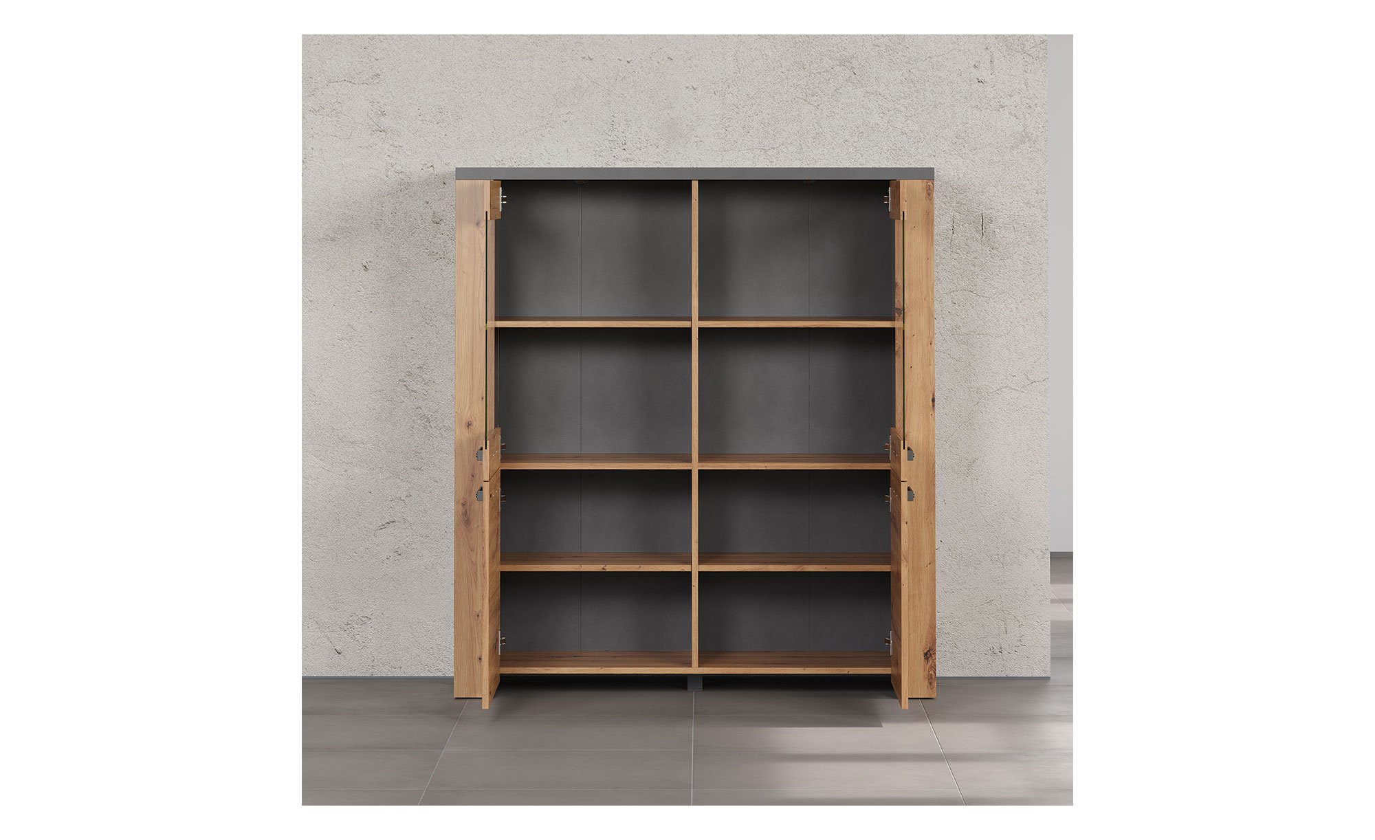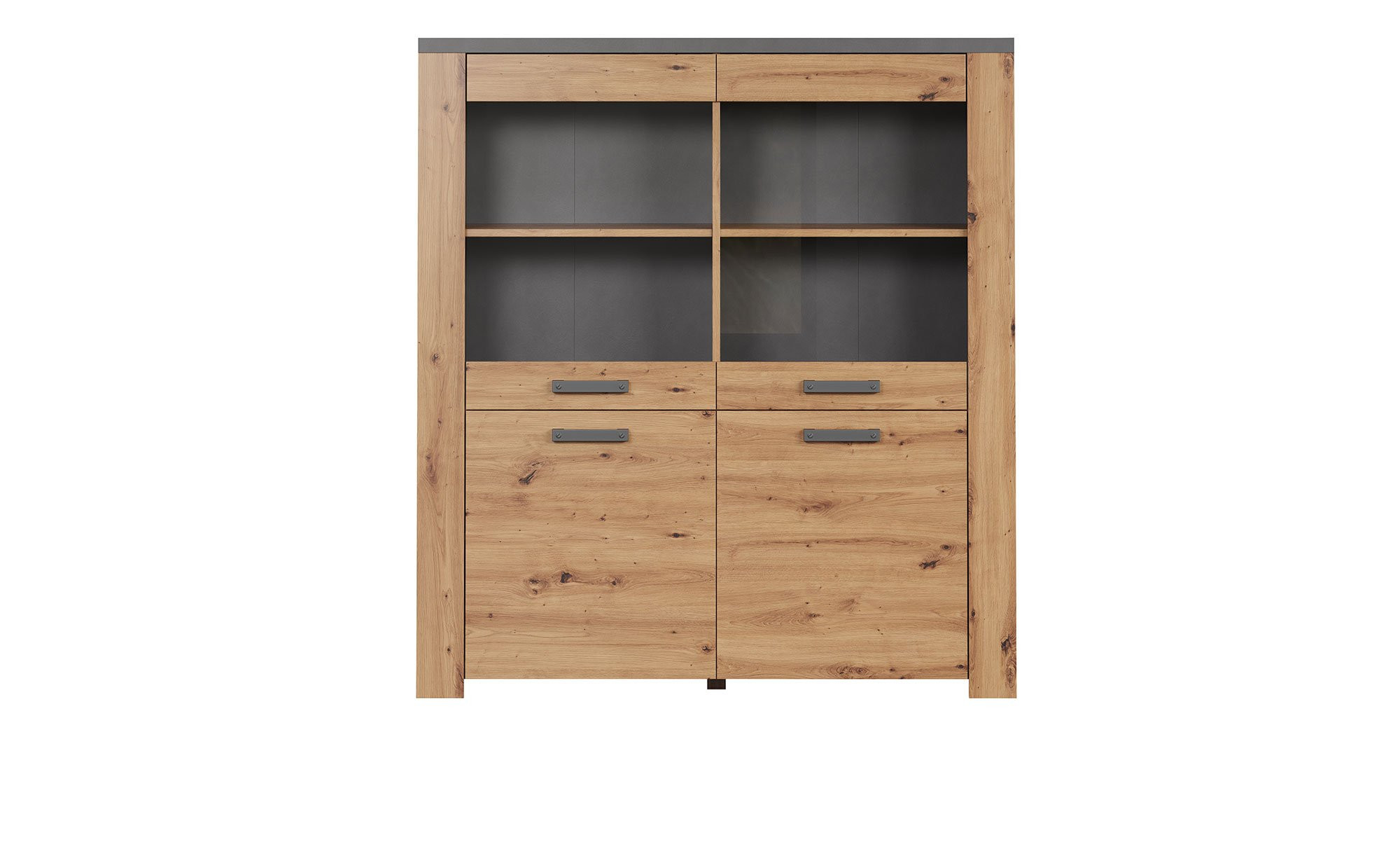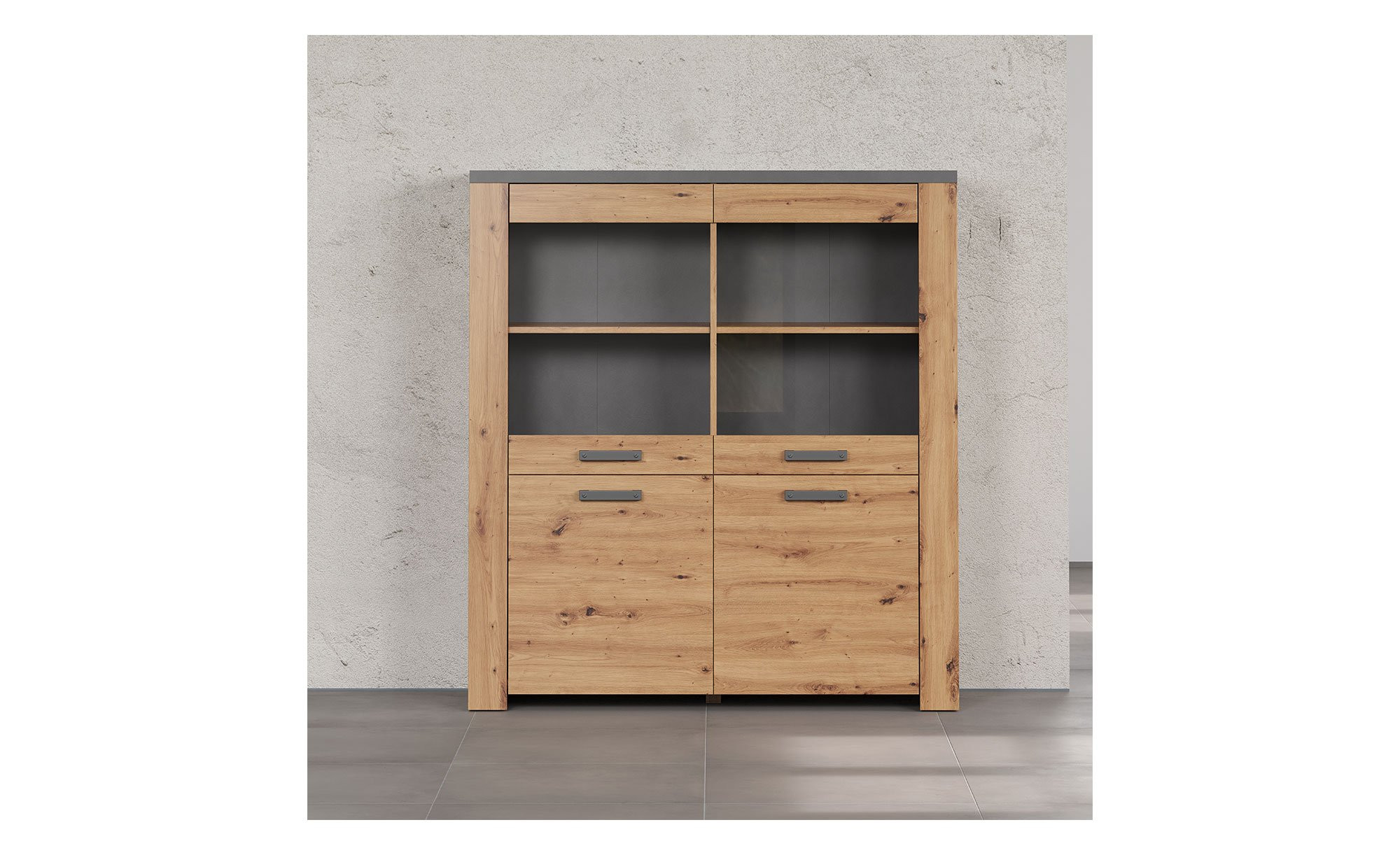 Sowohl der Korpus als auch die Front des ca. 127 x 139 x 40 cm großen Möbels besteht aus Holzwerkstoff. Freuen Sie sich mit Artisan Eiche auf ein natürliches Dekor und den durch die Rückwand und die Absetzung im Ton Grau / Anthrazit Matera entstehenden Kontrast! Auch die grauen Kunststoffgriffe passen hervorragend ins Gesamtbild. Als Schutz vor Verschleiß wurden die Oberflächen mit widerstandsfähigem Melaminharz beschichtet.