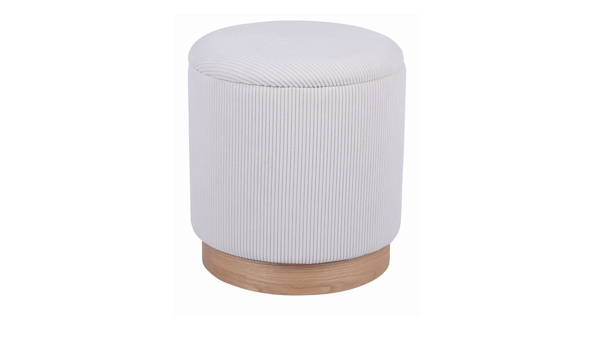 Mit Maßen von ca. 38 x 42 x 38 cm fügt sich das Möbelstück auf platzsparende Weise ins Gesamtbild des dafür vorgesehenen Zimmers. Es besteht aus Holzwerkstoff und MDF in der Farbe Natur und ist großzügig mit einem modernen Cordstoff in Beige aus 100 % Polyester bezogen.