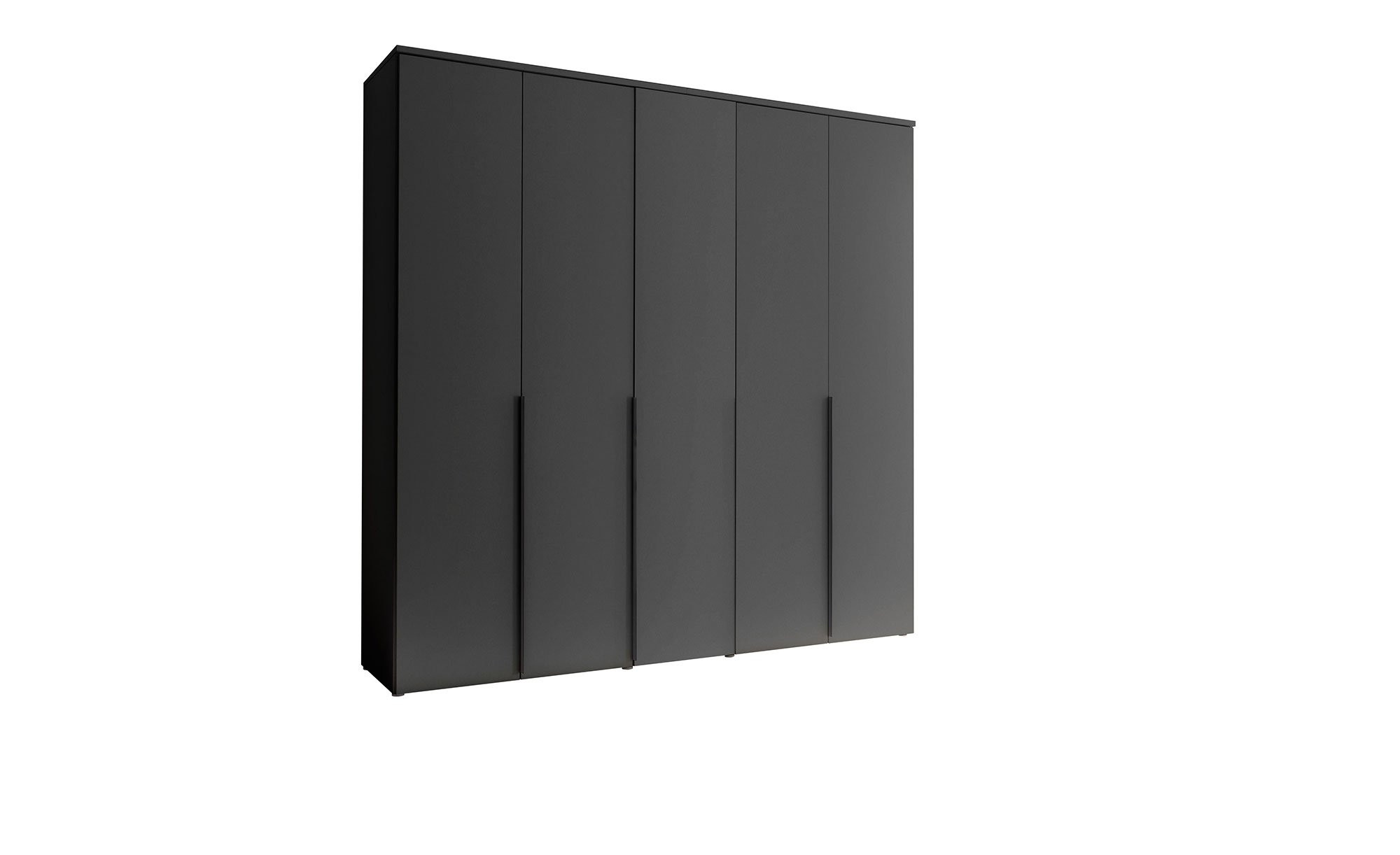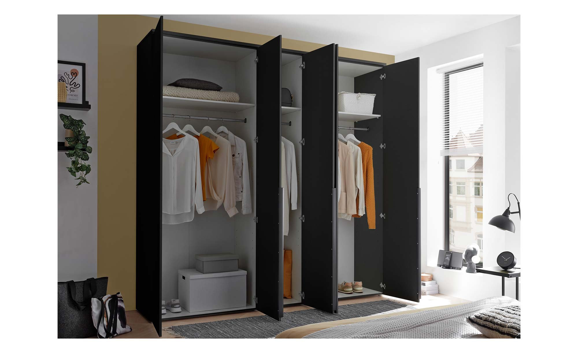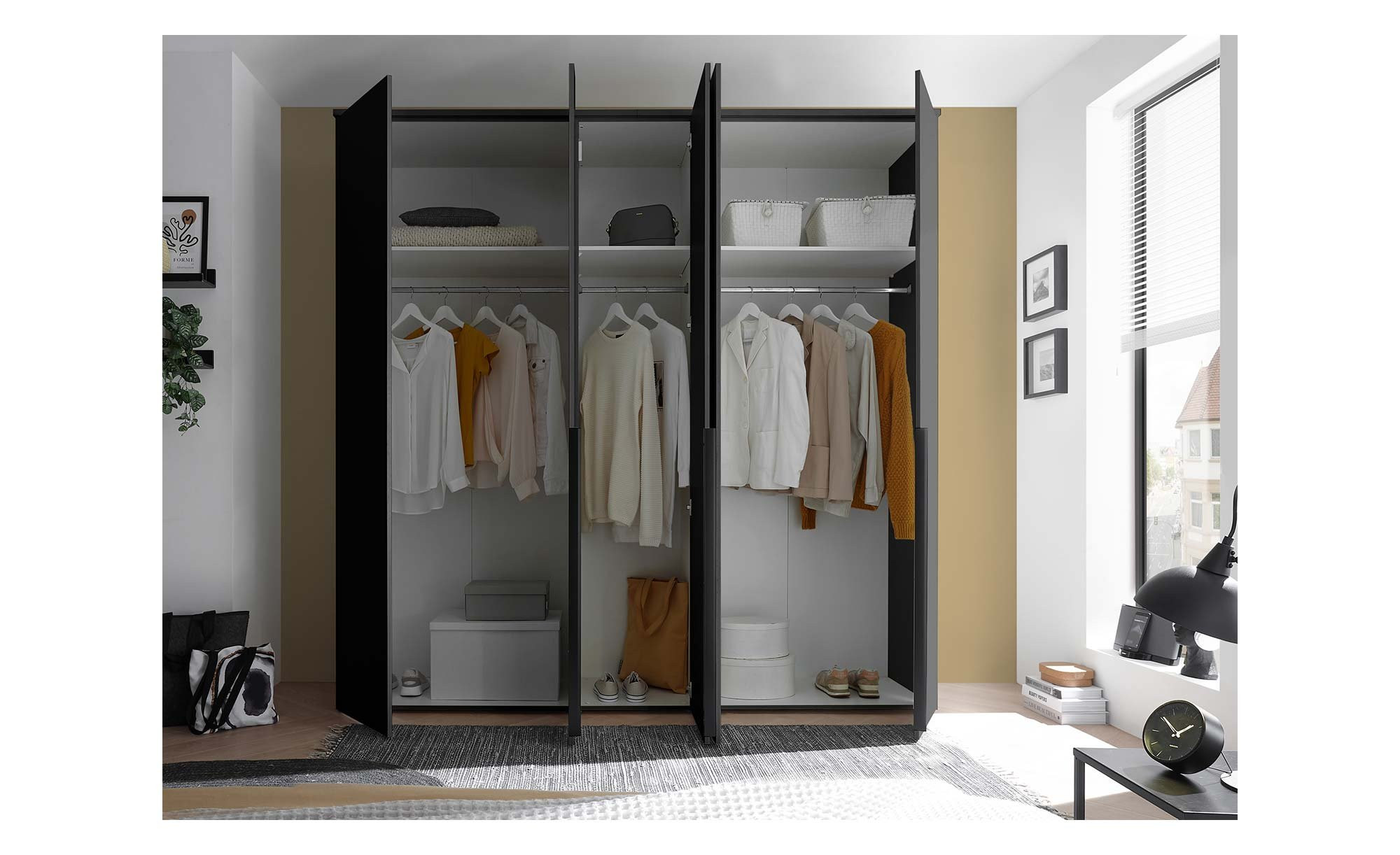 Ein stilvolles Graphit schmückt sowohl den Korpus als auch die Front des Möbelstücks. Dieses wurde aus Holzwerkstoff gefertigt und ist ca. 225 x 225 x 52 cm groß. Während das Innendekor in Weiß gehalten ist, fügen sich die schwarzen Füße und Kunststoffgriffe edel ins Bild.