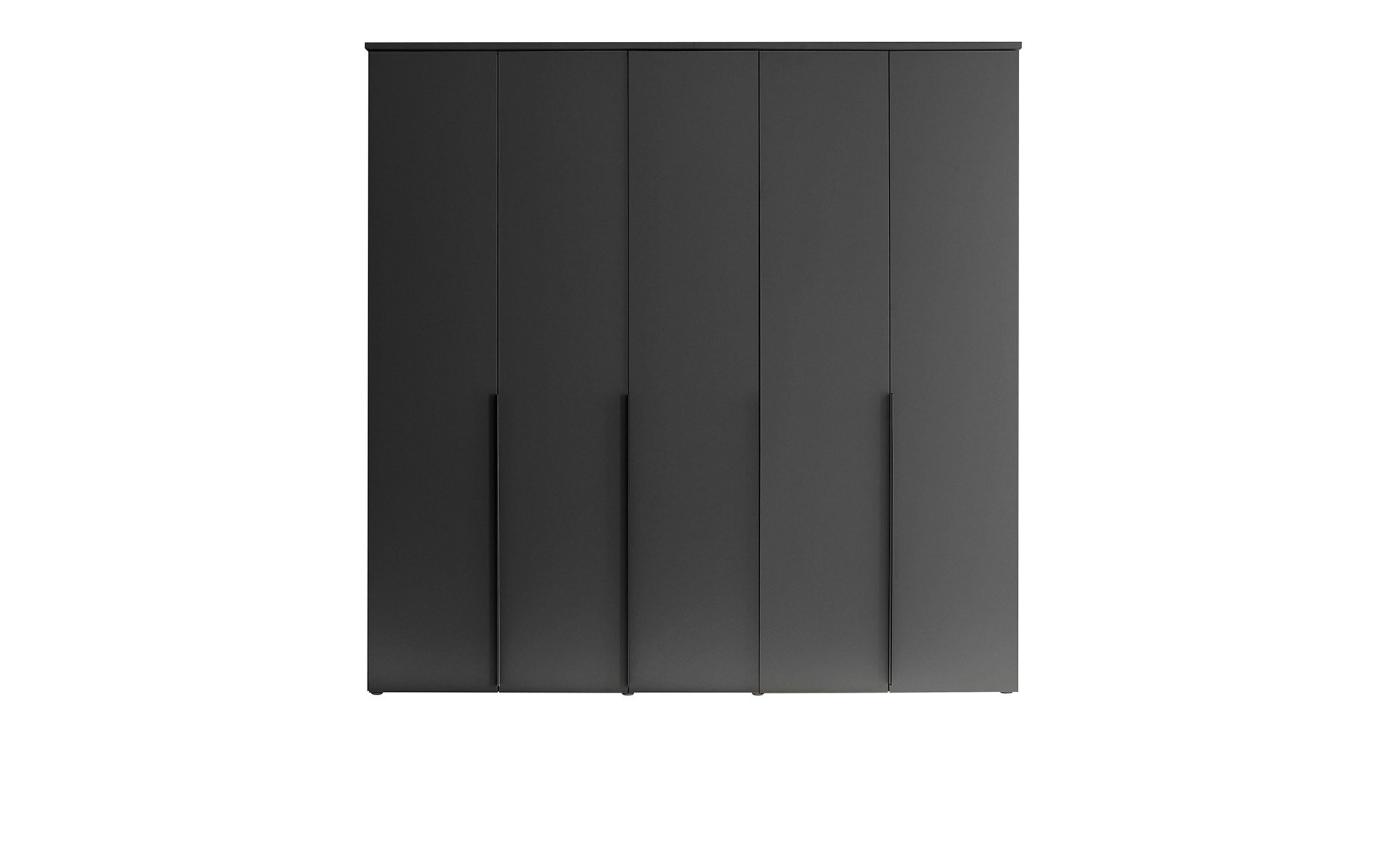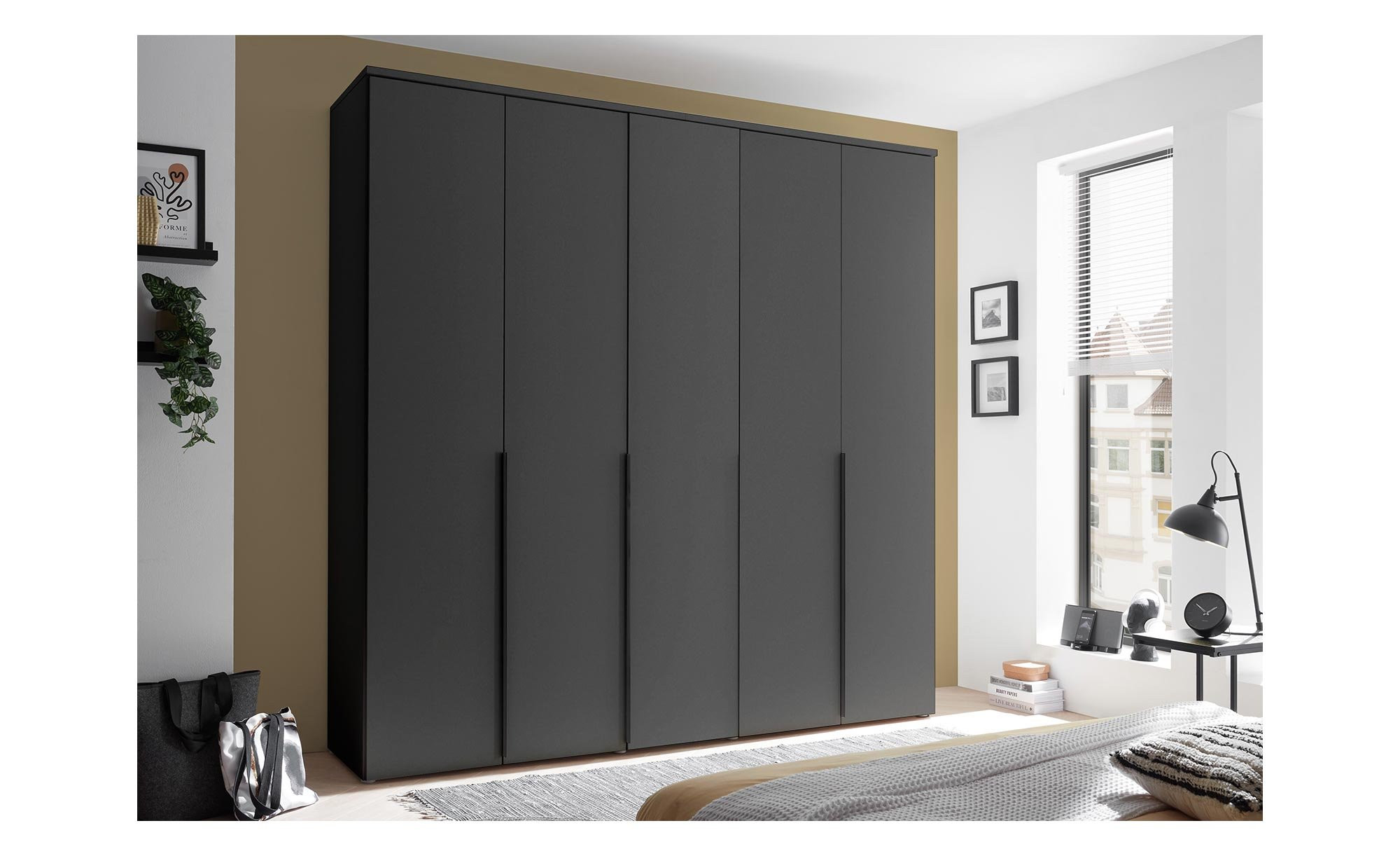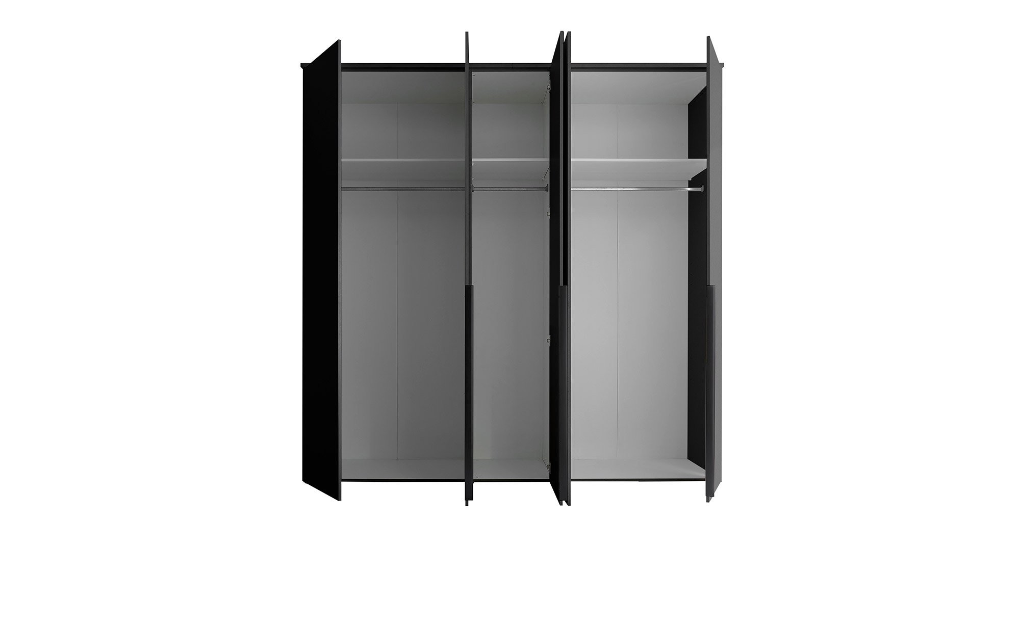 Ein stilvolles Graphit schmückt sowohl den Korpus als auch die Front des Möbelstücks. Dieses wurde aus Holzwerkstoff gefertigt und ist ca. 225 x 225 x 52 cm groß. Während das Innendekor in Weiß gehalten ist, fügen sich die schwarzen Füße und Kunststoffgriffe edel ins Bild.