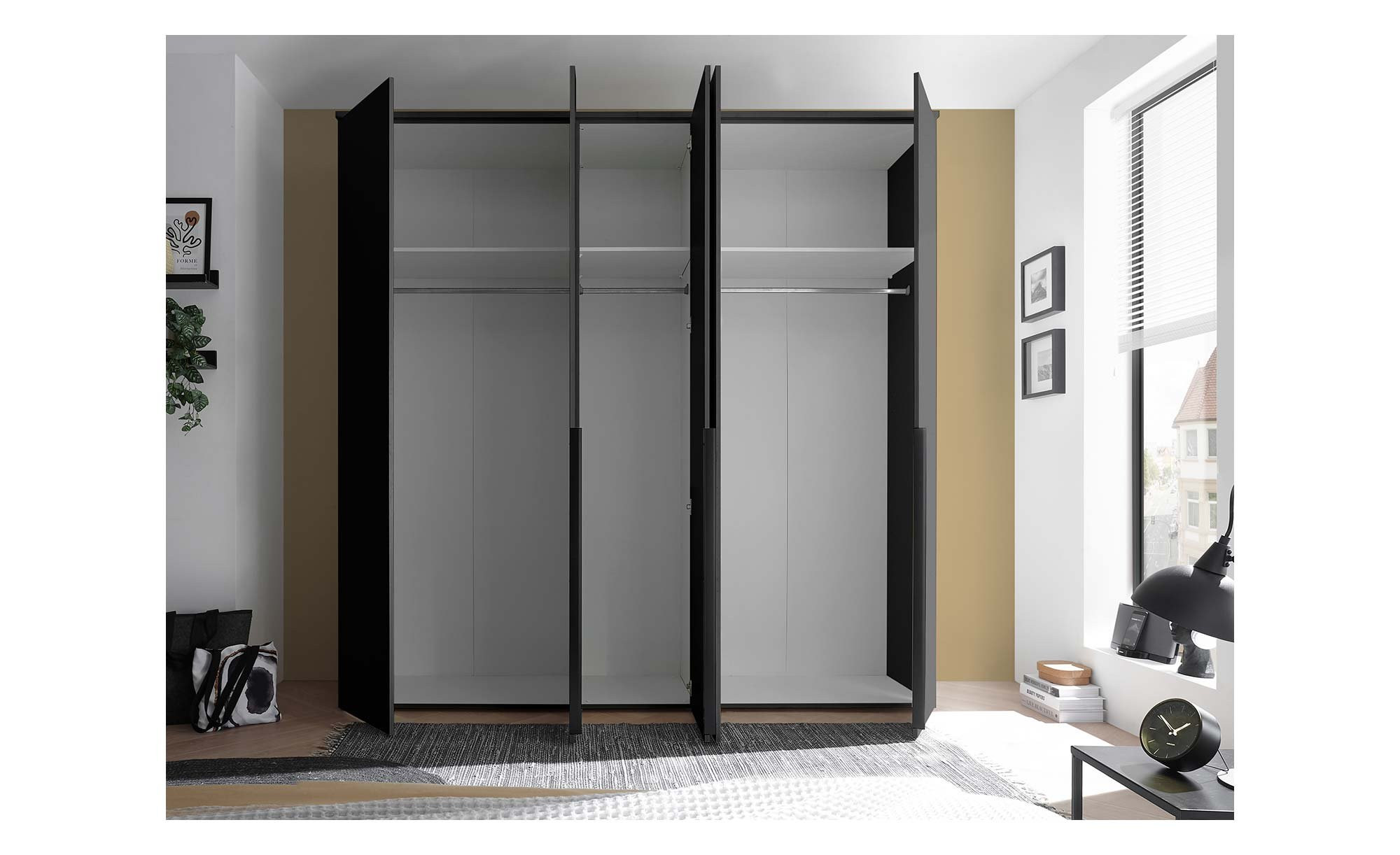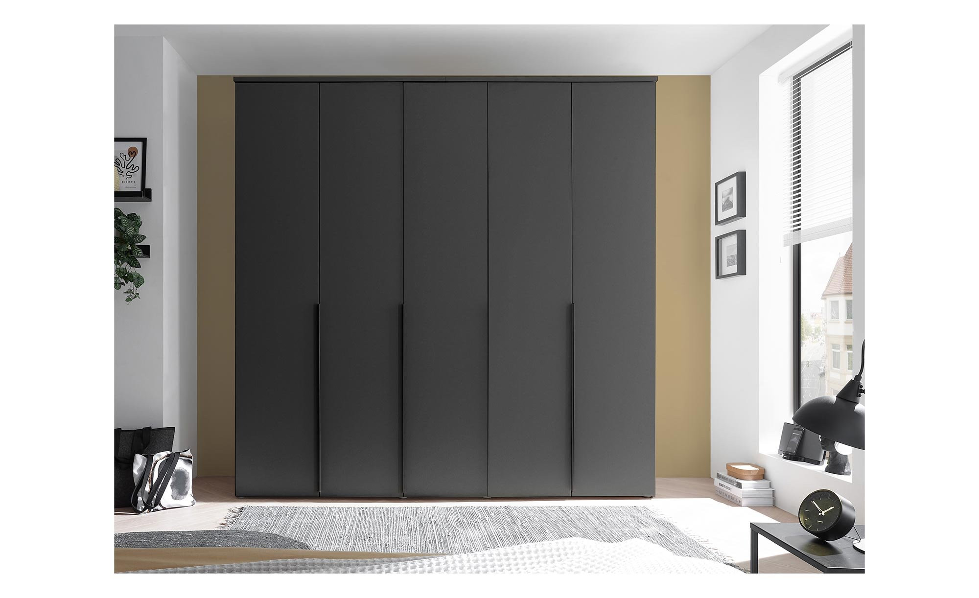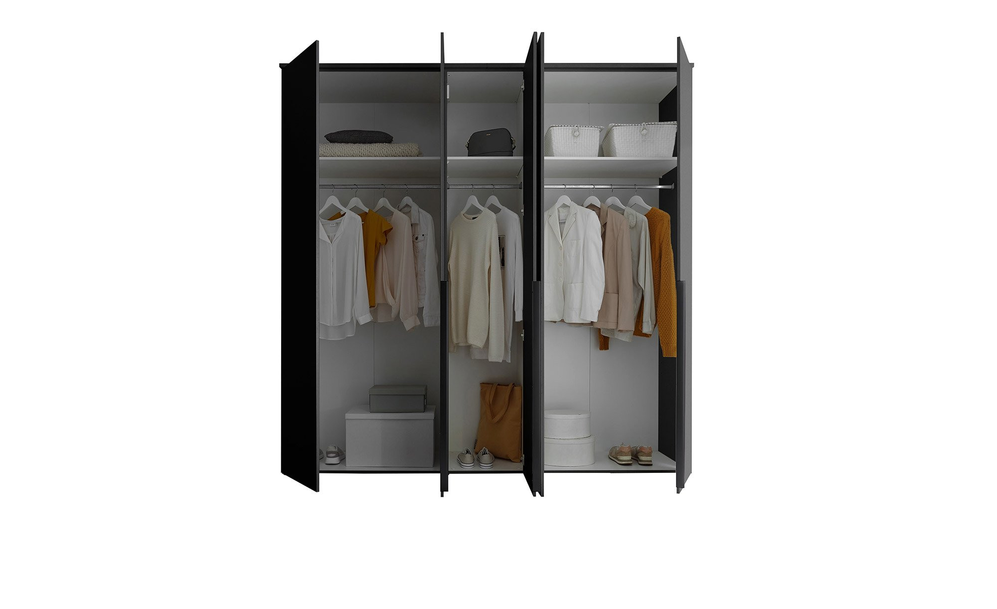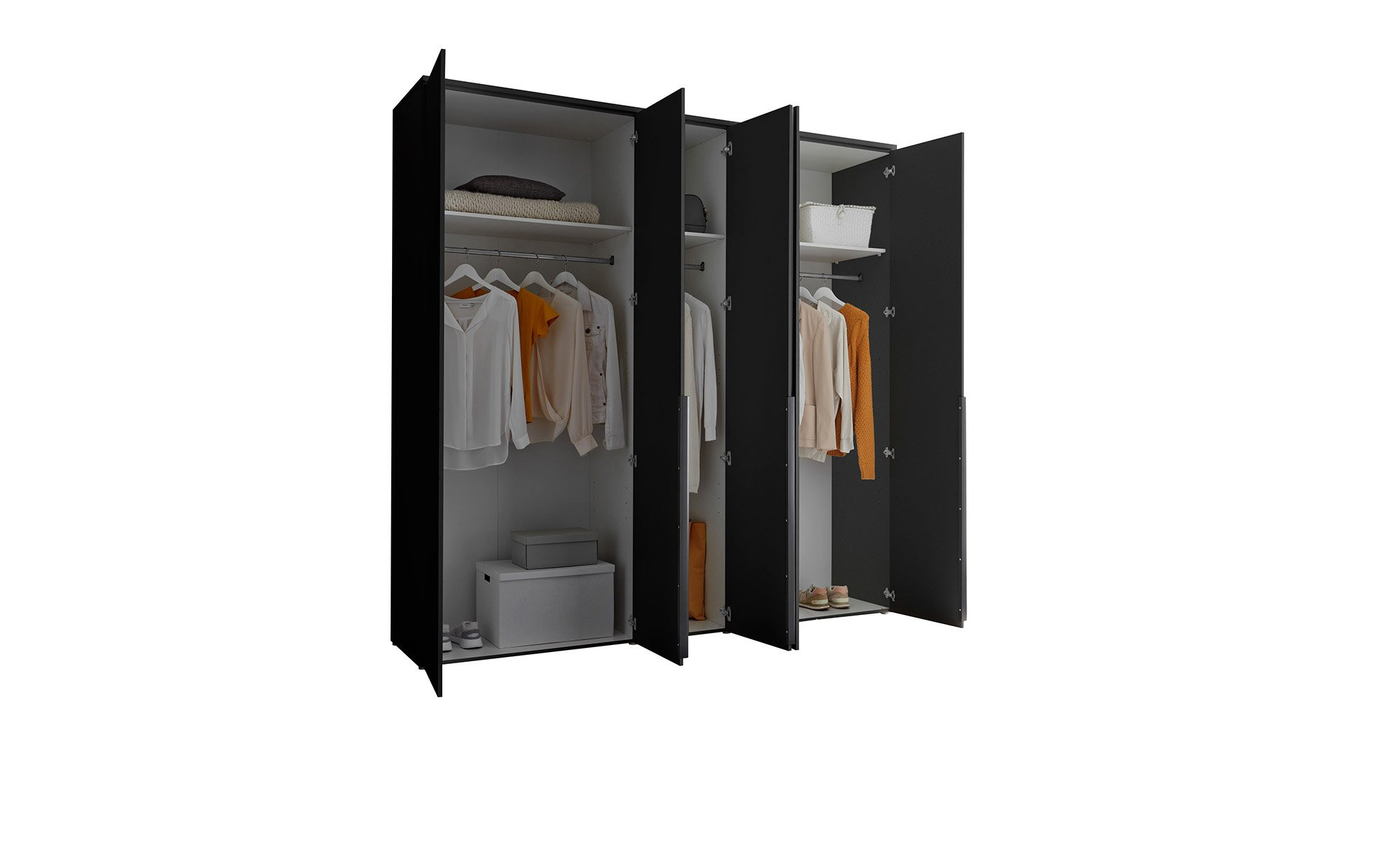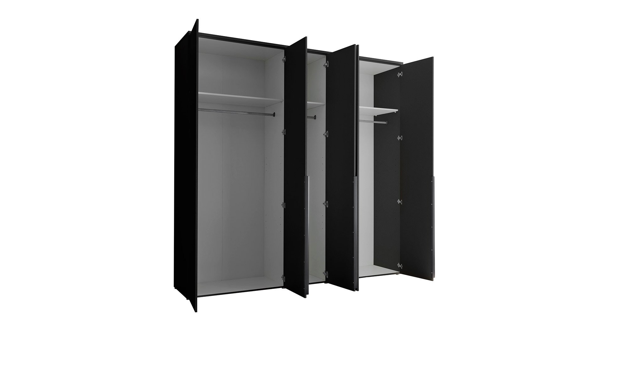 Der Artikel besteht aus zwei Mittelseiten und ist mit fünf links- bzw. rechtsseitig angeschlagenen Drehtüren ausgestattet. Sein Innenbereich besteht aus drei Elementen mit jeweils einem Fachboden und einer Kleiderstange. Sie dürfen sich also auf jede Menge Stauraum freuen!