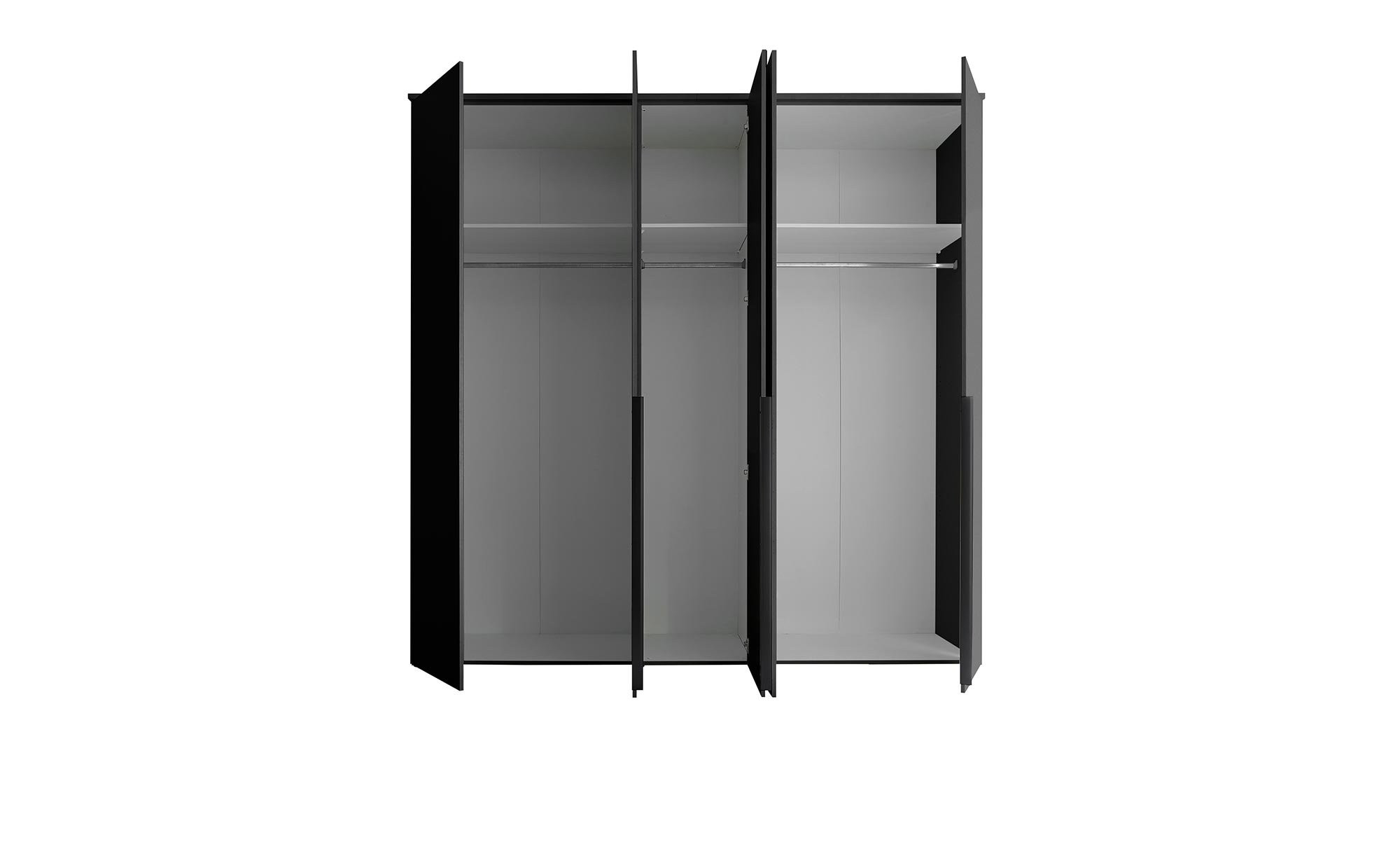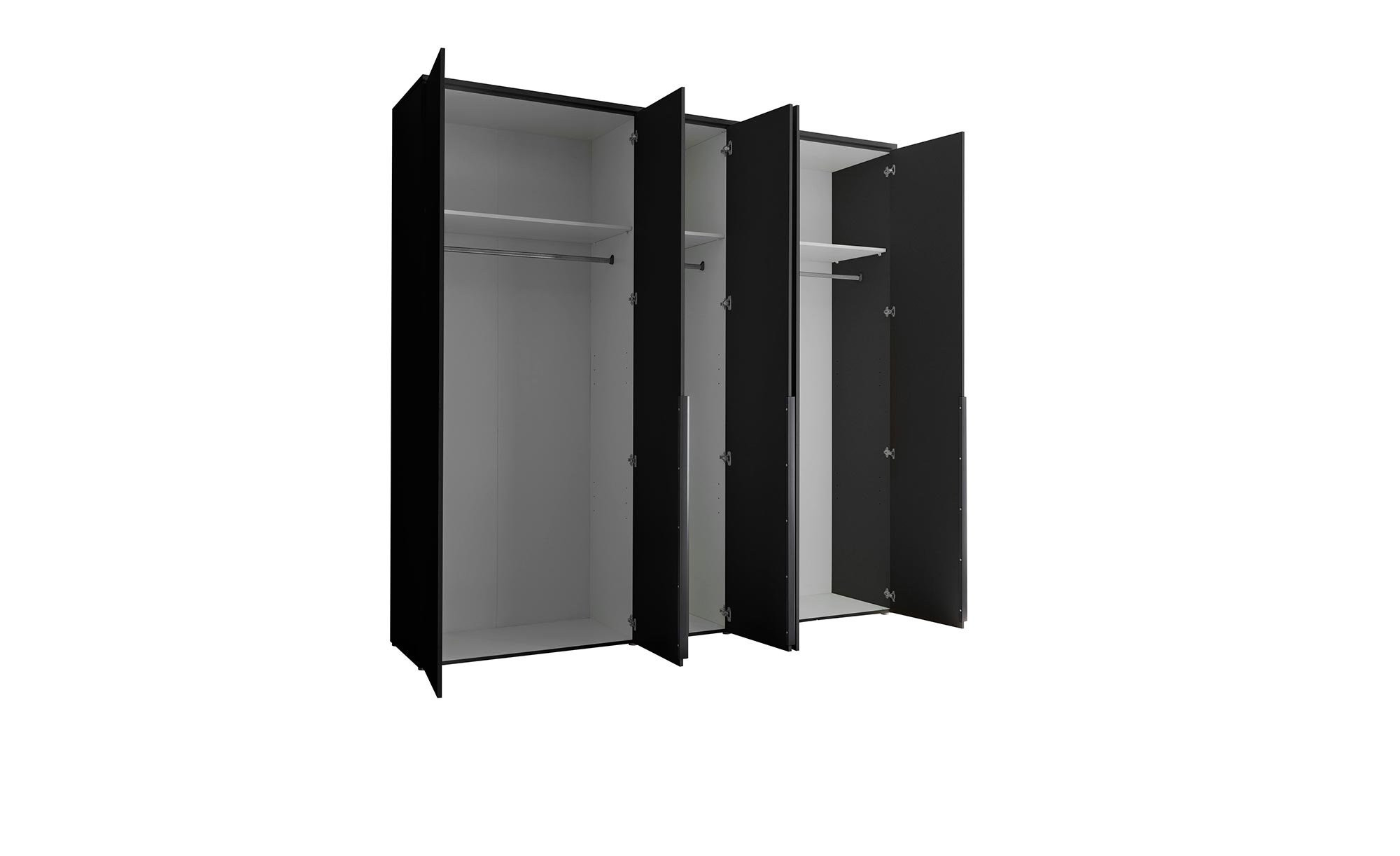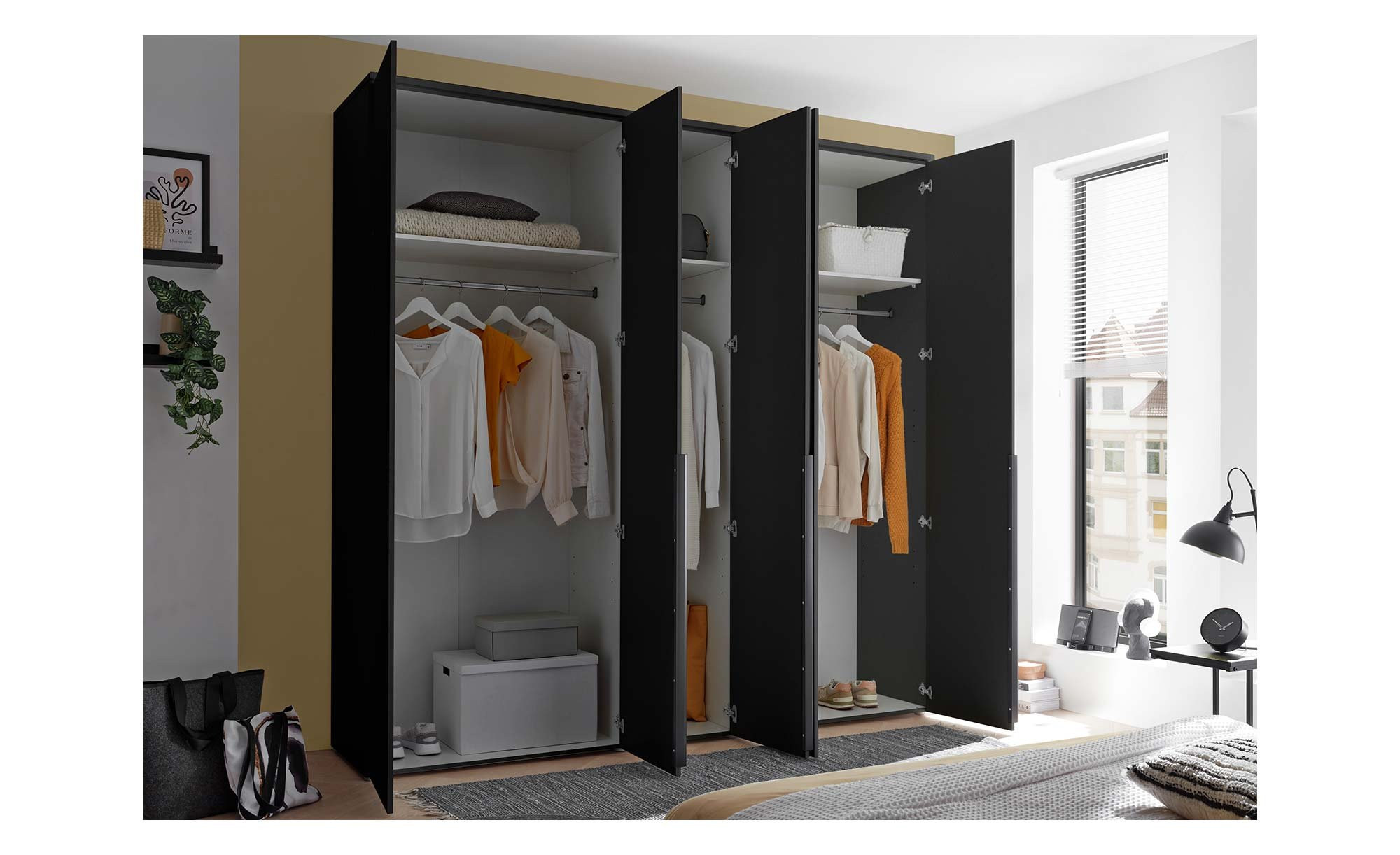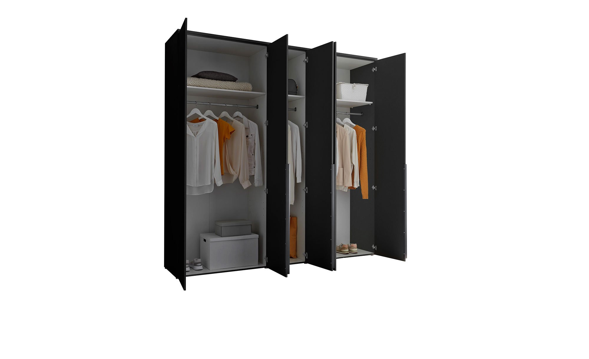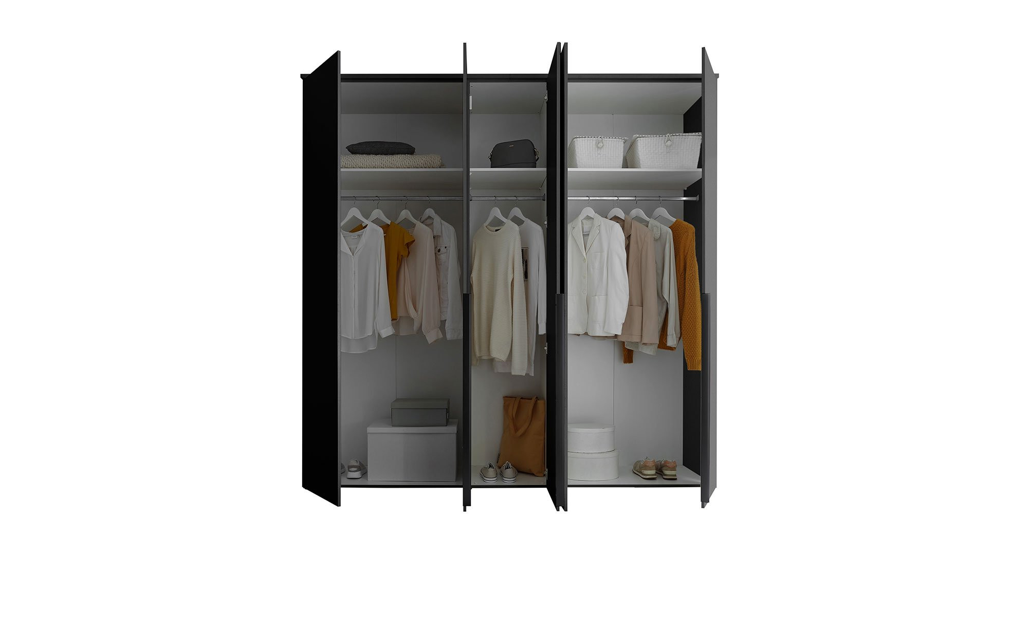 Zu dem 5-türigen Schrank gehört neben vier Holztüren auch eine mittig angebrachte Spiegeltür. Dahinter empfangen Sie zum Verstauen Ihrer Garderobe drei Böden und drei Kleiderstangen.