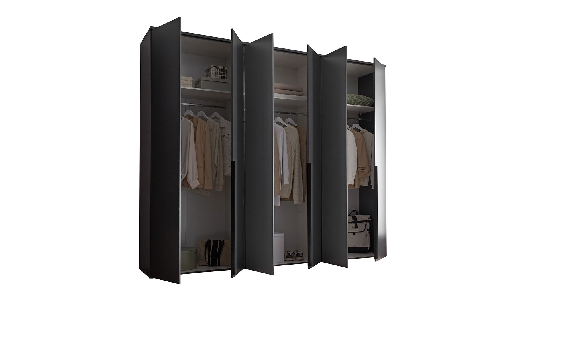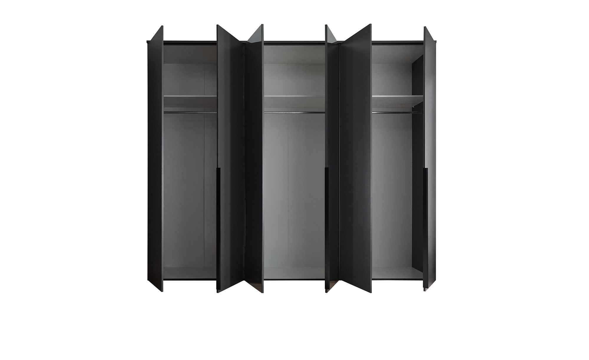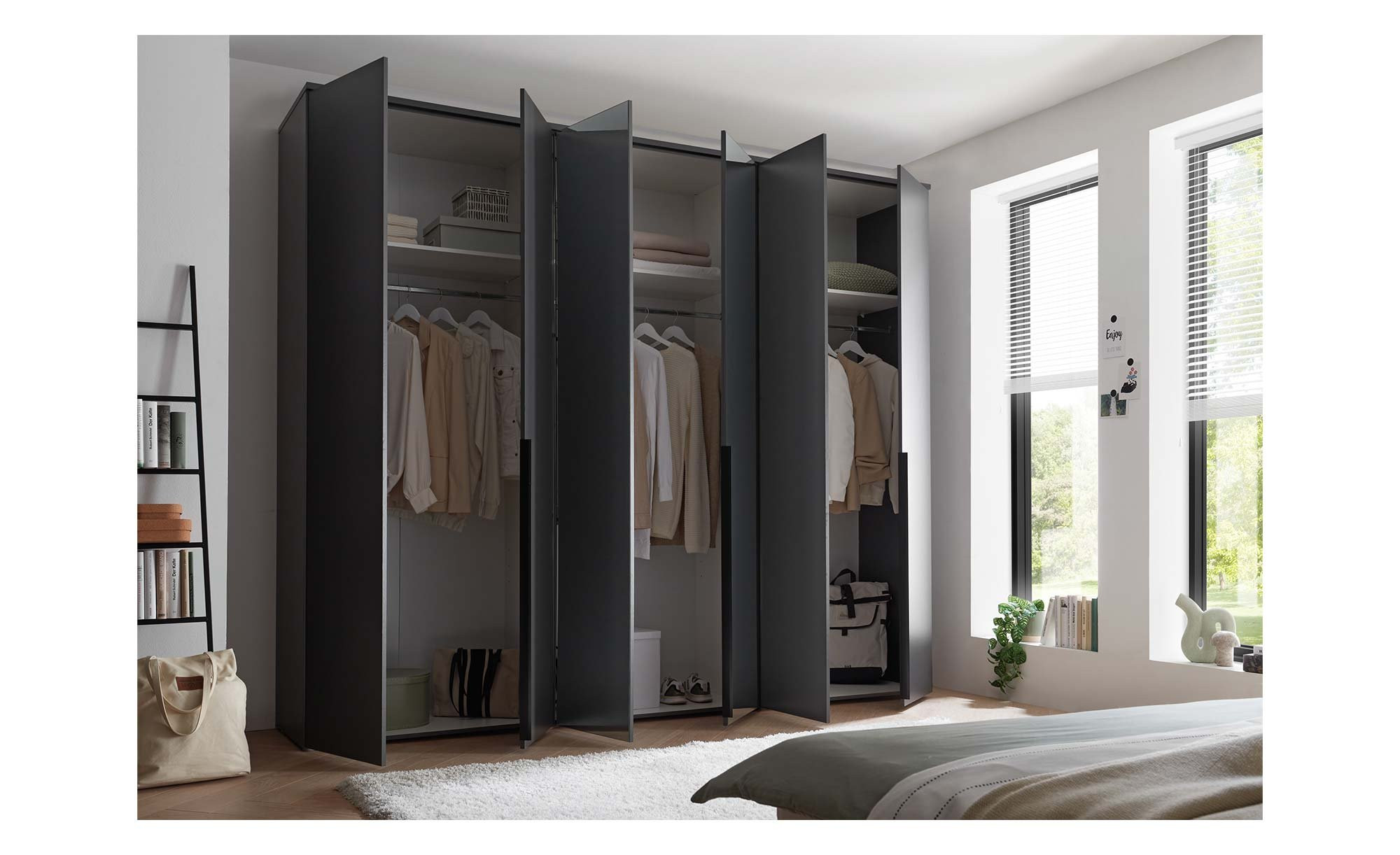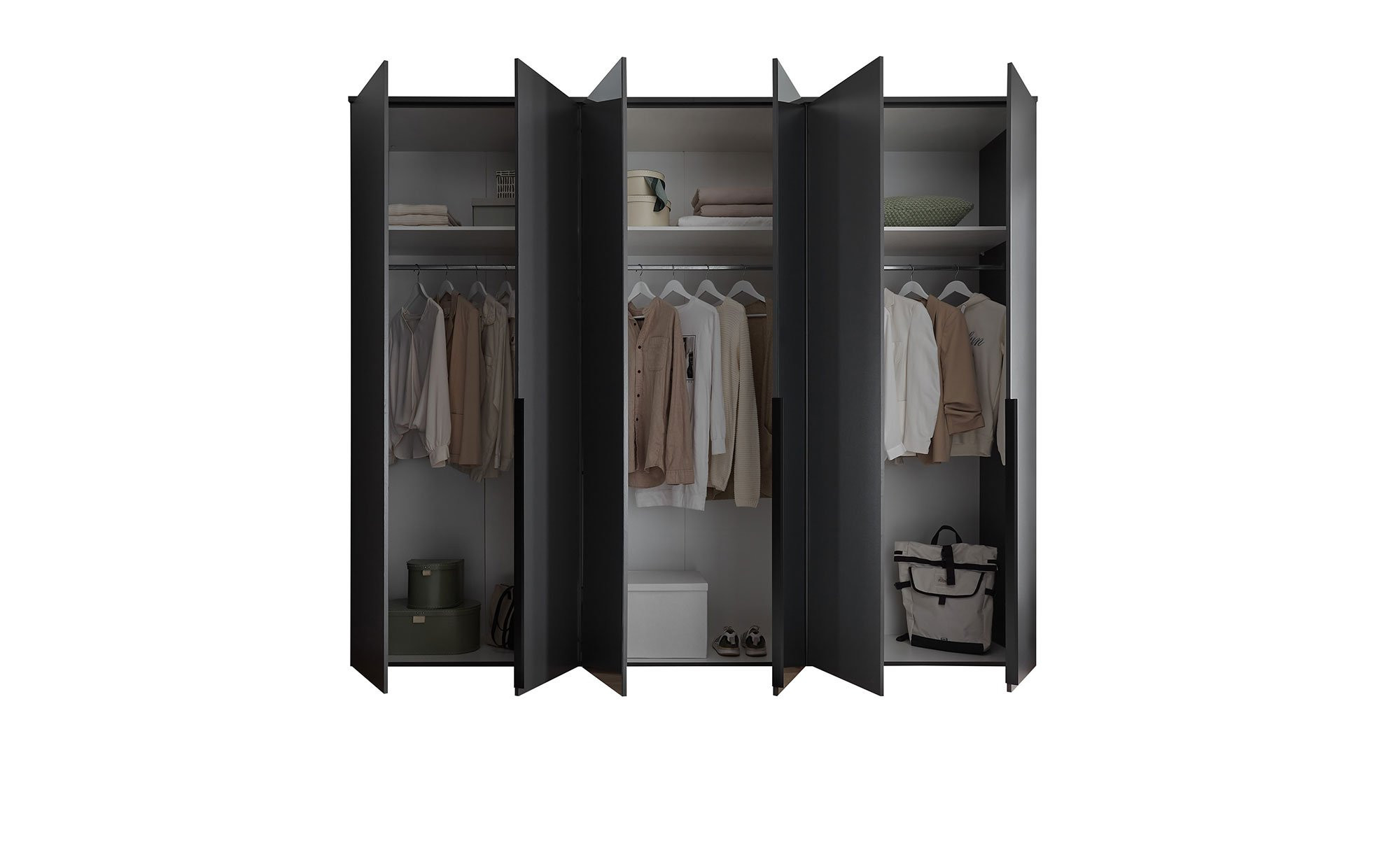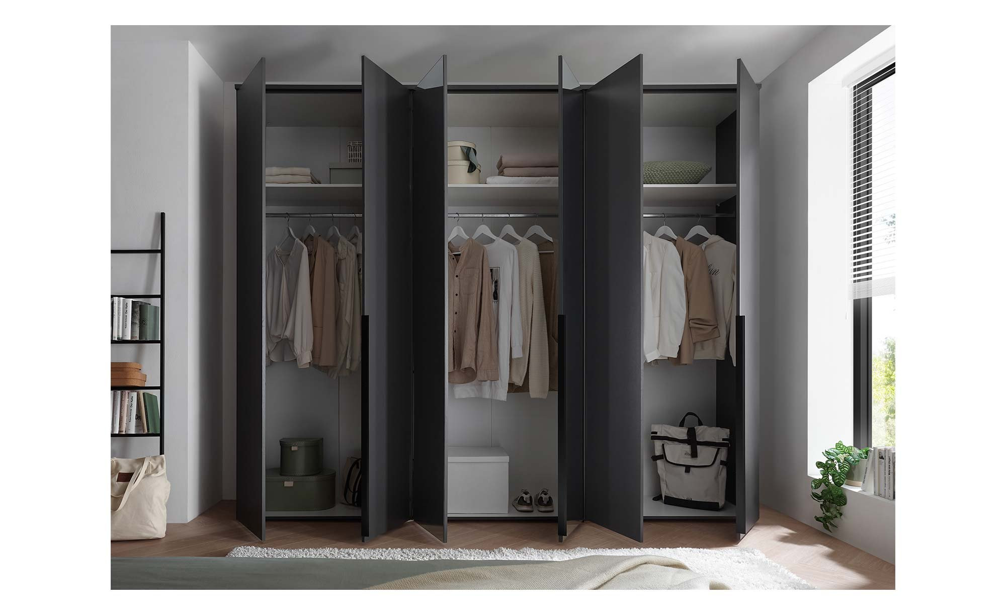 Der Artikel mit Maßen von ca. 270 x 225 x 52 cm wurde aus Holzwerkstoff hergestellt und ist in der Farbe Graphit gehalten. Zu diesem Ton passen die Kunststoffgriffe und Füße in Schwarz hervorragend, aber auch das weiße Innendekor trägt zum ansprechenden Gesamtbild bei.