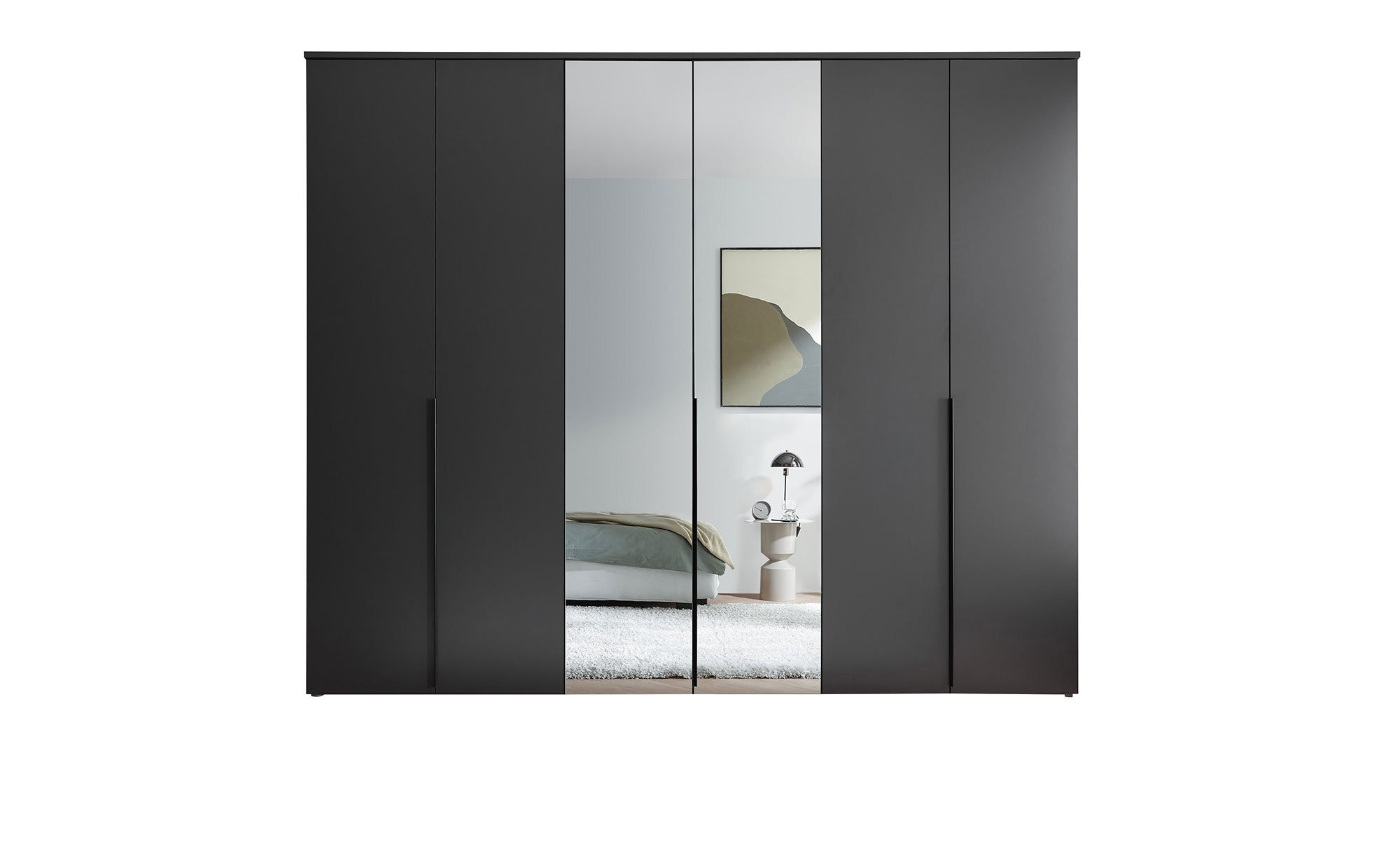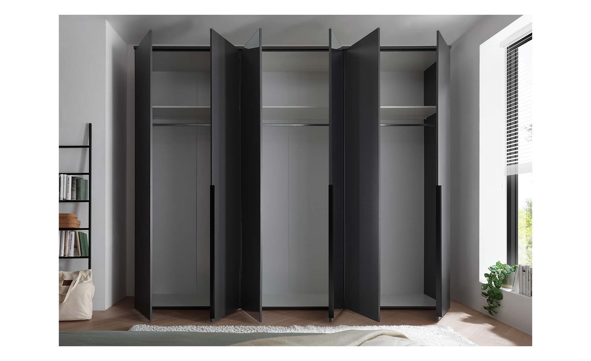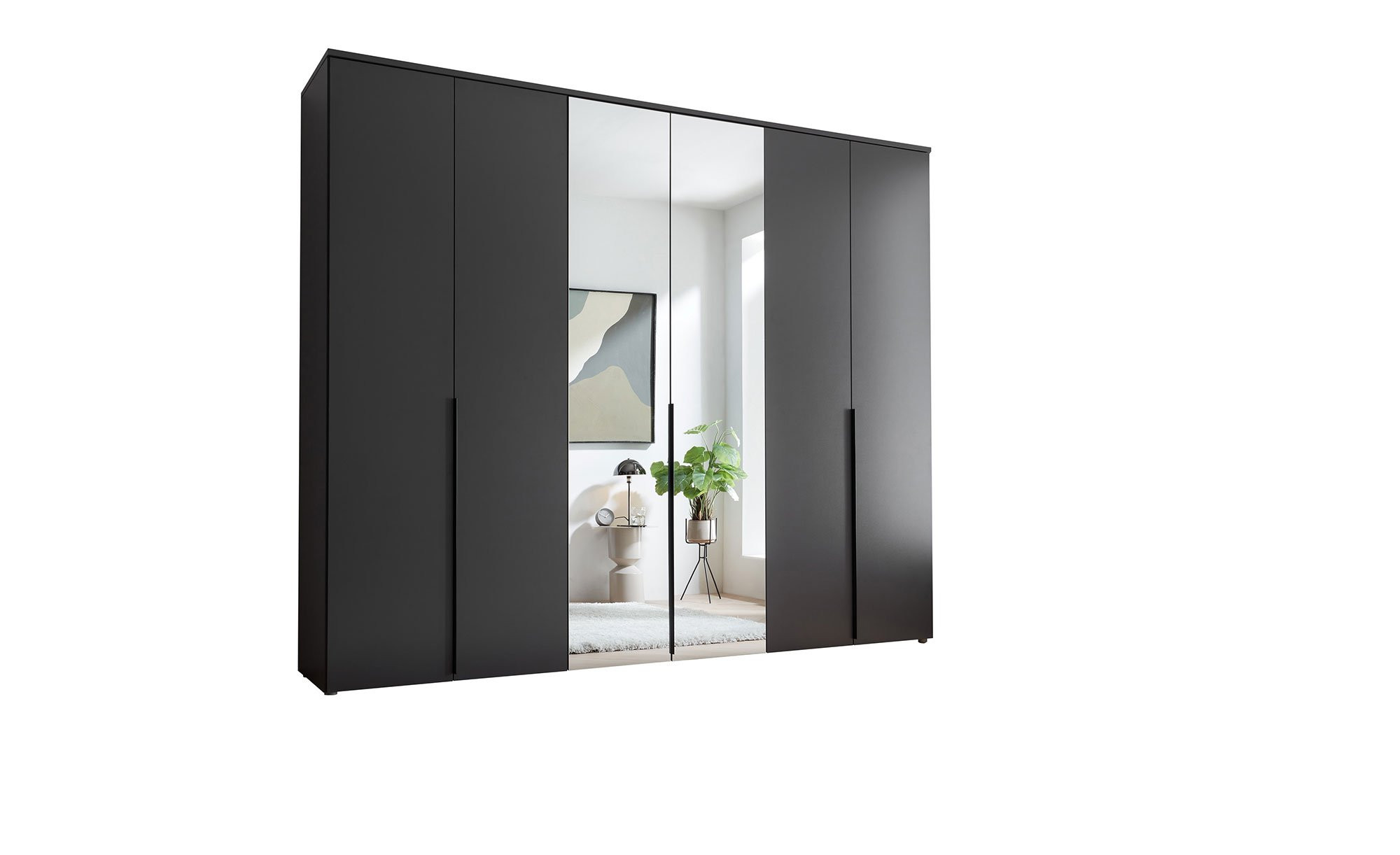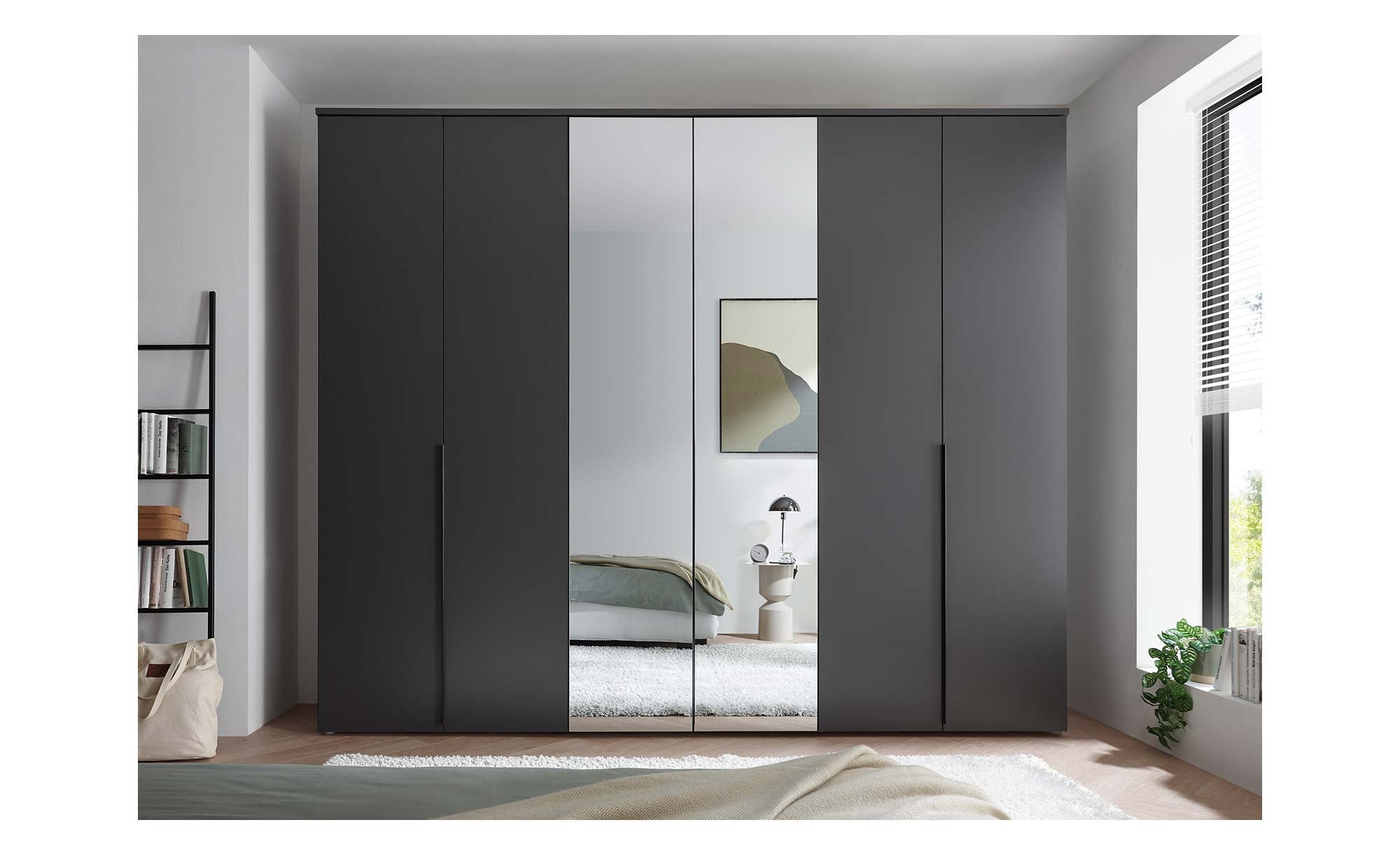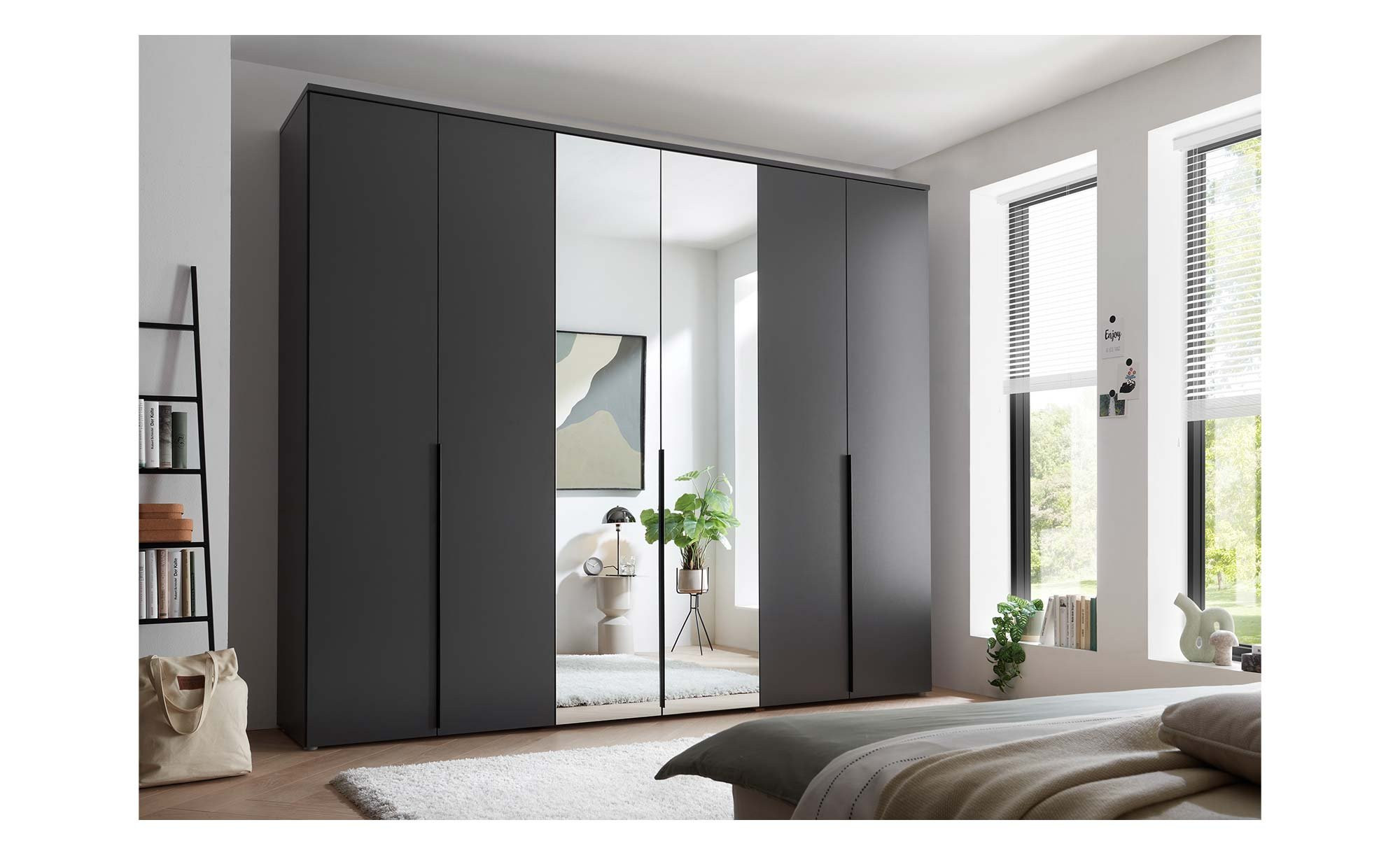 Der Artikel mit Maßen von ca. 270 x 225 x 52 cm wurde aus Holzwerkstoff hergestellt und ist in der Farbe Graphit gehalten. Zu diesem Ton passen die Kunststoffgriffe und Füße in Schwarz hervorragend, aber auch das weiße Innendekor trägt zum ansprechenden Gesamtbild bei.