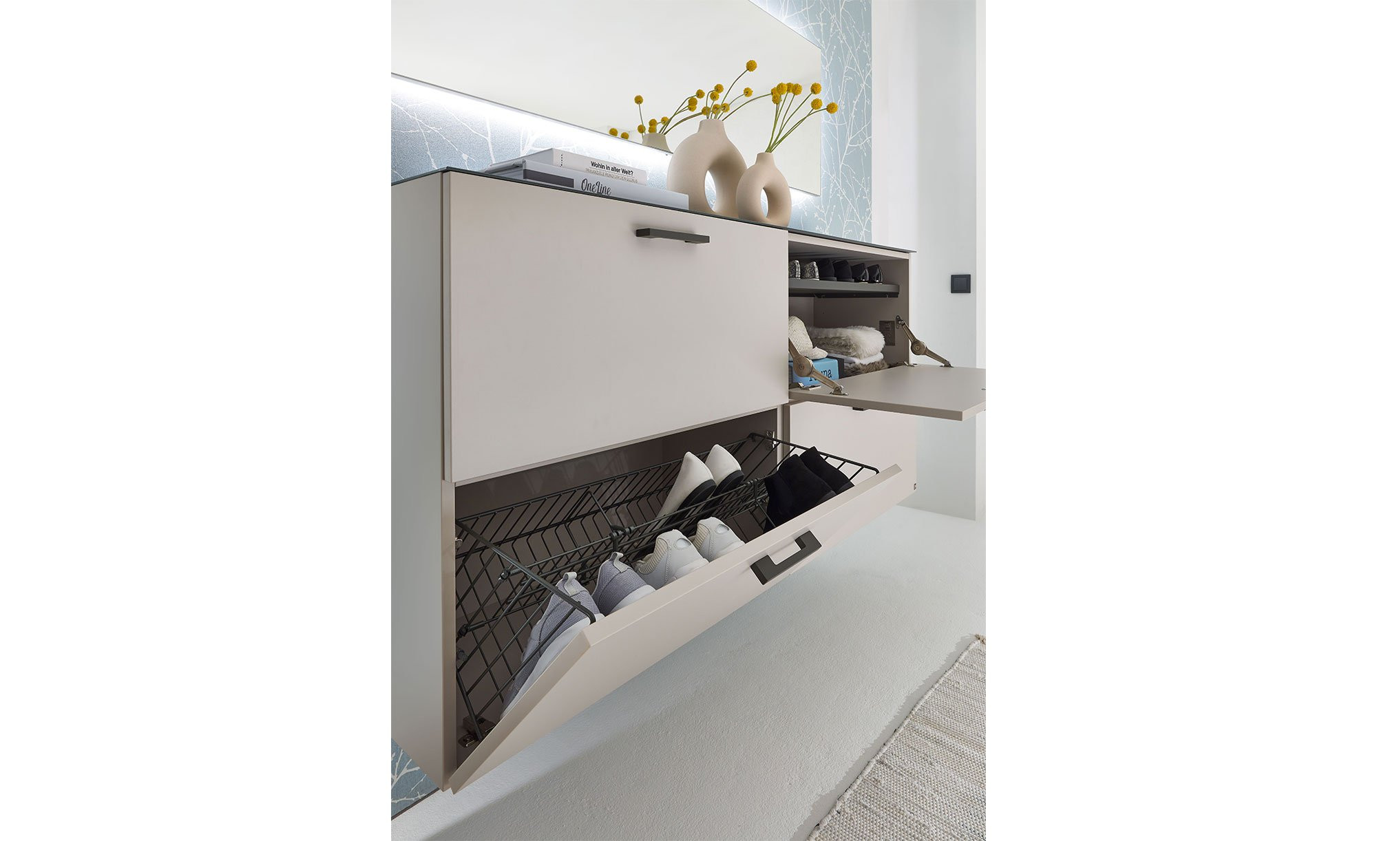 Schwarze Kunststofffüße und anthrazitfarbene Metallgriffe sowie Haken fügen sich stimmig ins Bild und sorgen gemeinsam mit den drei Böden und vier Klappen der Garderobe für praktischen Stauraum. Das Set beinhaltet unter anderem ein Hängepaneel mit Beleuchtung, Kleiderstange und Hutablage, eine Sitzbank mit Holzboden und Sitzpolster aus Webstoff in Anthrazit, einen beleuchteten Hängespiegel und einen Schrank mit Klappen, Drahtkörben und Metallböden. Letzterer verfügt zudem über eine stilvolle Glasabdeckplatte, die in Felsgrau hinterlackiert ist.