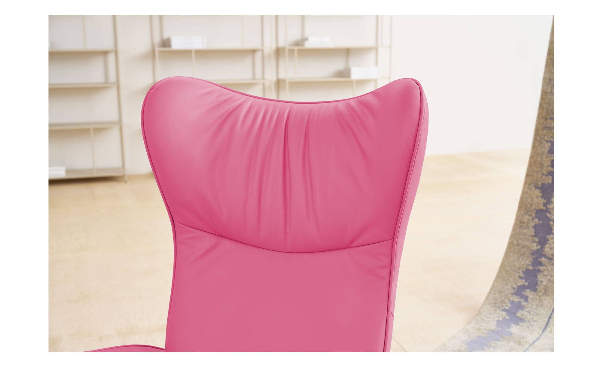 Ein Bezug aus echtem Leder in auffälligem Pink umspannt das ca. 78 x 120 x 89 cm große Möbelstück. Dank des echten Rückens eröffnen sich Ihnen auch zahlreiche Möglichkeiten zum Stellen. Der Metallfuß überzeugt in stilvollem Anthrazit.