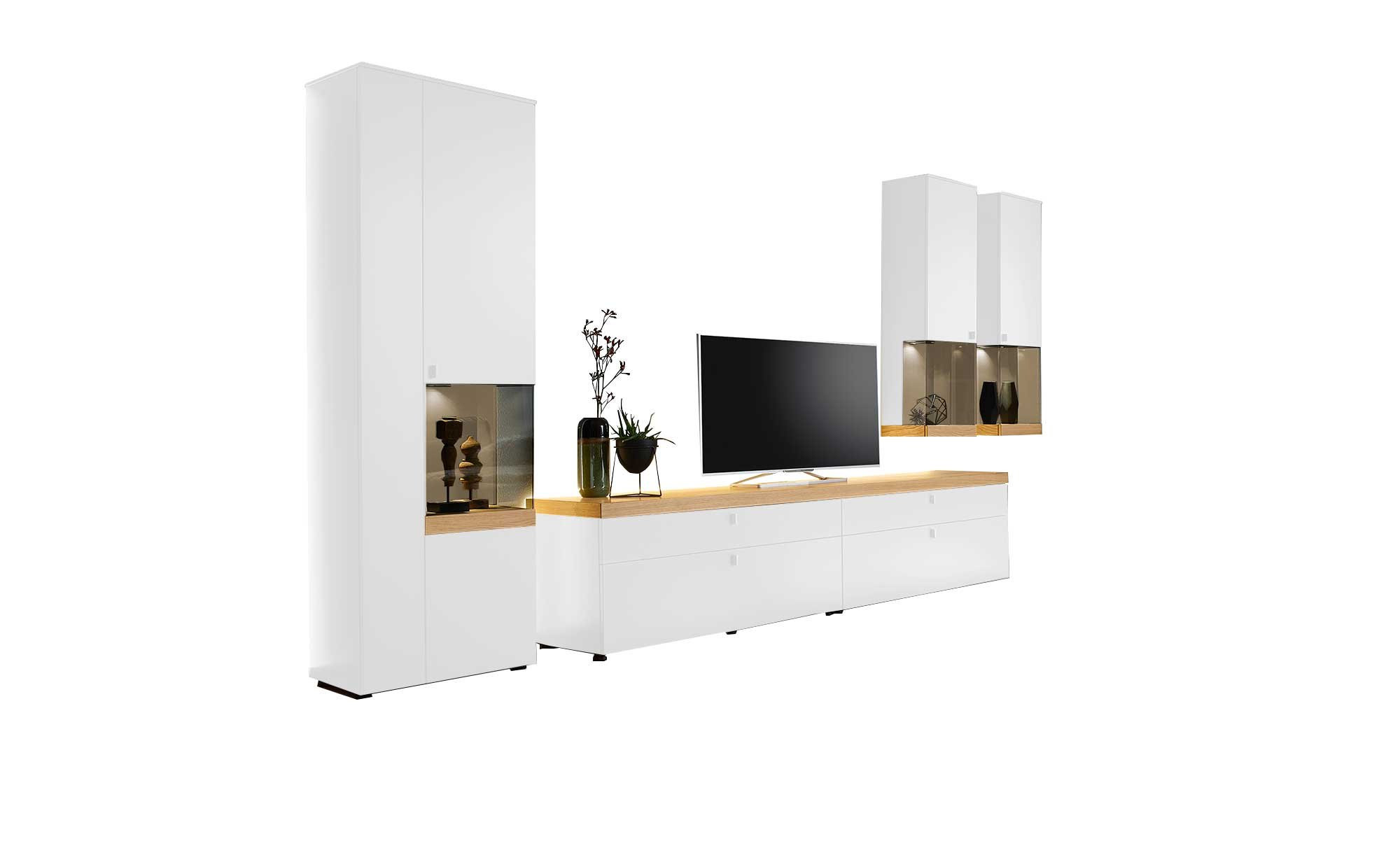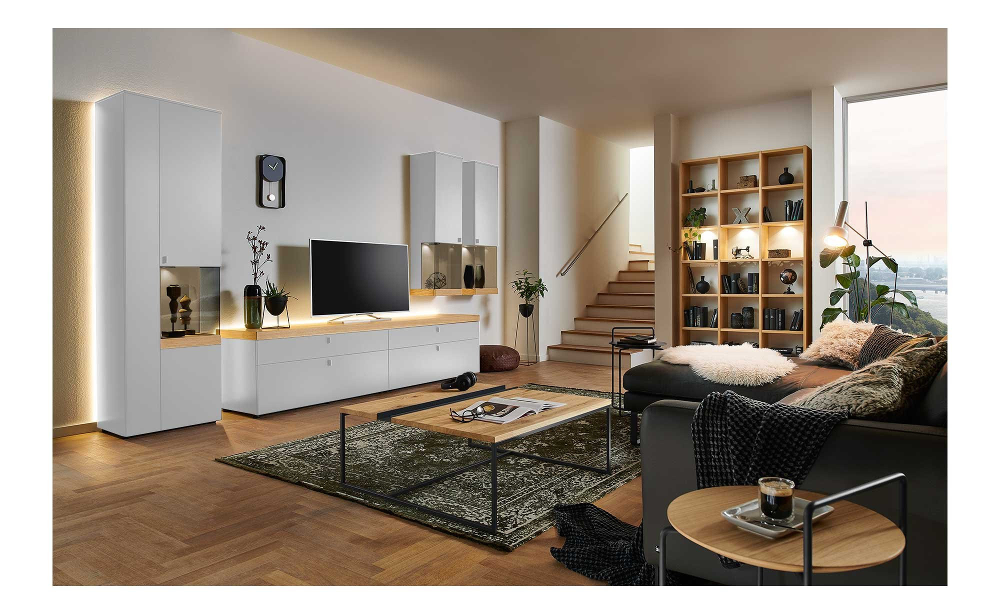 Zum Angebot gehören eine ca. 60 x 208 x 43 cm große Vitrine, ein ca. 240 x 59 x 53 cm umfassendes Lowboard und zwei Hängeelemente mit Maßen von jeweils ca. 40 x 138 x 33 cm. Front und Korpus der enthaltenen Möbel sind in einem matten Kristallweiß lackiert und passen damit perfekt zu den Metallgriffen in der gleichen Farbe. Für einen natürlichen Kontrast sorgen hingegen Echtholzfurnier-Absetzungen in Eiche Rustico hell. Die Stand- und Hängevitrinen verfügen zudem über Verglasungen in Parsolglas grau. Bei der Positionierung profitieren Sie von von innen verstellbaren Stellfüßen.
