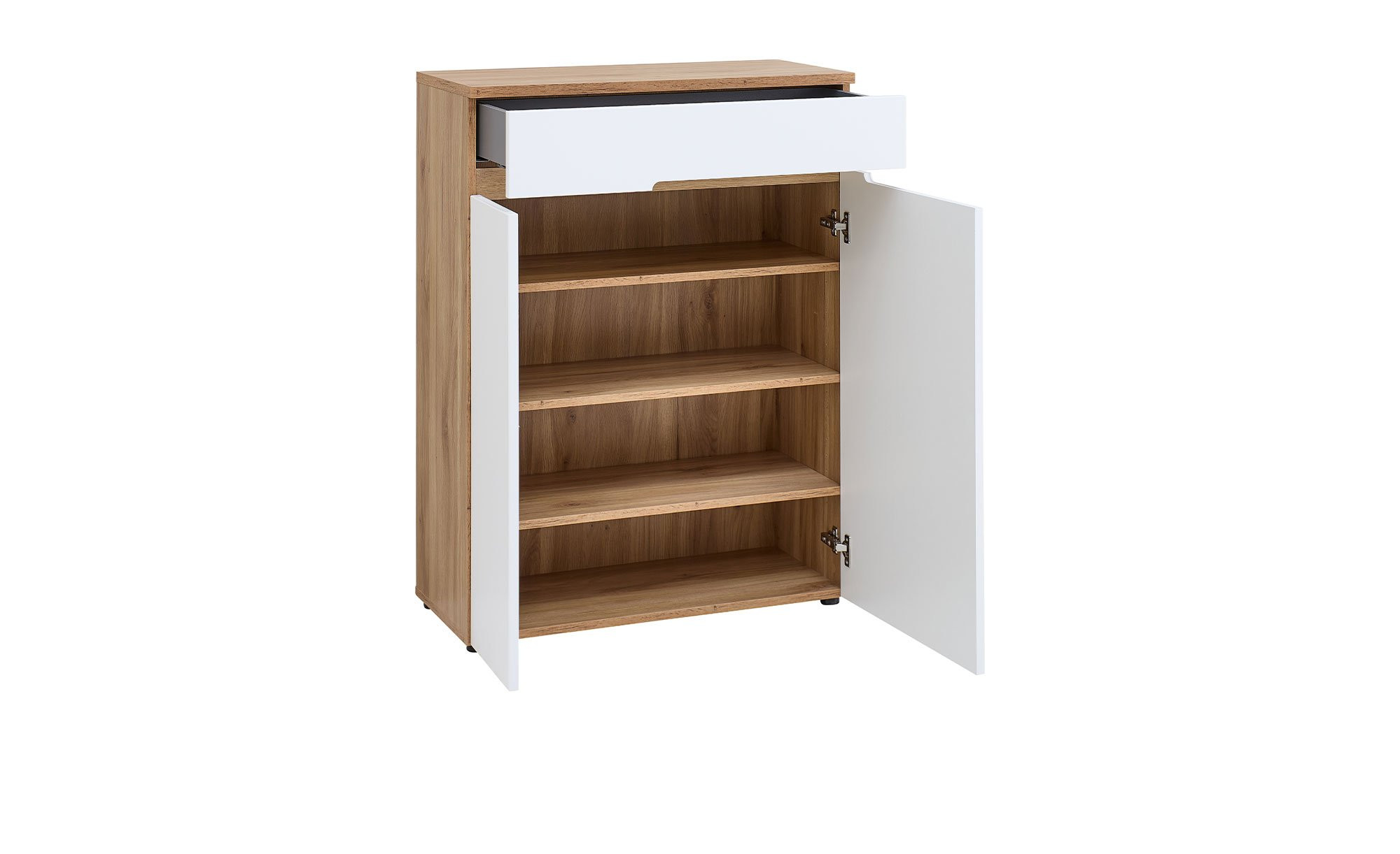 Während der aus Holzwerkstoff bestehende Korpus des Artikels ebenso wie die Rückwand und seine Absetzung mit einer Mauvella Oak Nachbildung begeistert, ist die Front in einem supermatten Weiß gehalten. Sie wurde aus Holzwerkstoff-MDF gefertigt und punktet durch ihr griffloses Design mit einer Griffausfräsung. Als Füße fungieren schwarze Kunststoffgleiter. Zum ca. 80 x 107 x 38 cm großen Möbelstück gehören zwei gedämpfte Türen und ein Schubkasten inkl. Soft-Close-Funktion. Die Nutzung erfolgt also angenehm geräuscharm. Im Innenbereich wurden drei Böden integriert.