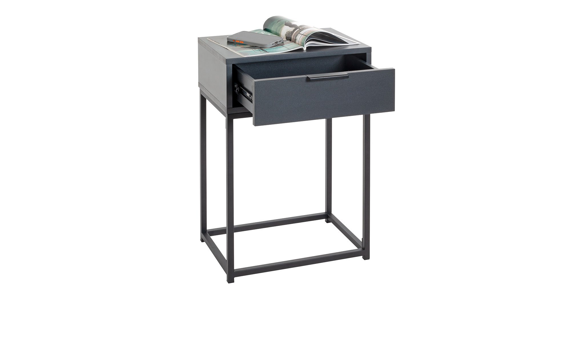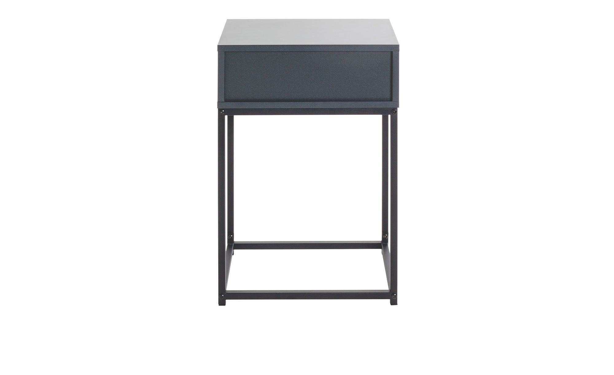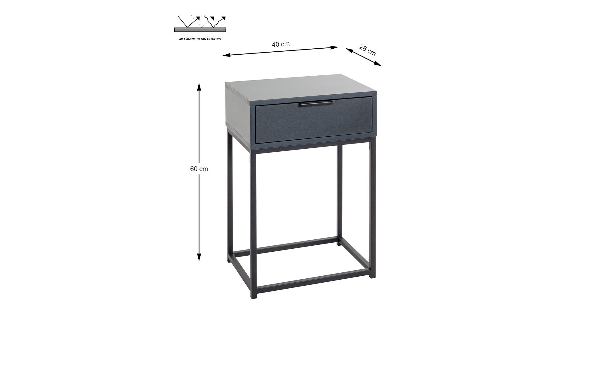 Am ca. 40 x 60 x 28 cm großen Gestell besteht das Möbelstück aus robusten, schwarz pulverbeschichteten Stahlrohren in einer Stärke von ca. 16 x 16 cm. Auf einer Höhe von ca. 41 cm befindet sich der Korpus mit Schublade – gefertigt aus Spanplatten in Anthrazit. Die Schublade misst innen ca. 31,5 x 23,5 x 8 cm.