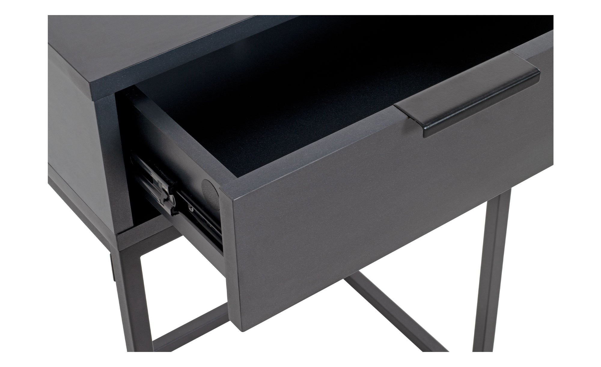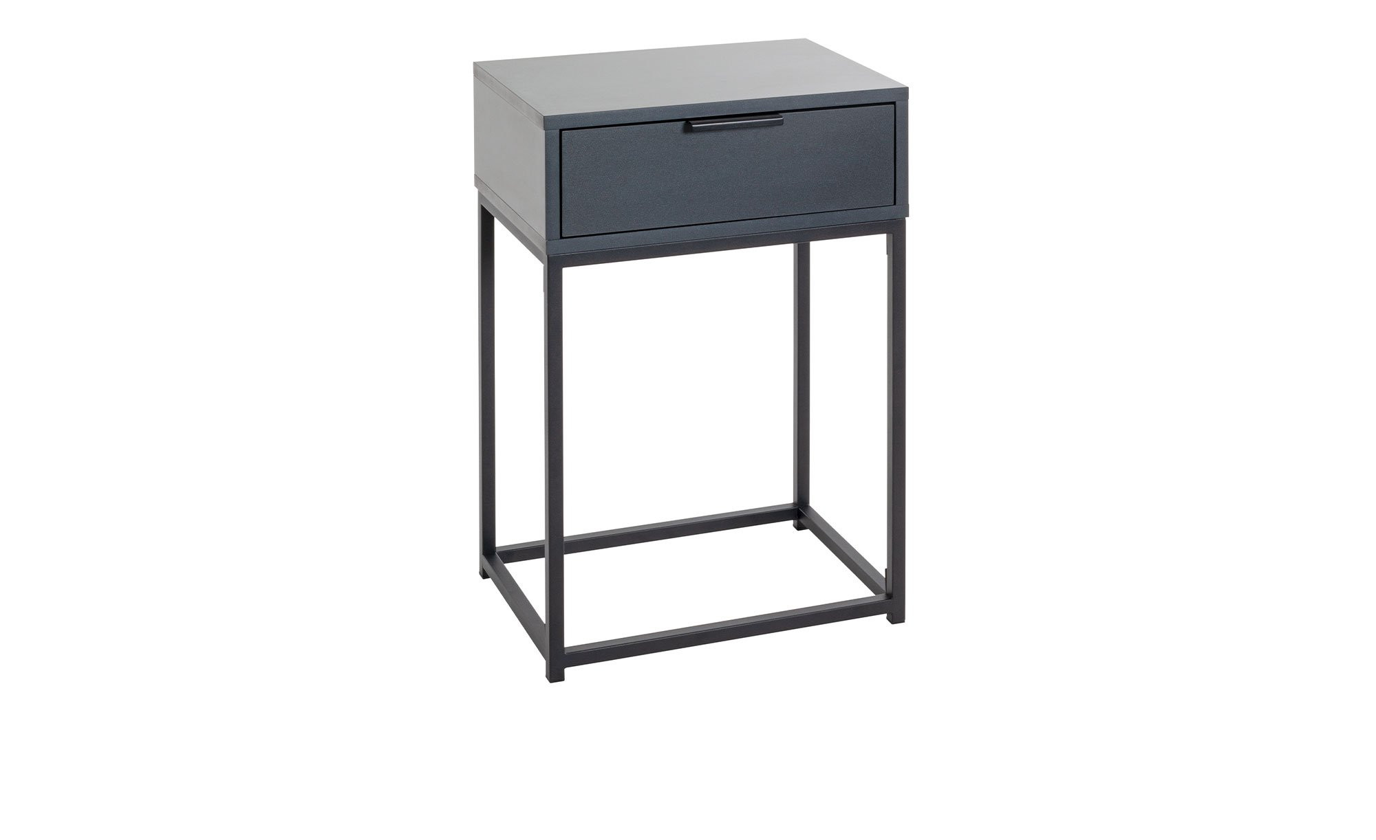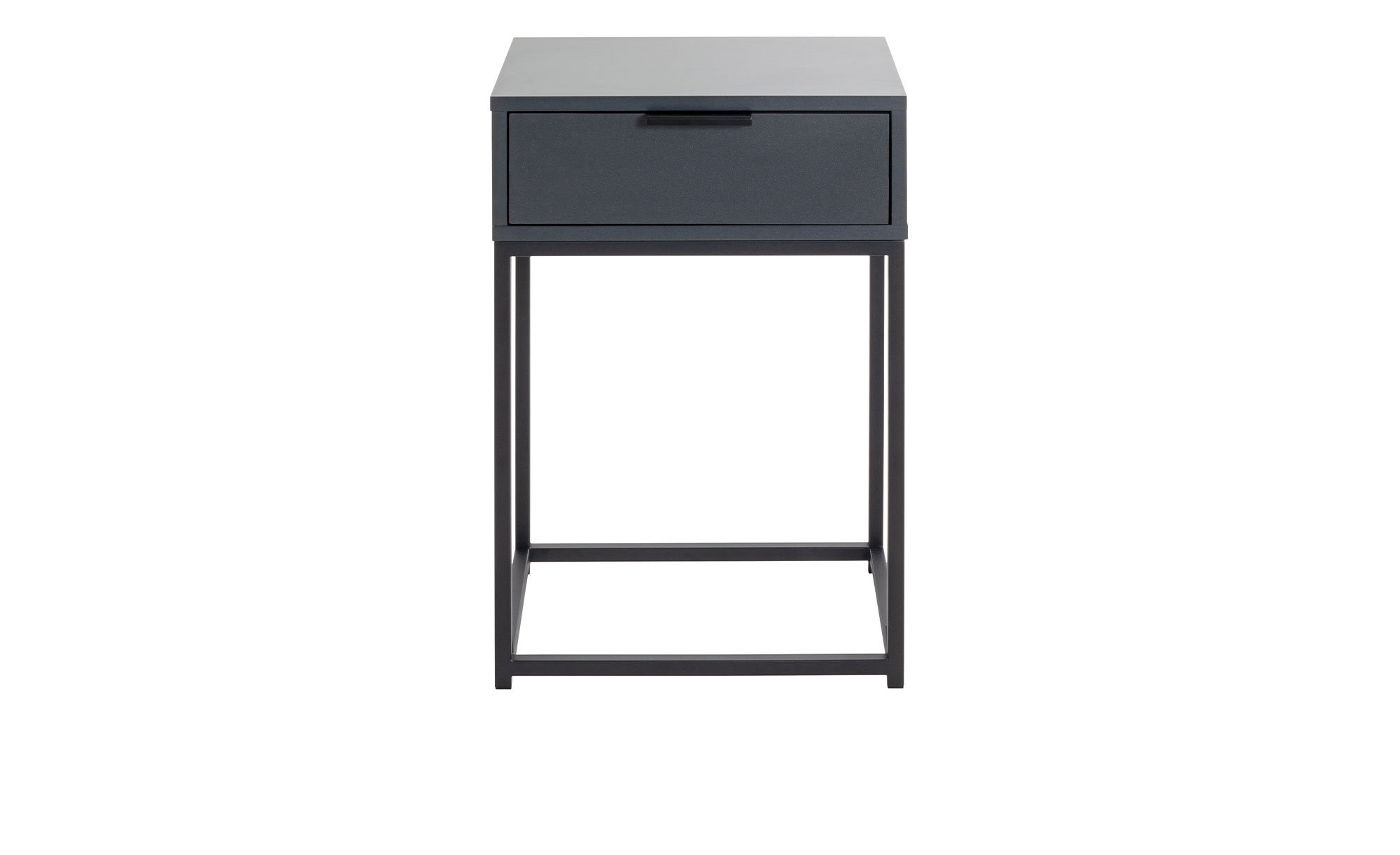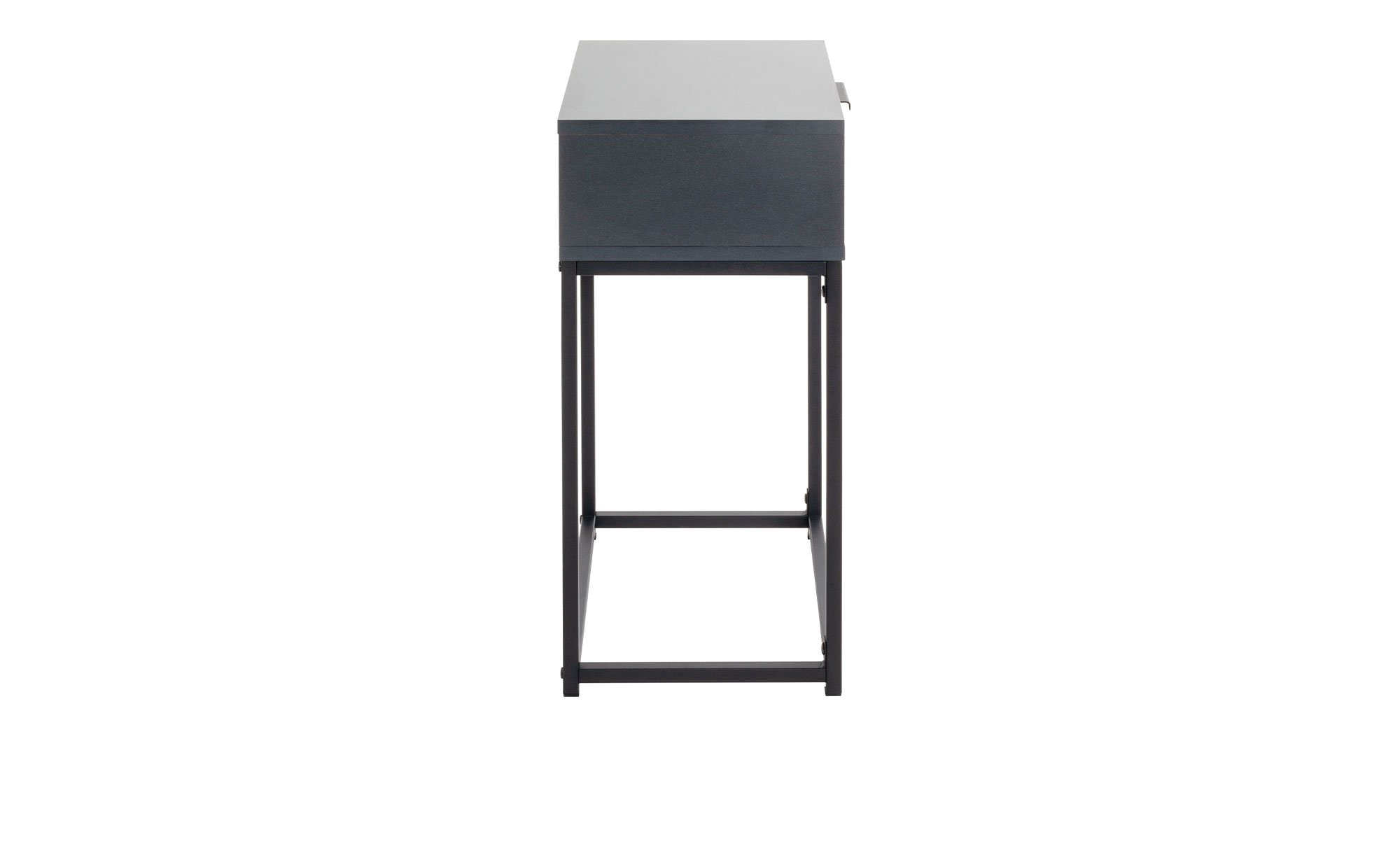 Am ca. 40 x 60 x 28 cm großen Gestell besteht das Möbelstück aus robusten, schwarz pulverbeschichteten Stahlrohren in einer Stärke von ca. 16 x 16 cm. Auf einer Höhe von ca. 41 cm befindet sich der Korpus mit Schublade – gefertigt aus Spanplatten in Anthrazit. Die Schublade misst innen ca. 31,5 x 23,5 x 8 cm.