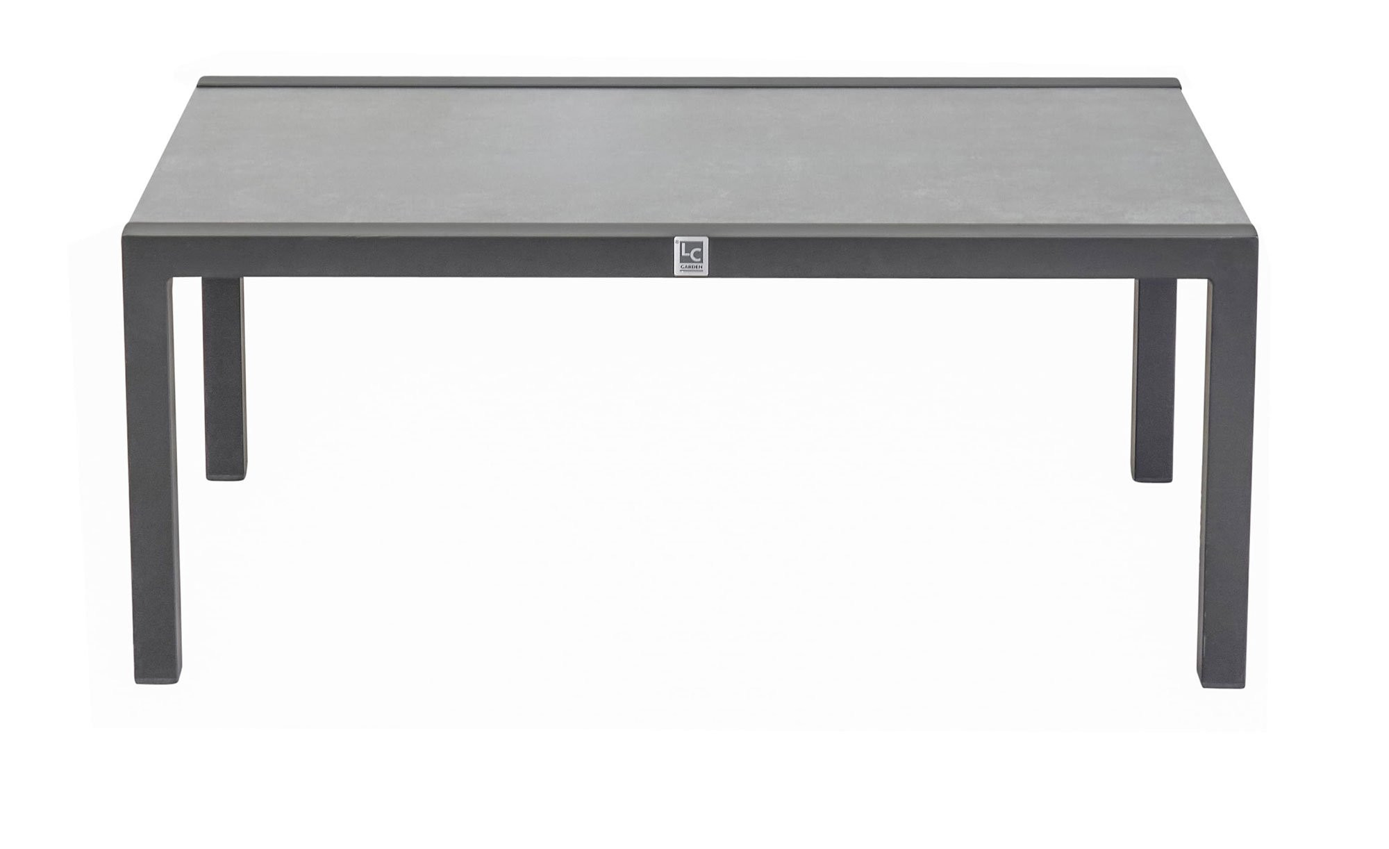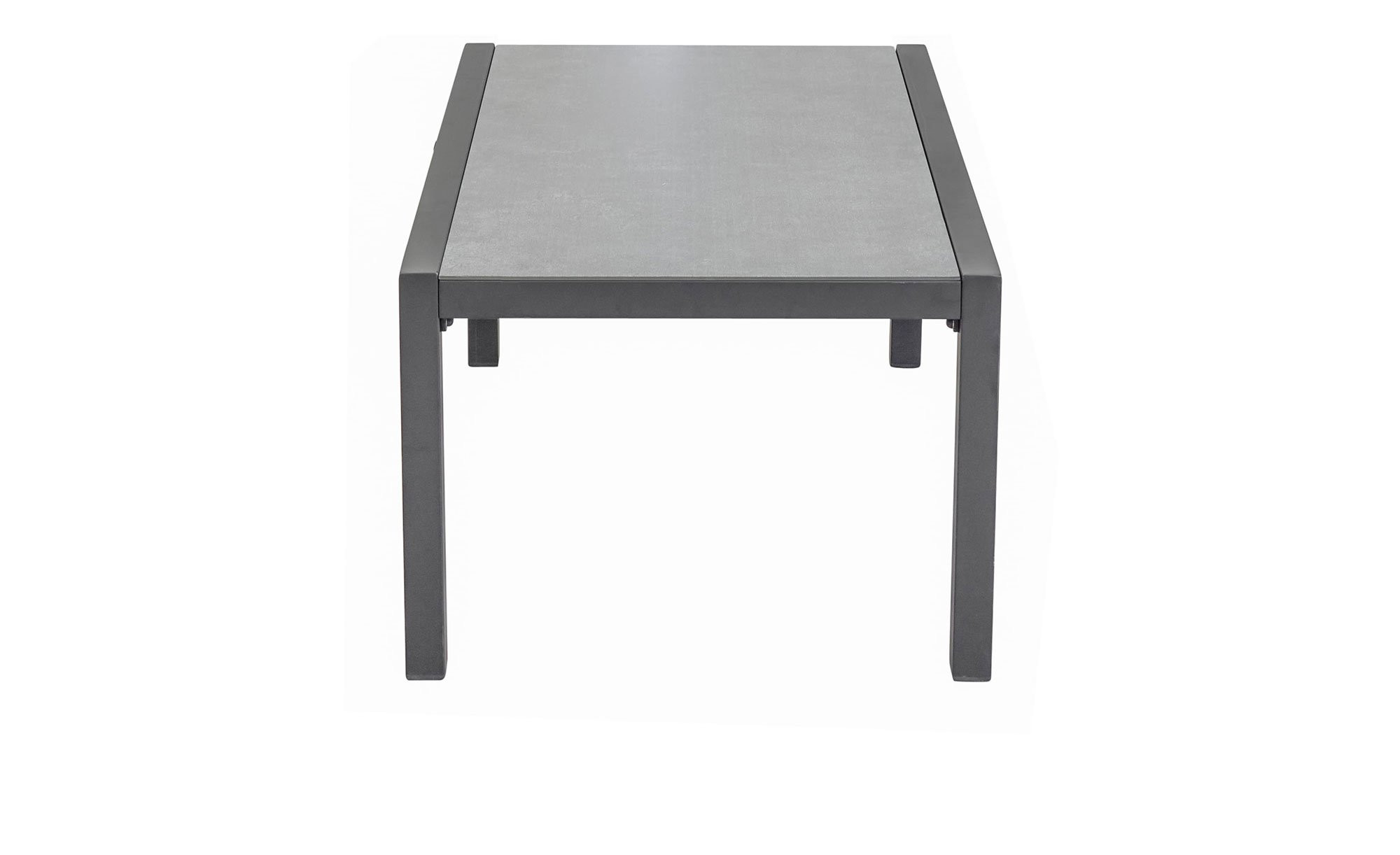 Ein stabiles Gestell aus anthrazitfarbigem Aluminium bildet mit vier Füßen die Basis des ca. 100 x 42 x 60 cm großen Artikels. Es trägt eine rechteckige Platte aus Glas, die mit ihrer Keramikbe-schichtung in Beton-Optik ein wertiges Flair in Ihren Garten oder auf den Balkon bringt.