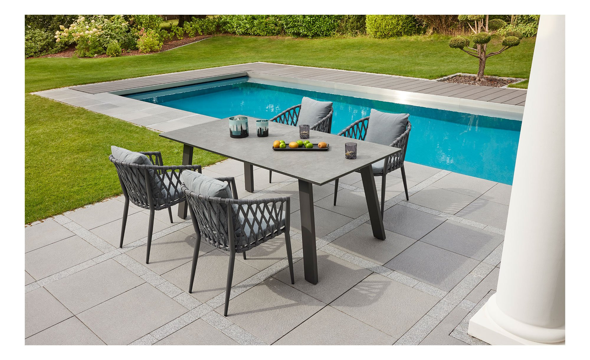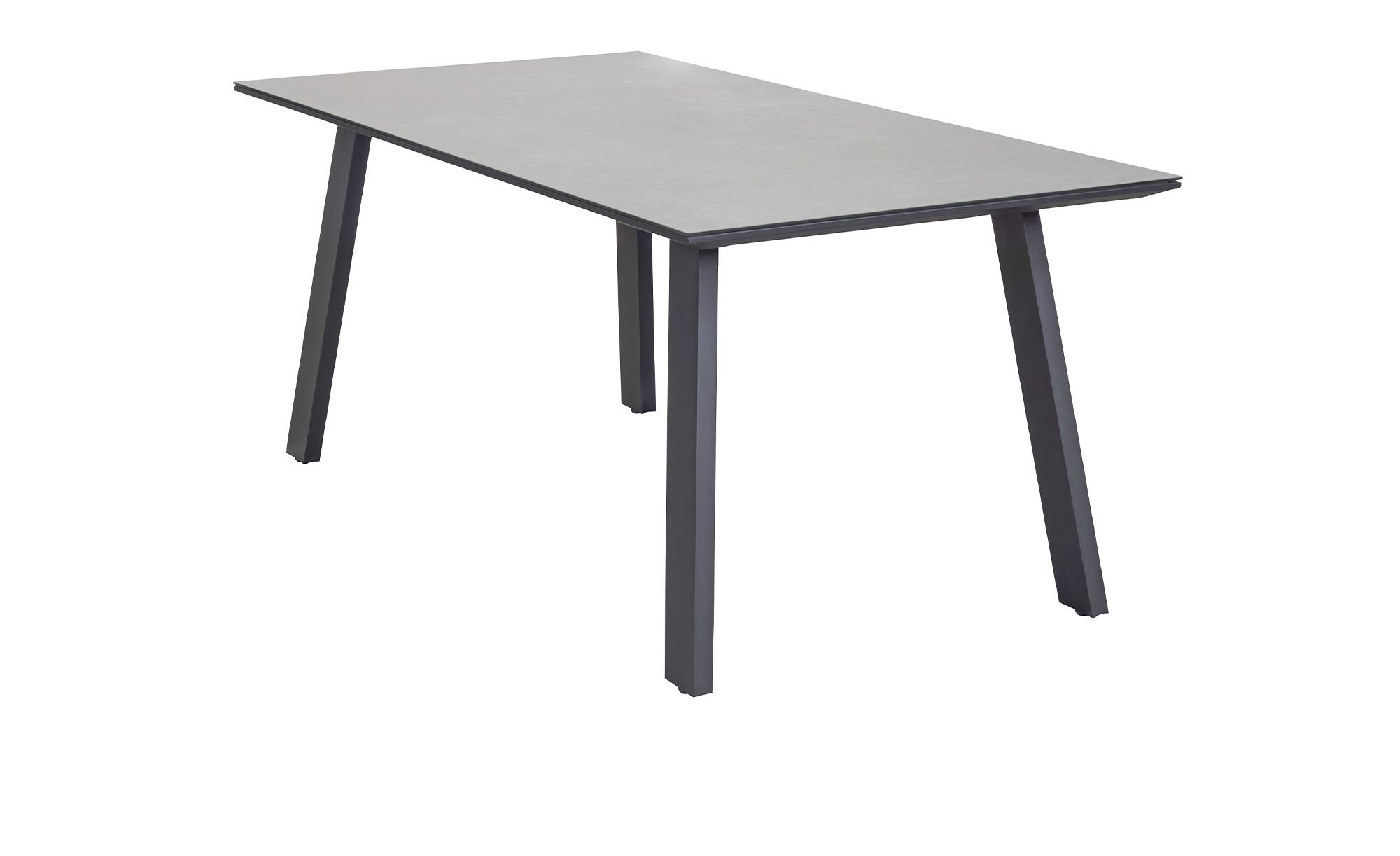 Eine Tischplatte in Beton-Optik präsentiert sich als Mittelpunkt des LC Garden Dining-Sets Sunrepo. Sie besteht aus einem Glas-Keramik-Mix und ist in der Farbe Anthrazit gehalten. Somit passt der ca. 180 x 75 x 90 cm große Gartentisch perfekt zu den vierfüßigen Stühlen.