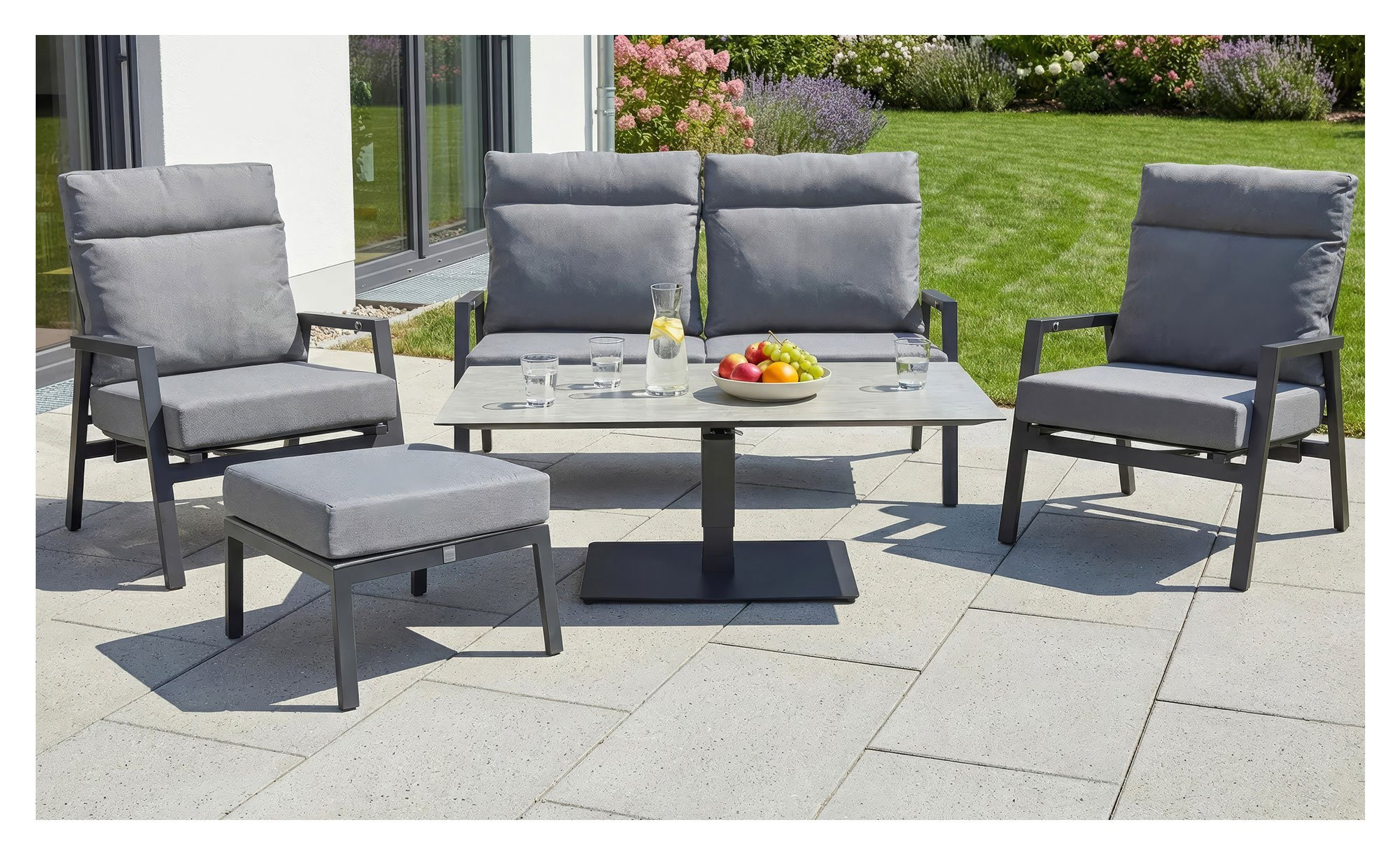 Das Gestell des Gartensessels Belinda von LC Garden ist vierfüßig. Es besteht aus anthrazitfarbi-gem Aluminium, an der Rückenlehne erwartet Sie zudem eine Fläche aus Textilen. Auch die ca. 12 cm starken Auflagen mit Polyester-Bezügen in Hellgrau sind im Angebot enthalten. Ohne Kissen ist der Sitz des ca. 72 x 98 x 81 cm großen Artikels noch ca. 34 cm hoch.