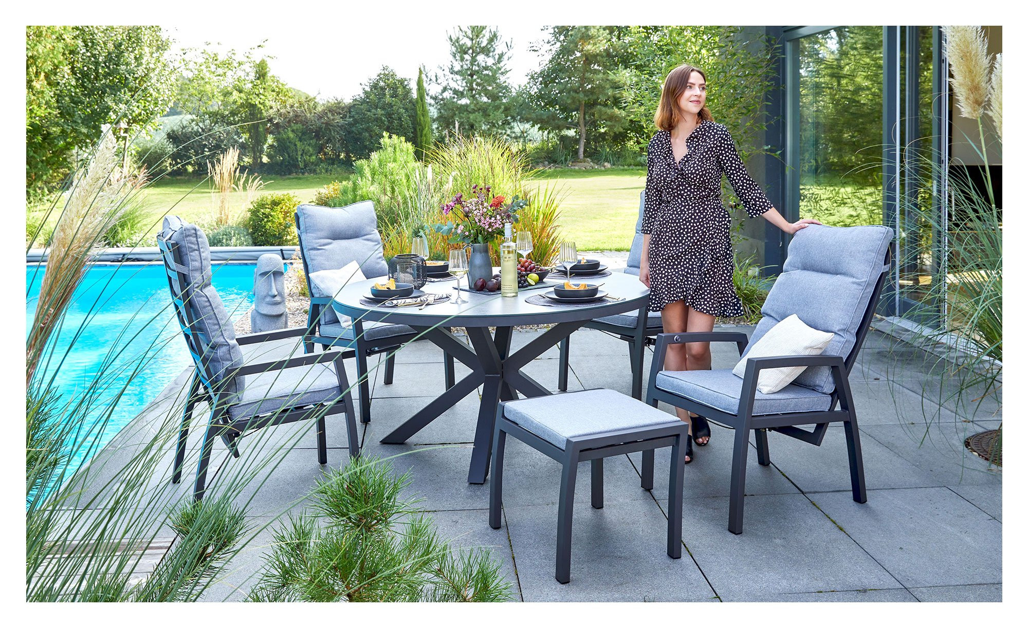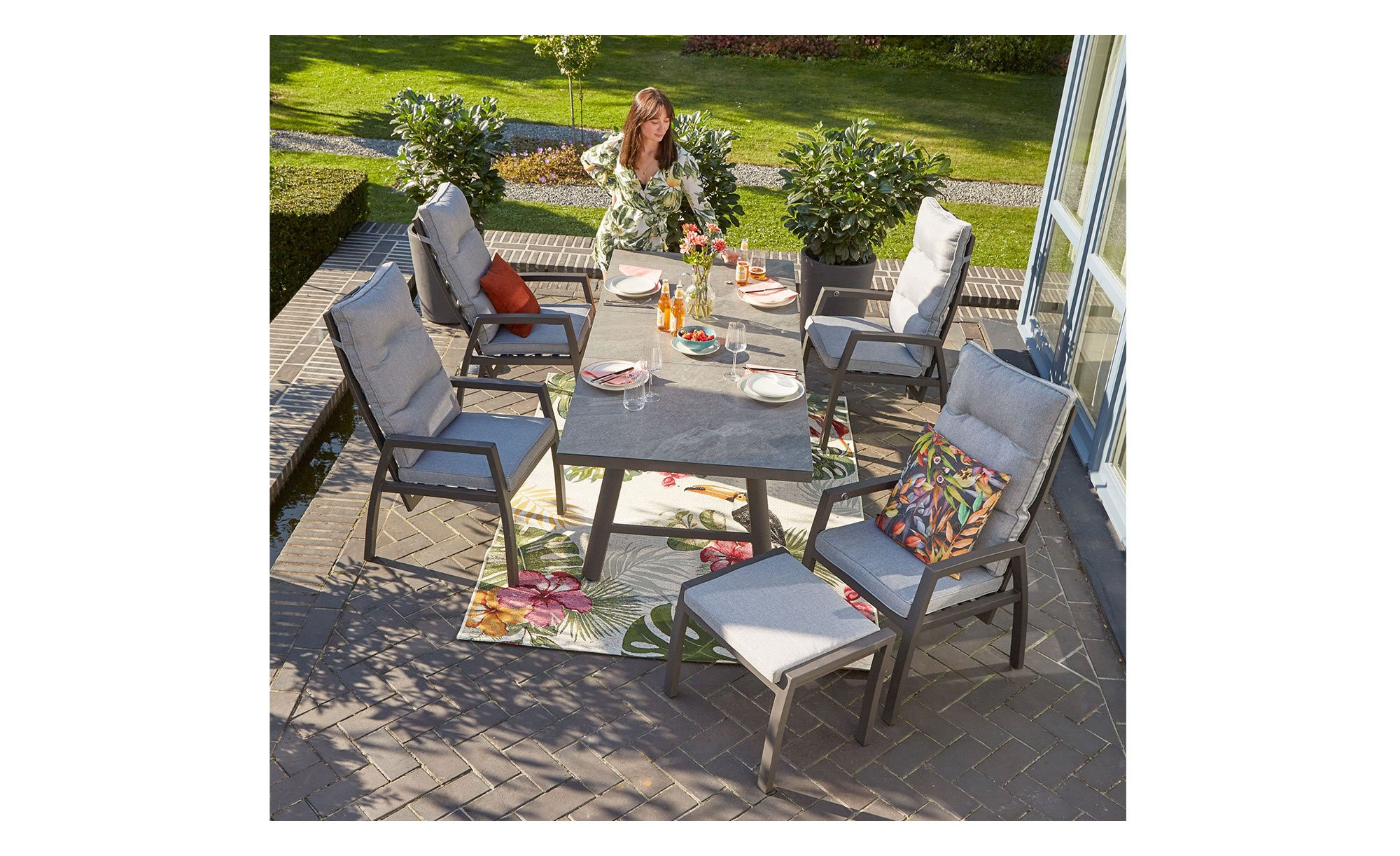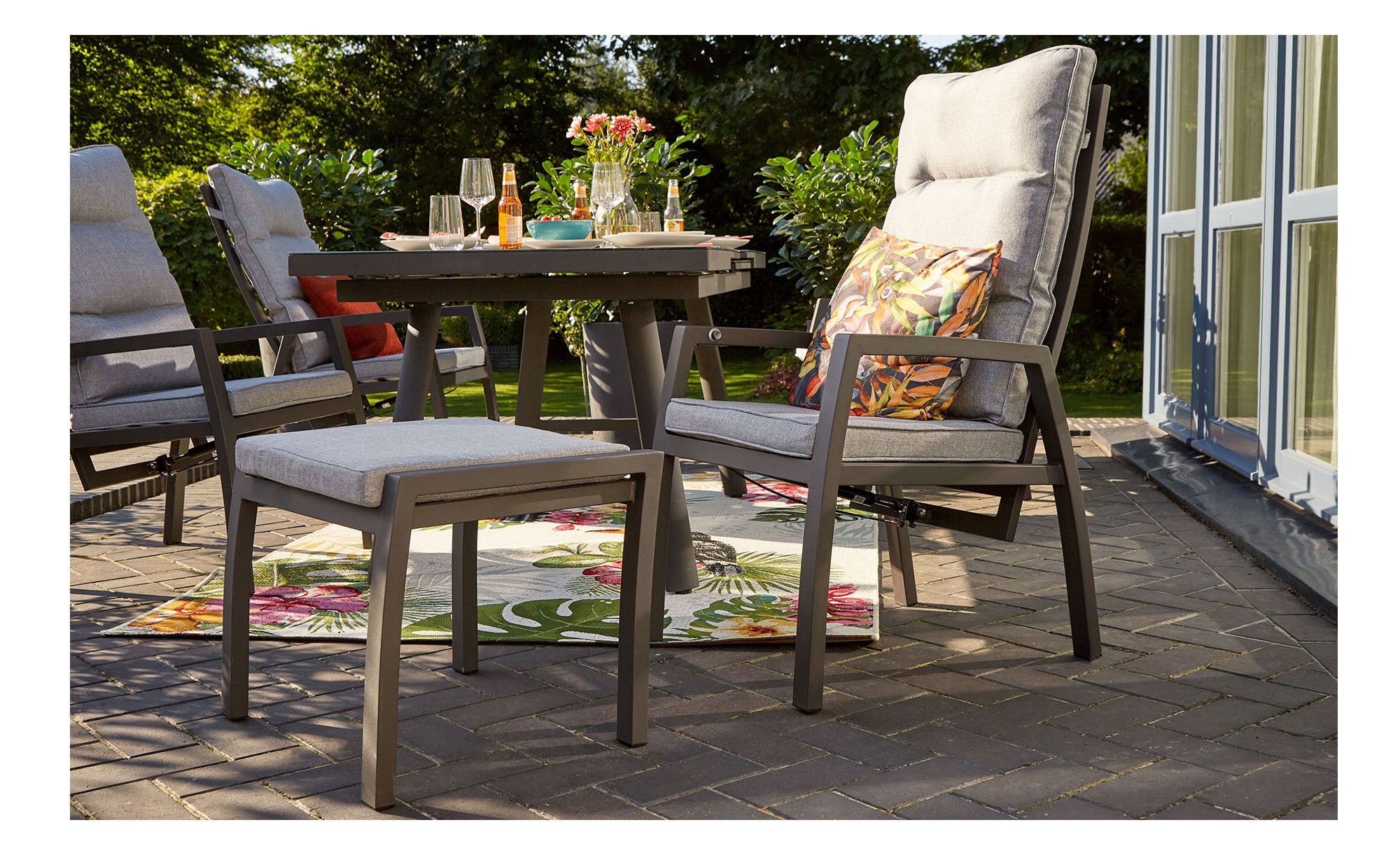 Die Rückenlehne des Bondino Black ist flexibel verstellbar, sodass jeder Nutzer seine ideale Sitzposition findet. Im Lieferumfang sind Sitz- und Rückenkissen in Grau enthalten, deren Bezüge aus pflegeleichtem Polyestergarn gefertigt sind. Wetter- und UV-Beständigkeit gewährleisten eine lange Lebensdauer des Gartensessels und machen ihn zu einem stilvollen und praktischen Begleiter für den Sommer im Freien.