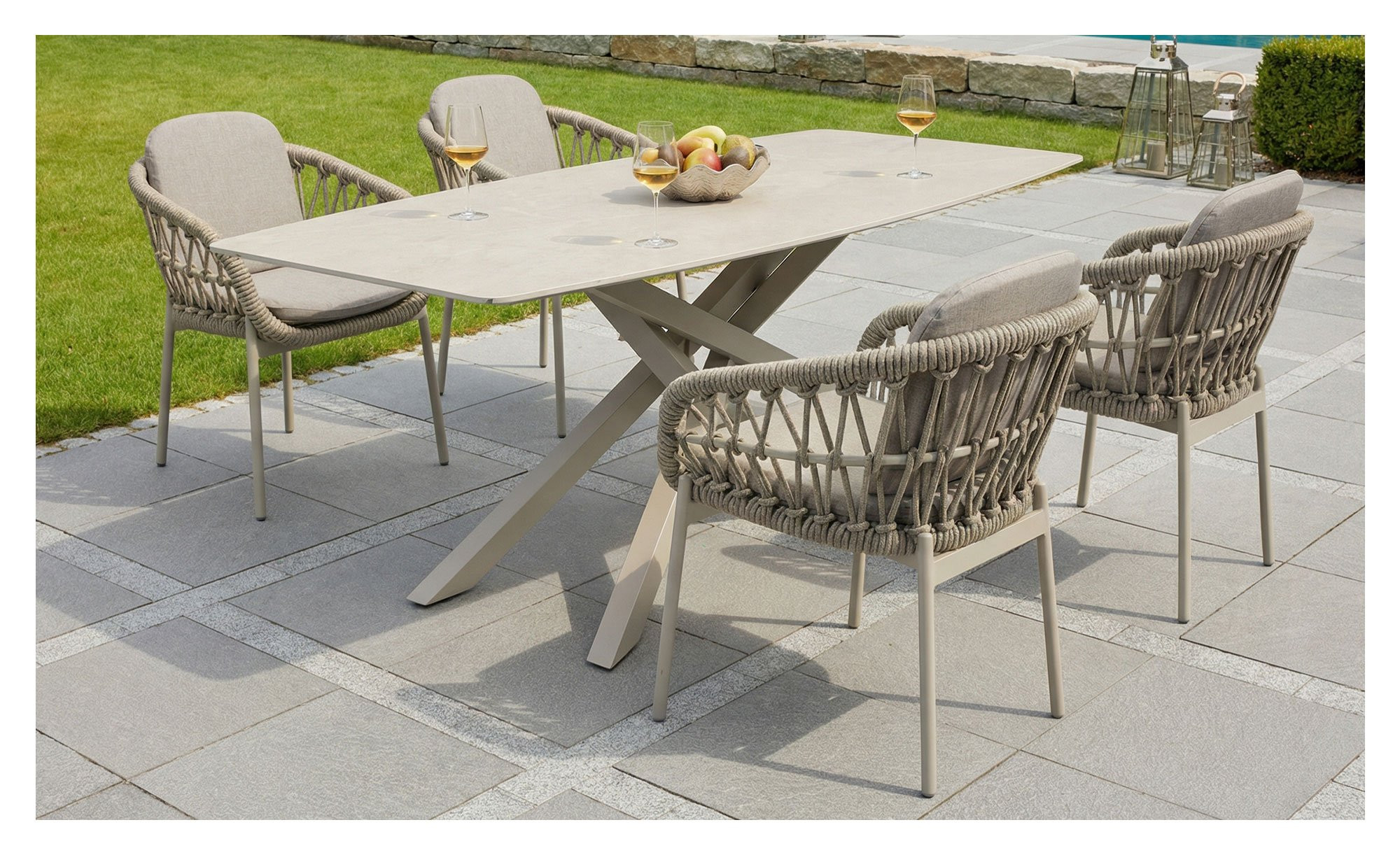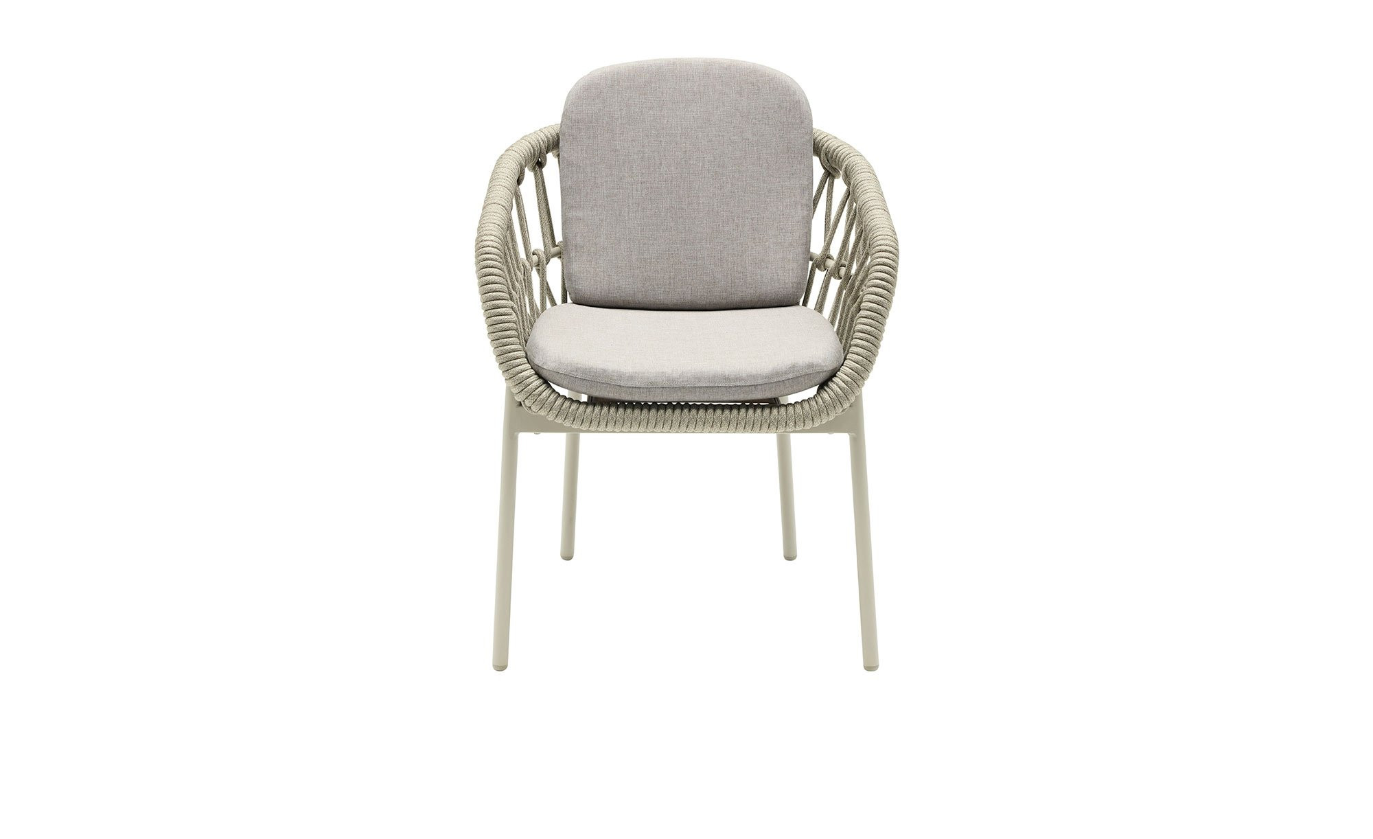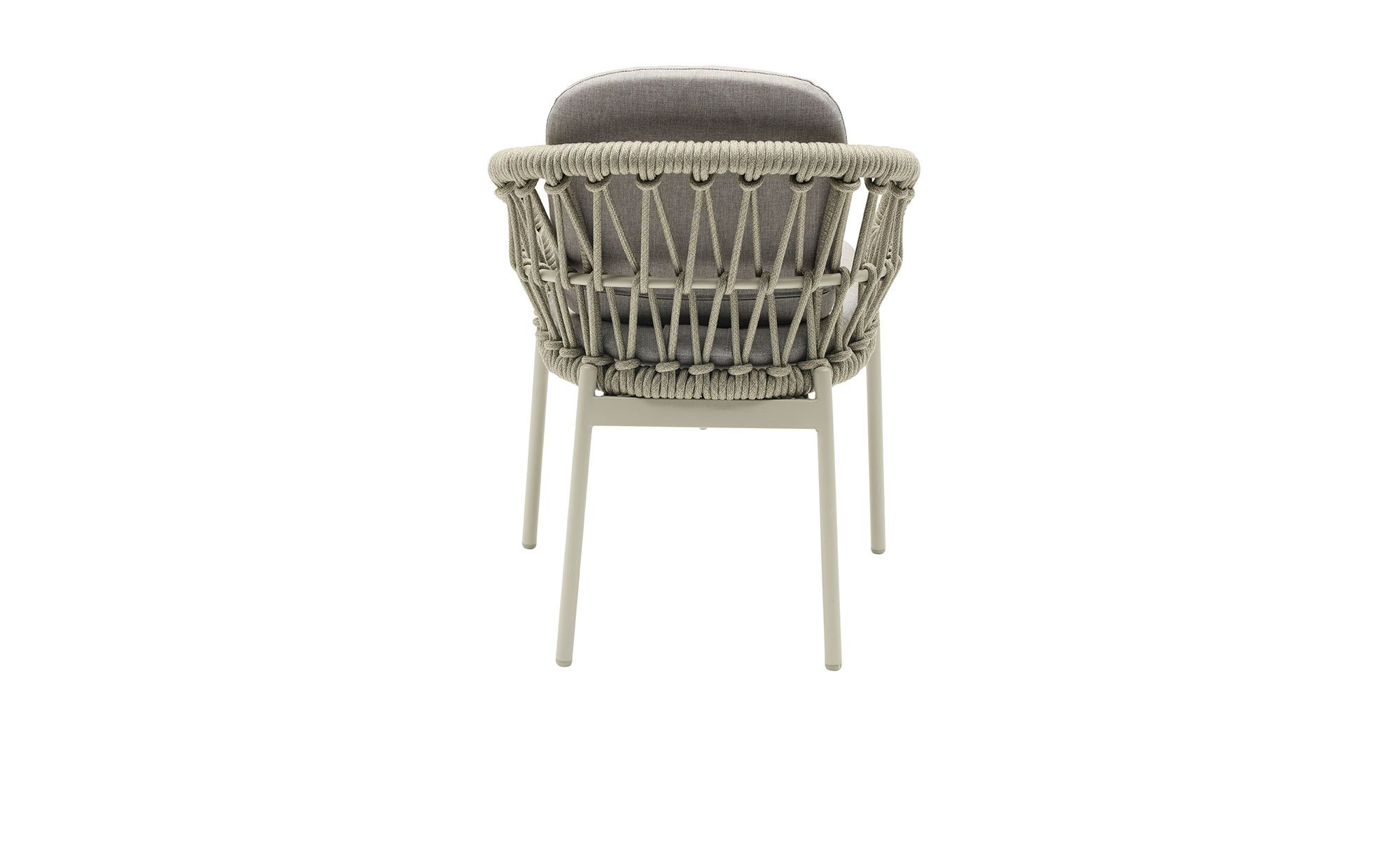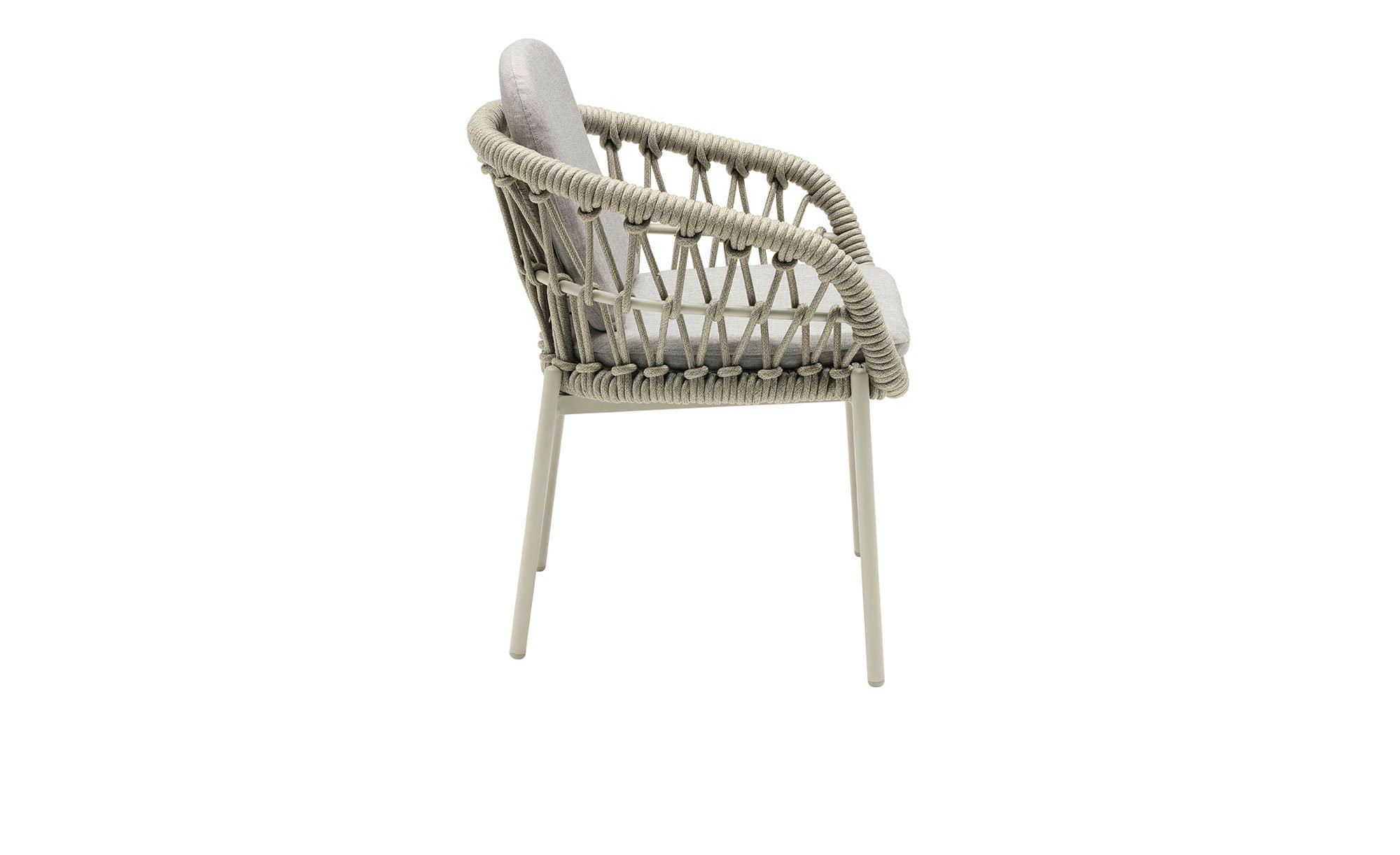 Ein Gestell mit vier Füßen aus pulverbeschichtetem Aluminium sorgt für eine stabile Basis. Sie ist genau wie die integrierte Rope-Bespannung in einem ansprechenden Taupe-Ton gehalten. Einen gelungenen Kontrast bildet hingegen die hellgraue Auflage aus Olefin, die das ca. 63 x 79 x 62 cm große LC Garden Möbelstück komplettiert.