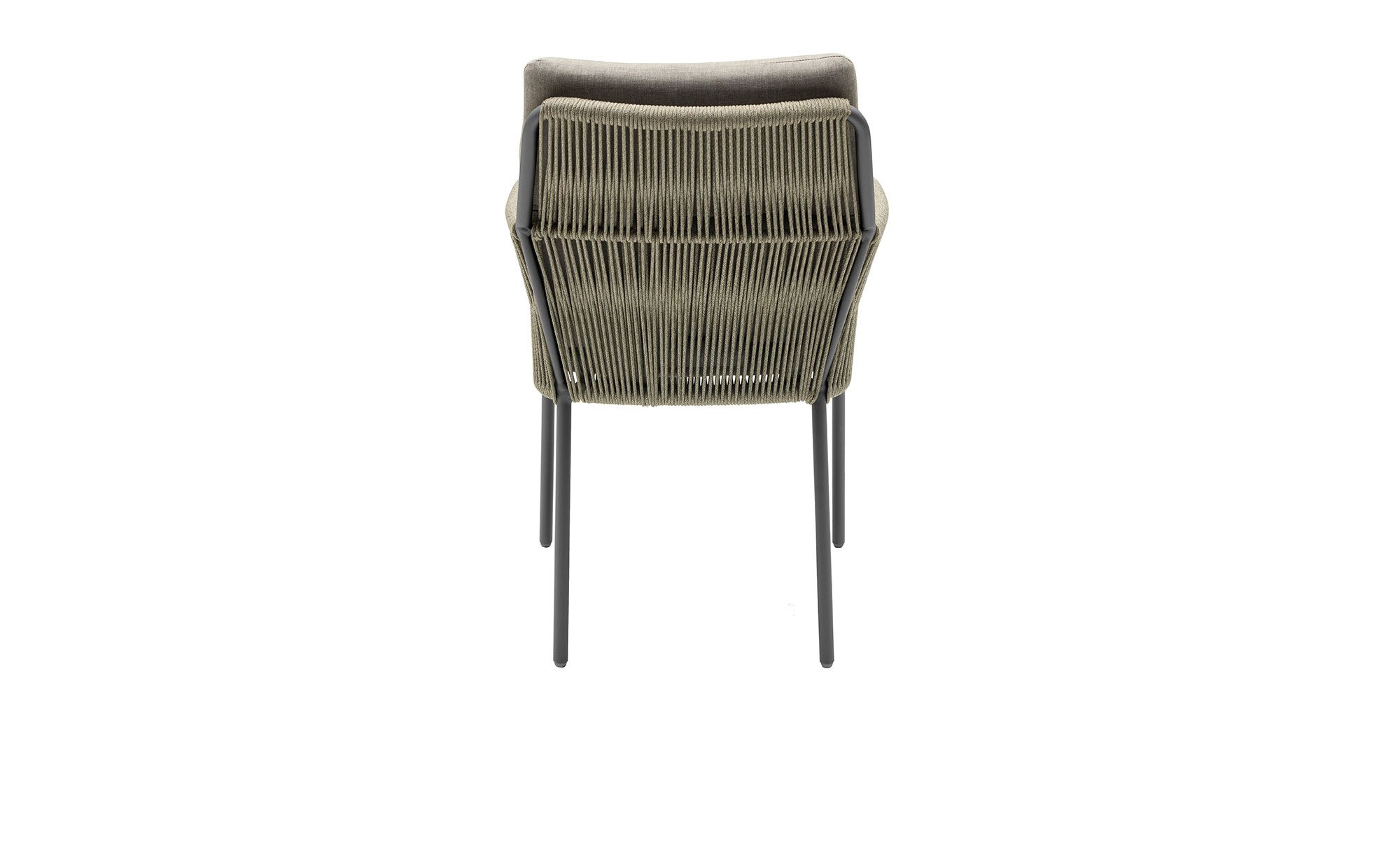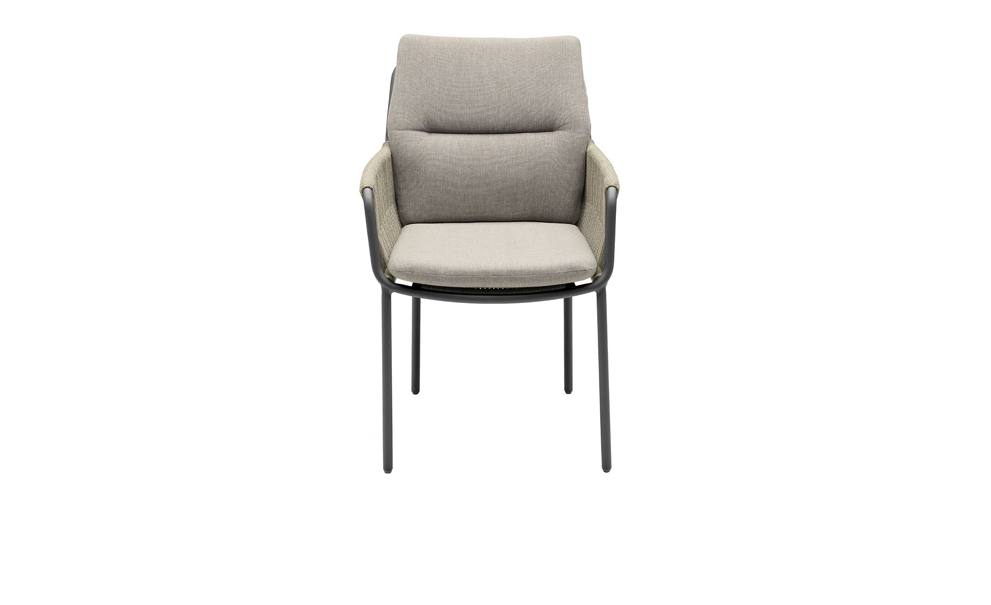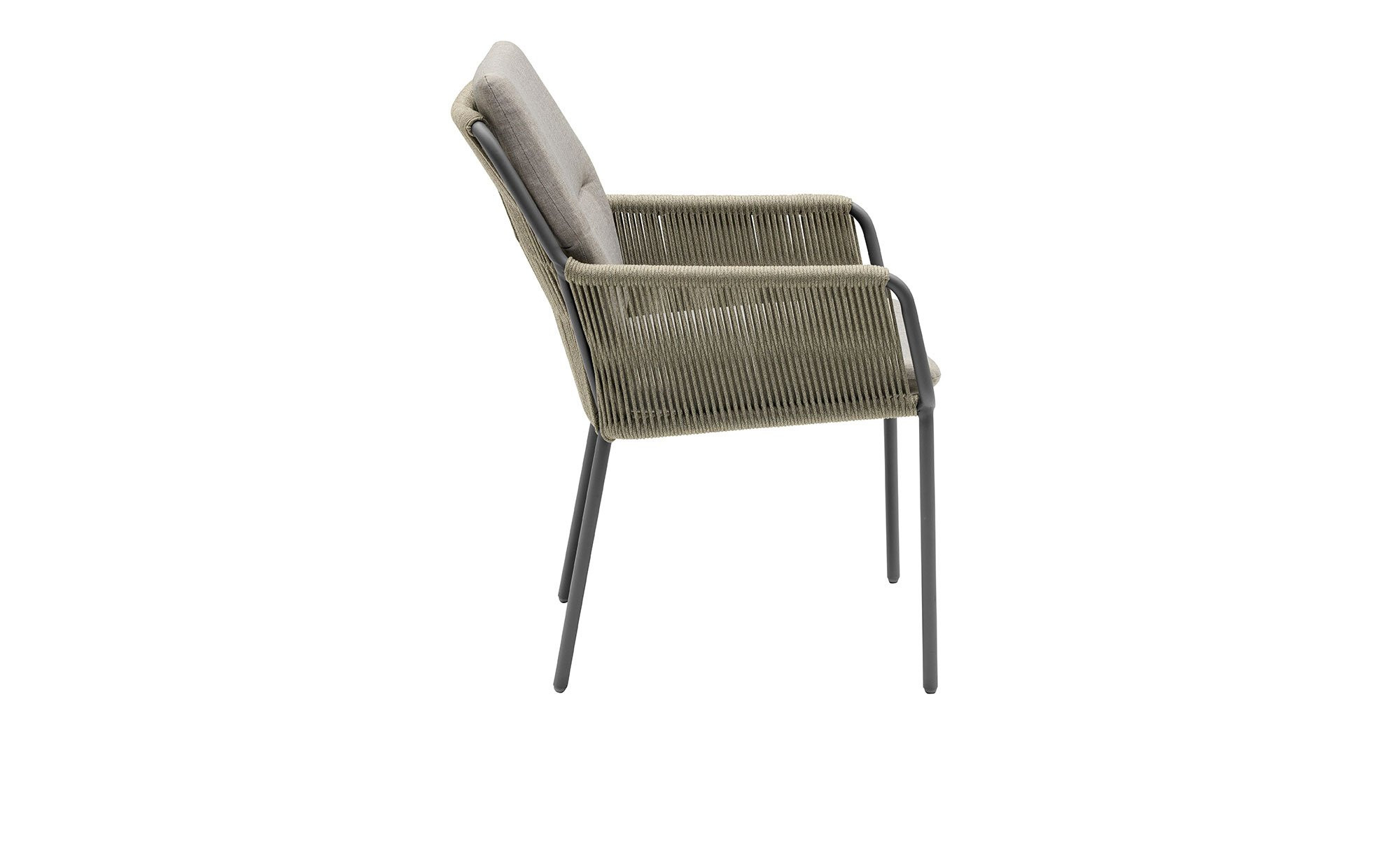 An seinem vierfüßigen Gestell aus Aluminium begeistert der ca. 71 x 86 x 59 cm große Artikel in einem edlen Anthrazit-Ton. Während die Armlehnen mit ca. 5 mm starkem Rope in der Farbe Natur versehen sind, befindet sich am Sitzbereich Textilen. Im Angebot enthalten ist außerdem eine Auflage aus beigem Olefin.
