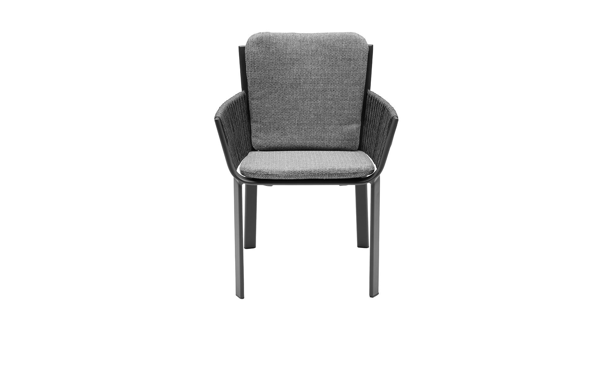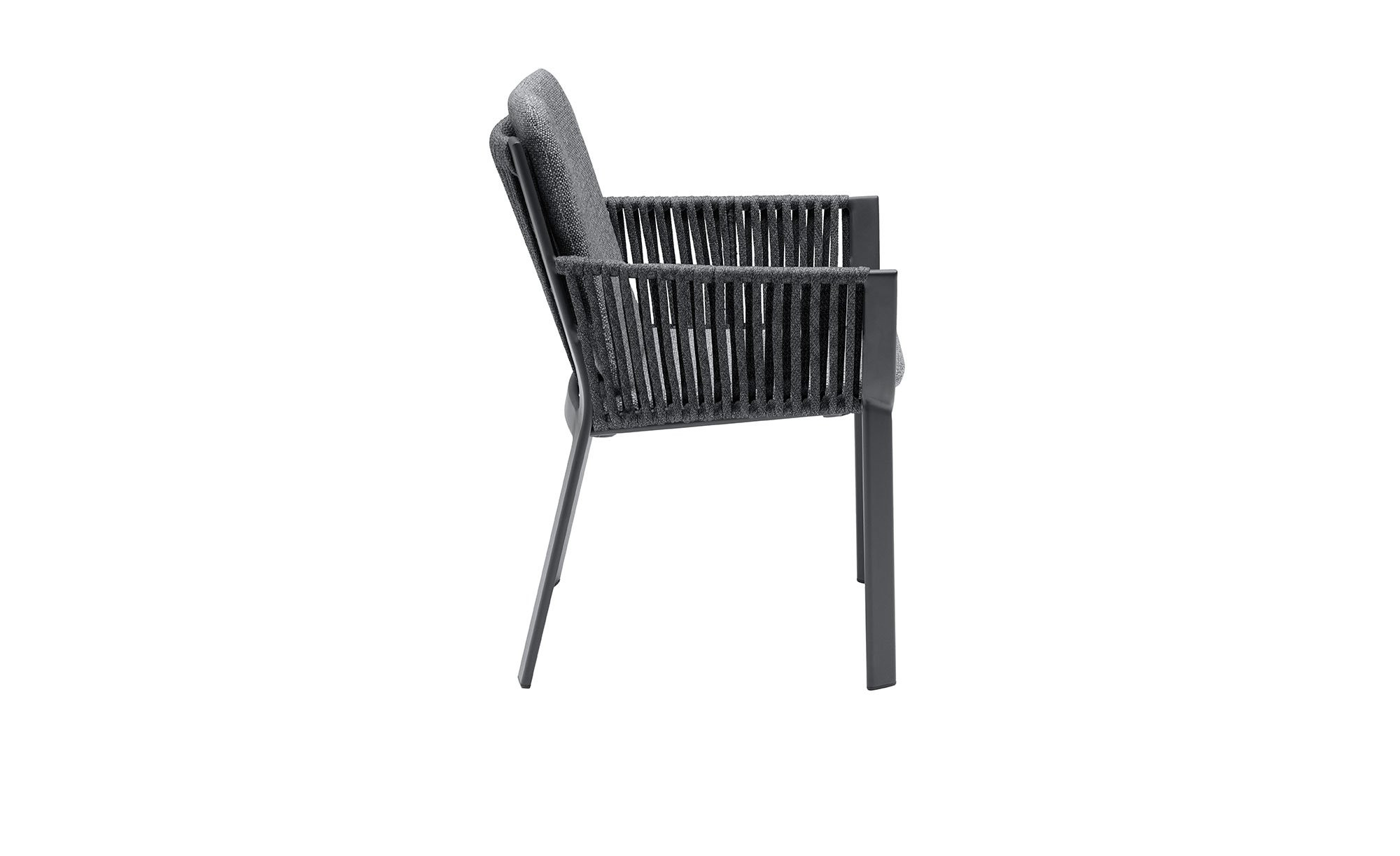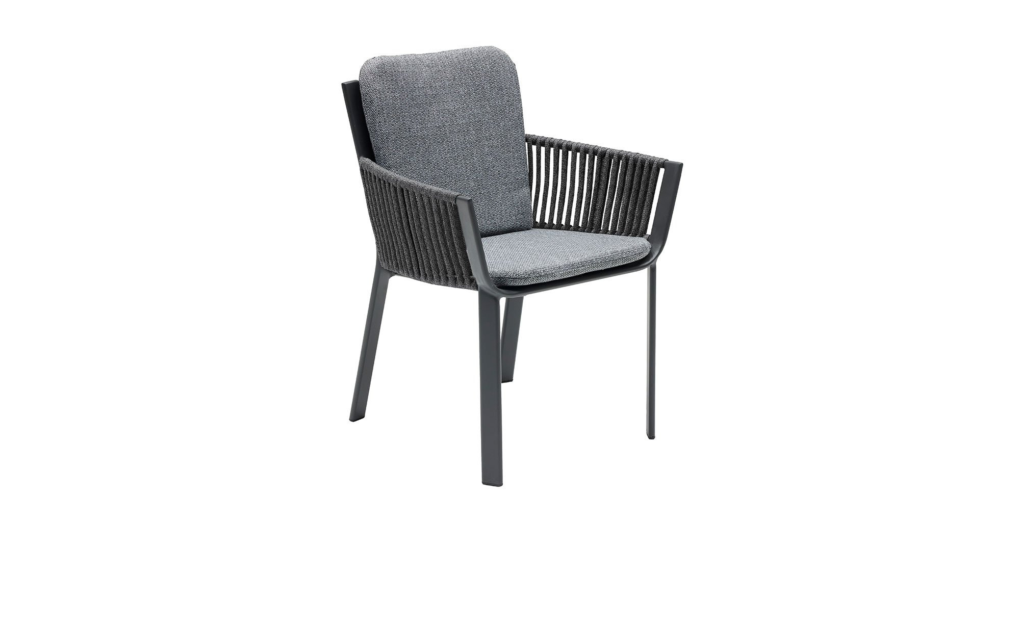 Auf gekonnte Weise verbindet der Gartenstuhl Live der Marke LC Garden ein modernes Design mit komfortablen Eigenschaften. Das Möbelstück für den Außenbereich misst ca. 63 x 83 x 62 cm. Es ist mit einem vierfüßigen Gestell aus pulverbeschichtetem Aluminium in Anthrazit versehen, das für die stabile Basis sorgt. Die Sitzfläche besteht aus Textilene, außerdem wurde an den Armlehnen und am Rücken senkrecht ein ca. 15 mm starkes Seil in passender Farbgebung verflochten.