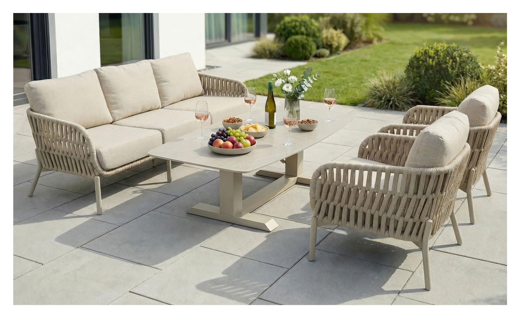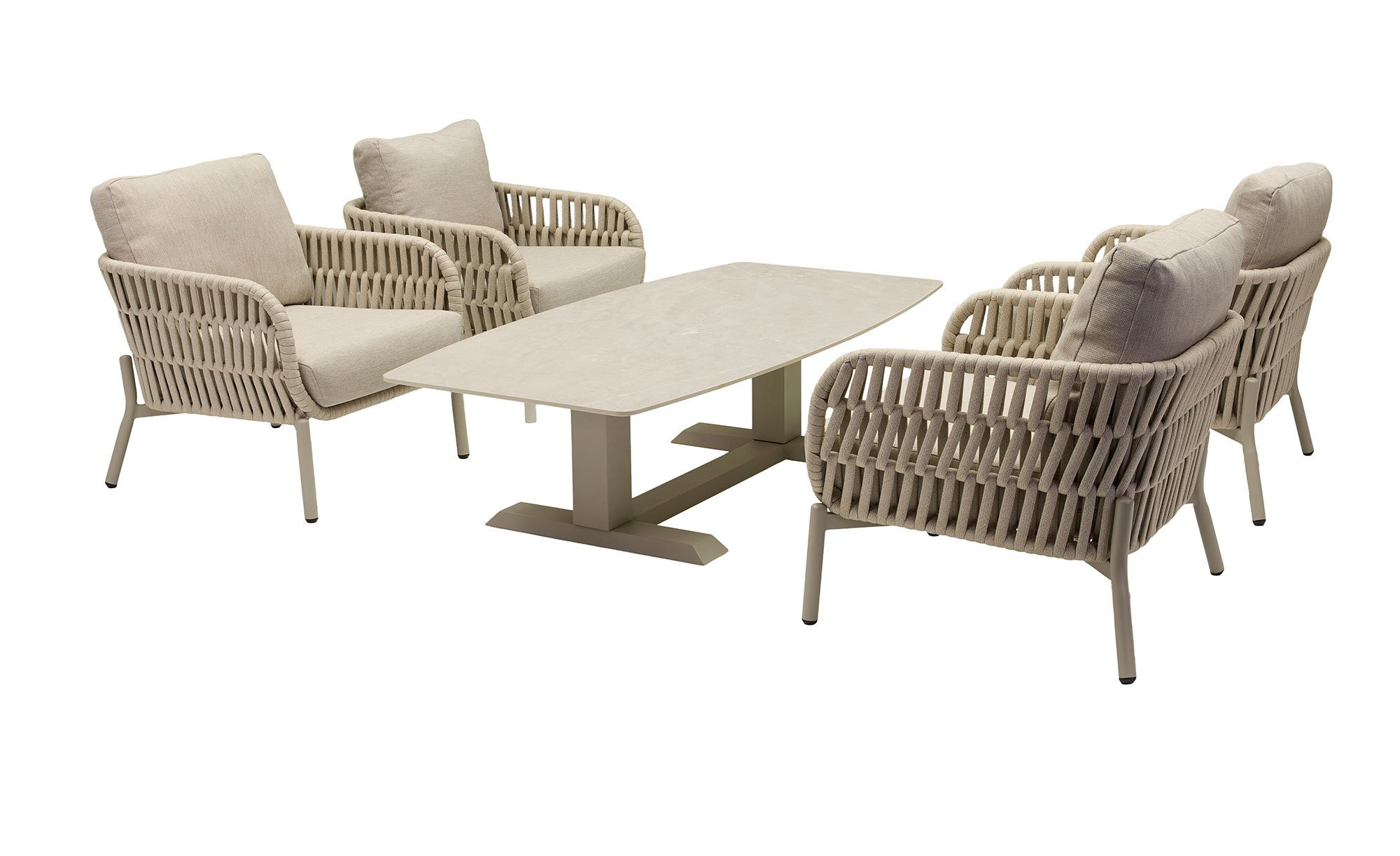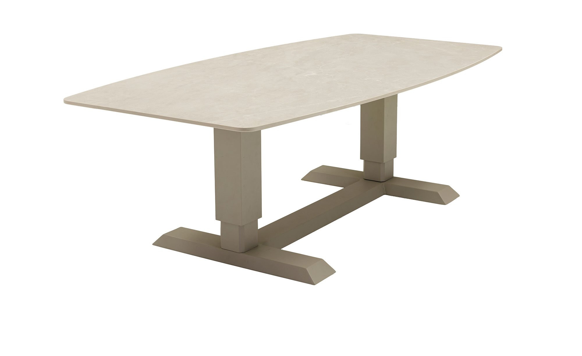 Getragen wird der Artikel von einem stabilen Aluminiumgestell in modernem Taupe. Darauf befindet sich eine ovale Tischplatte in eleganter Bootsform, die aus Sinterstein mit Naturfinish gefertigt ist. Ihre dezente, leicht schimmernde Optik verleiht dem Gartenmöbelstück ein zeitgemäßes und zugleich edles Erscheinungsbild.