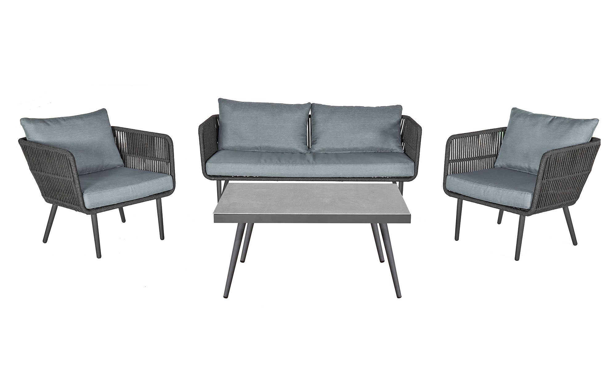 Stativgestelle in Anthrazit verleihen den Gartenmöbeln von LC Garden einen stabilen Stand und unterstreichen ihre moderne Optik. Die Bezüge aus Polyester in Grau sorgen für Eleganz, und auch die ebenfalls graue Tischplatte fügt sich entsprechend gelungen ins Bild. Bitte beachten Sie, dass das Sofa bis ca. 220 kg und der Tisch bis ca. 40 kg belastbar ist!