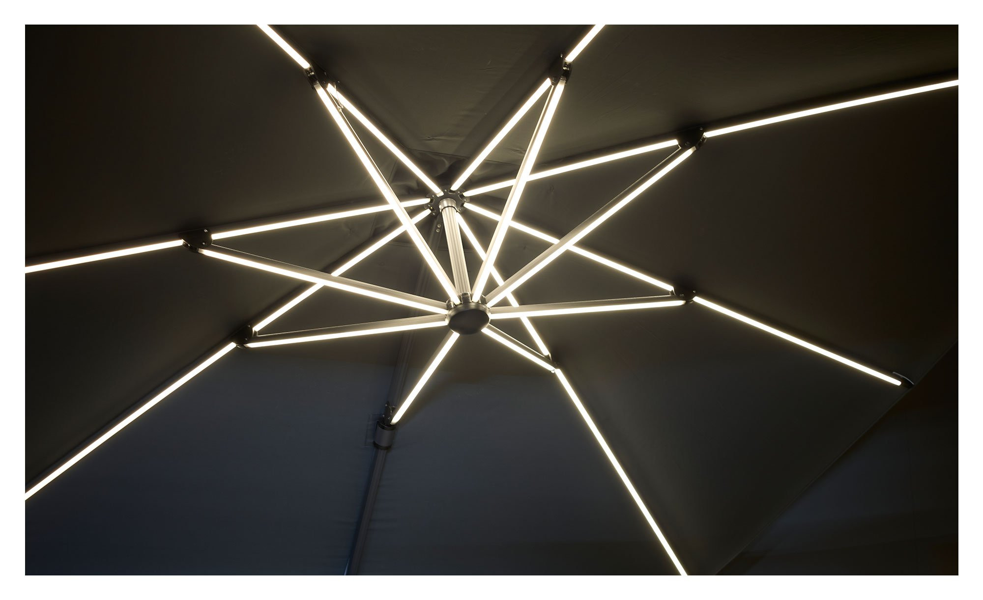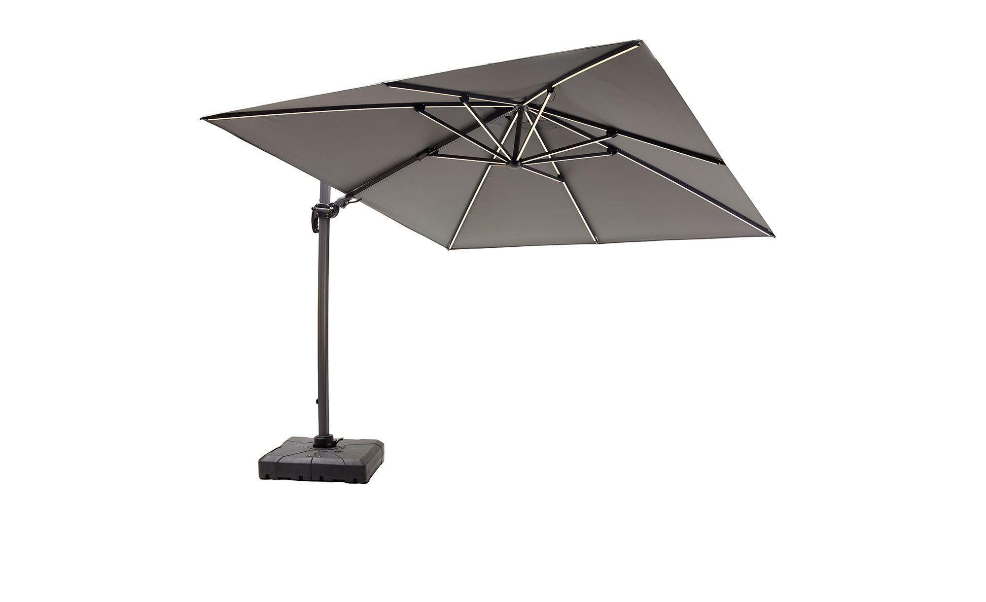 Ein stabiles Gestell aus Aluminium in Anthrazit gewährleistet den stabilen Halt des Ampelschirms mit LED-Solarbeleuchtung. Es ist um 360° drehbar und kann zudem geschwenkt und geknickt werden.
