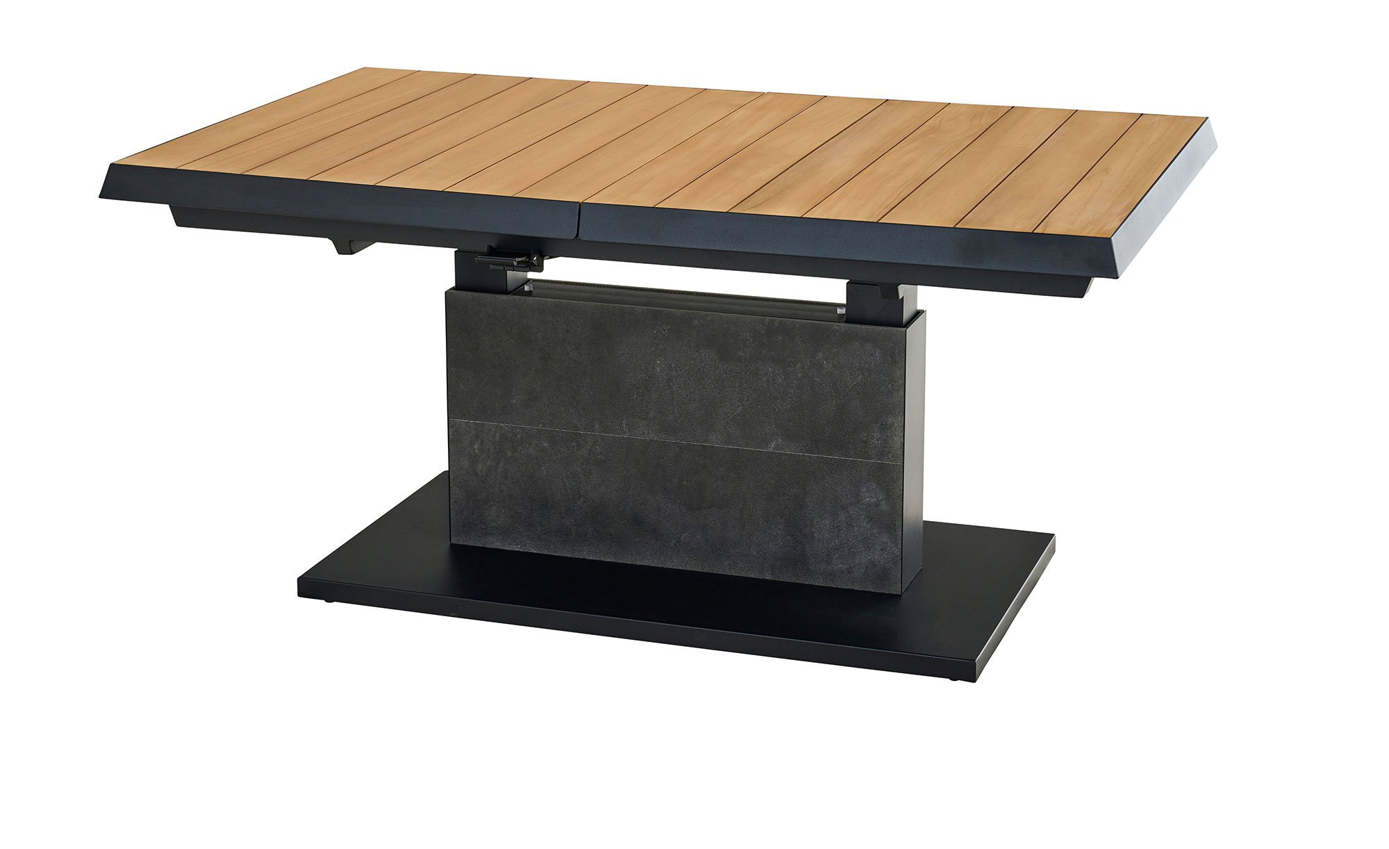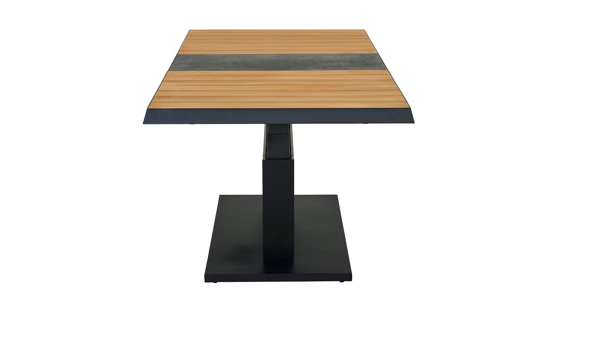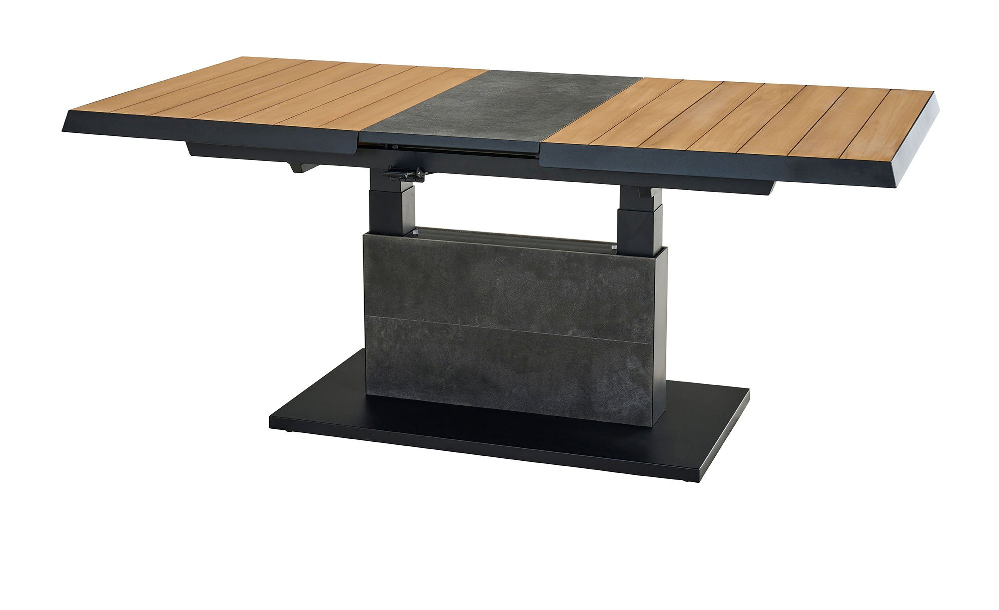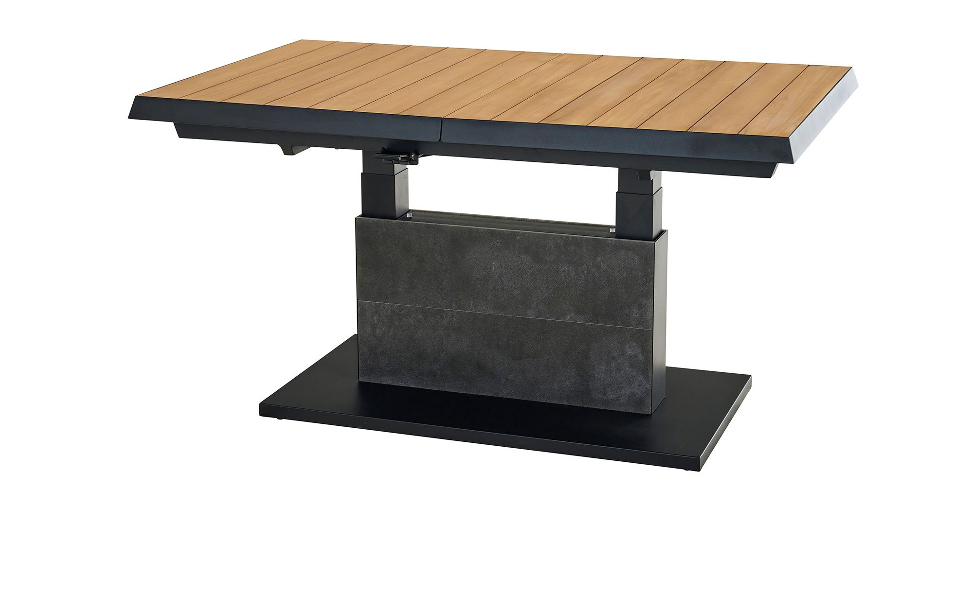Ein massives Säulengestell aus Aluminium fungiert als stabile Basis des Lift-Tischs MONDO La-tea. Es ist in einem edlen, matten Anthrazit gehalten und pulverbeschichtet. Zuverlässig trägt es die rechteckige Platte aus Teakholz. Sie ist ca. 50 mm stark. Mithilfe eines Mittelteils aus Keramik in Dark Grey können Sie die Tischplatte auch ausziehen! Auf diese Weise verlängern Sie das ca. 140 x 52,5 x 90 cm große Möbelstück auf ca. 180 cm. Darüber hinaus ist es stufenlos auf eine Höhe von ca. 77 cm verstellbar.