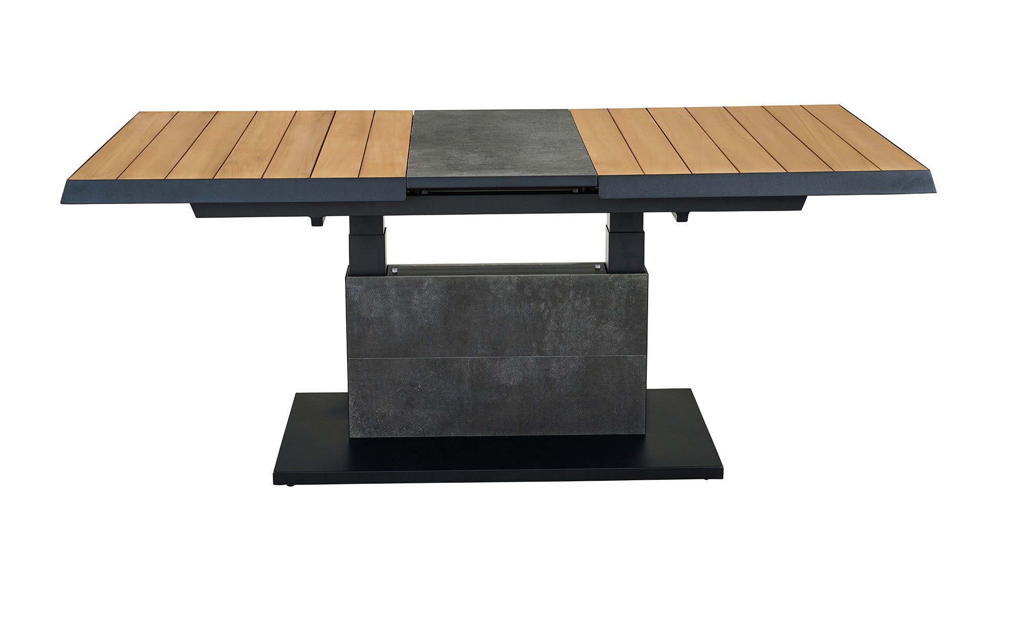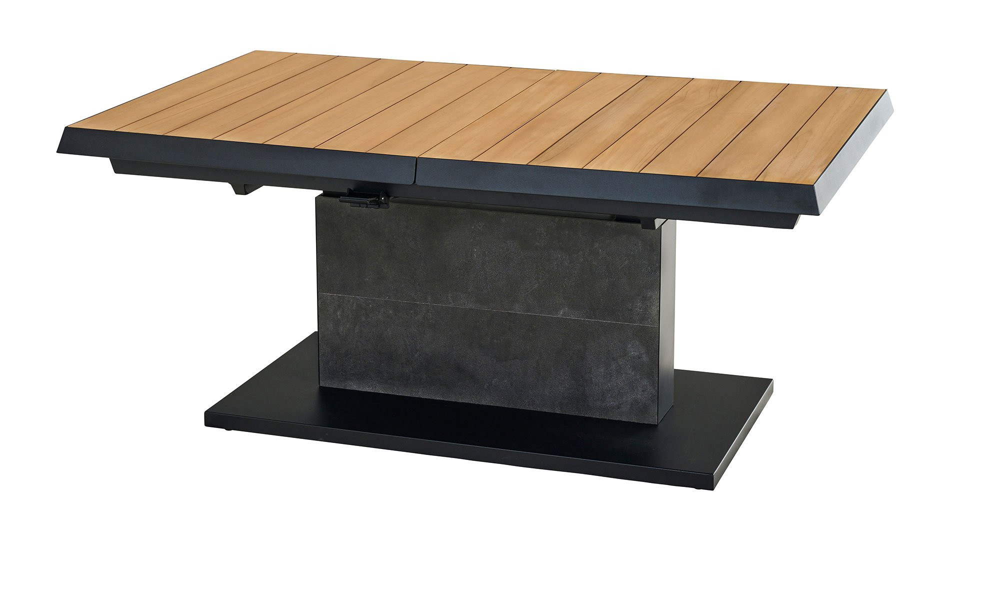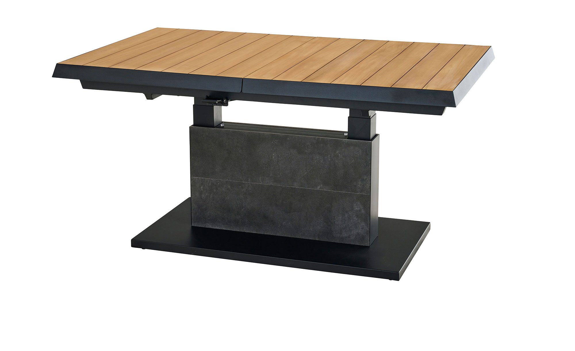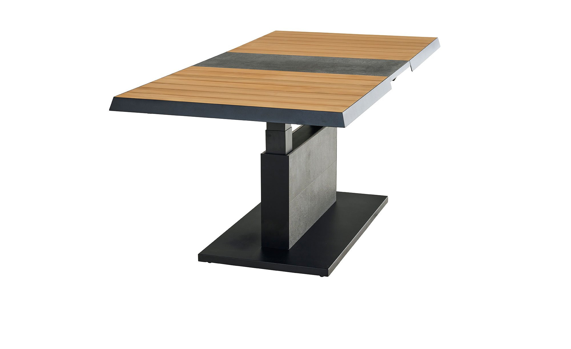 Ein massives Säulengestell aus Aluminium fungiert als stabile Basis des Lift-Tischs MONDO La-tea. Es ist in einem edlen, matten Anthrazit gehalten und pulverbeschichtet. Zuverlässig trägt es die rechteckige Platte aus Teakholz. Sie ist ca. 50 mm stark. Mithilfe eines Mittelteils aus Keramik in Dark Grey können Sie die Tischplatte auch ausziehen! Auf diese Weise verlängern Sie das ca. 140 x 52,5 x 90 cm große Möbelstück auf ca. 180 cm. Darüber hinaus ist es stufenlos auf eine Höhe von ca. 77 cm verstellbar.