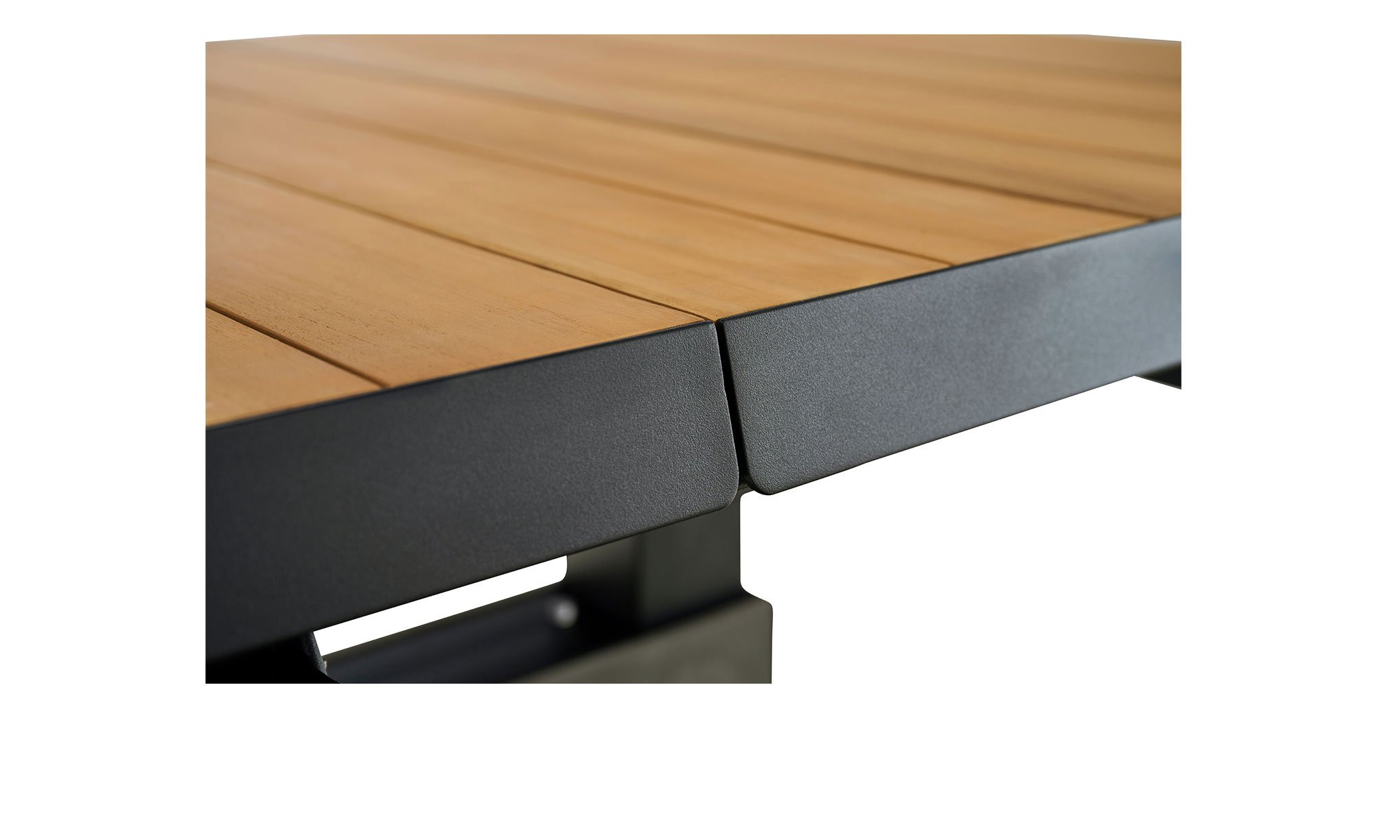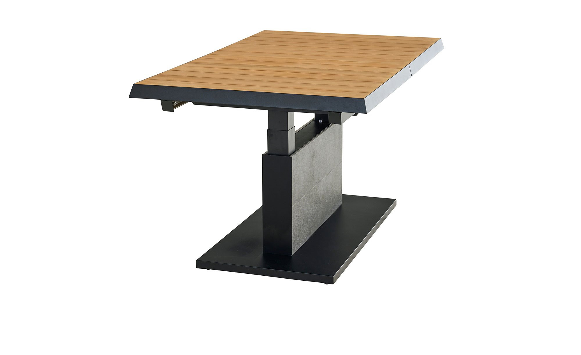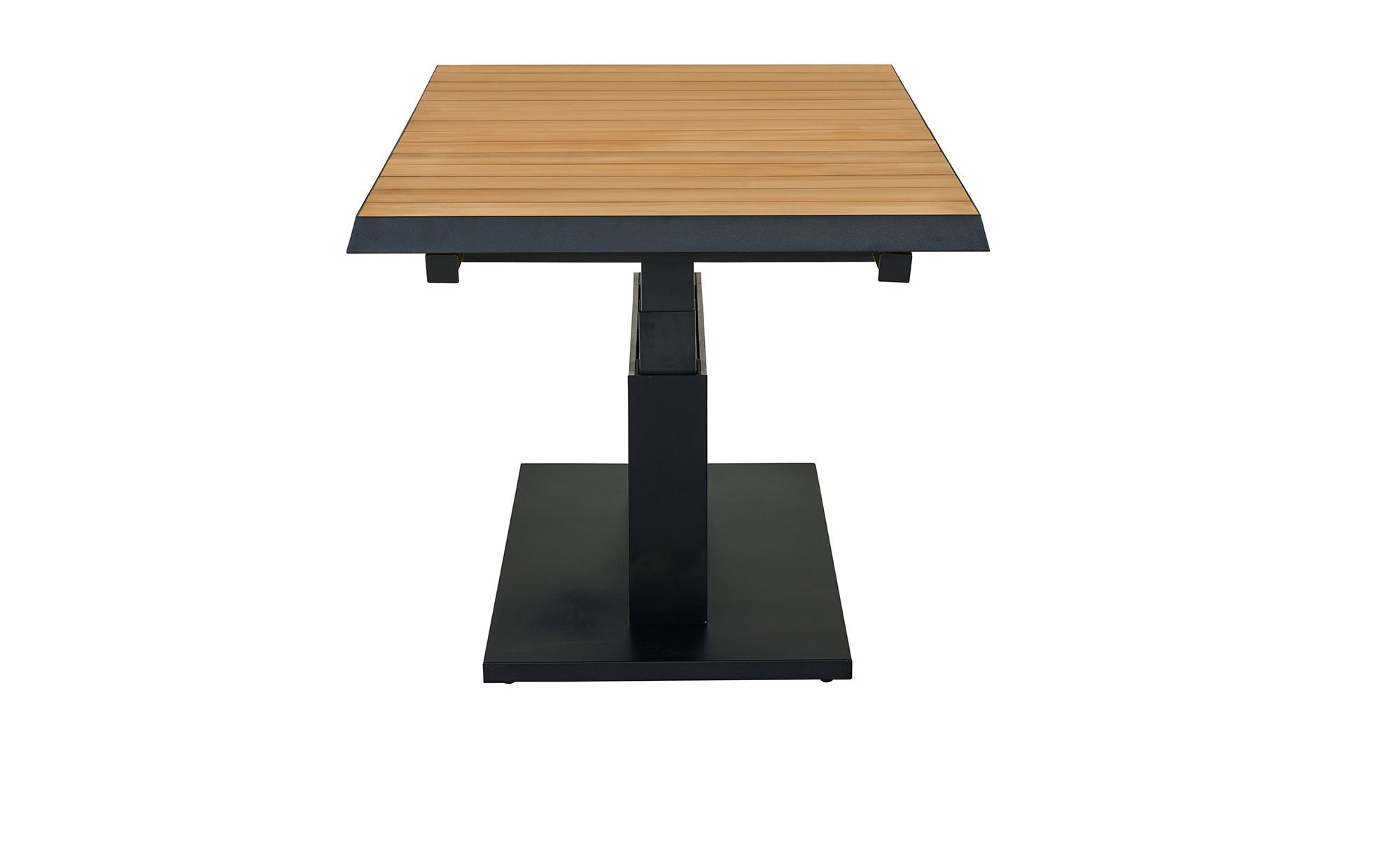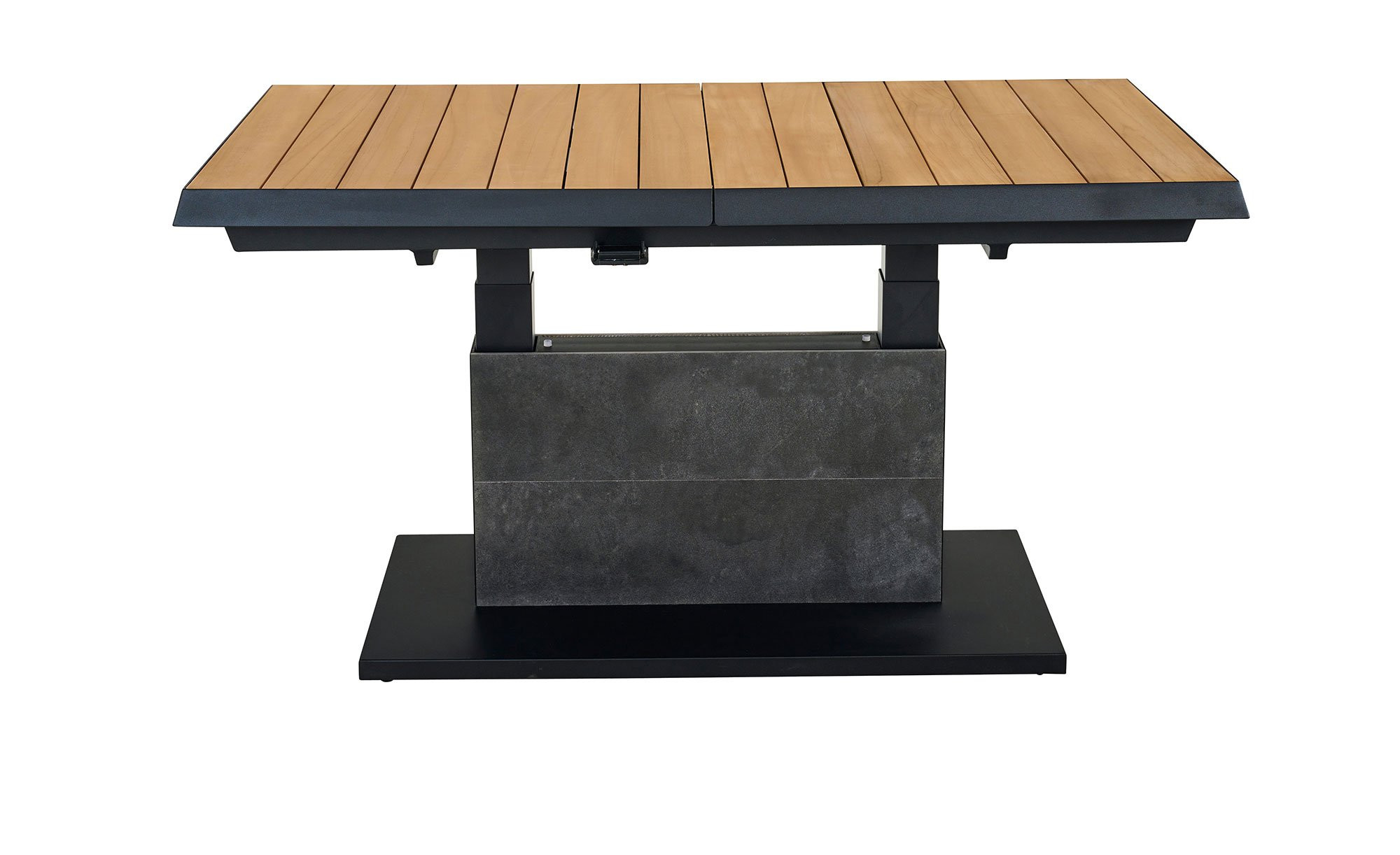 Ein massives Säulengestell aus Aluminium fungiert als stabile Basis des Lift-Tischs MONDO La-tea. Es ist in einem edlen, matten Anthrazit gehalten und pulverbeschichtet. Zuverlässig trägt es die rechteckige Platte aus Teakholz. Sie ist ca. 50 mm stark. Mithilfe eines Mittelteils aus Keramik in Dark Grey können Sie die Tischplatte auch ausziehen! Auf diese Weise verlängern Sie das ca. 140 x 52,5 x 90 cm große Möbelstück auf ca. 180 cm. Darüber hinaus ist es stufenlos auf eine Höhe von ca. 77 cm verstellbar.