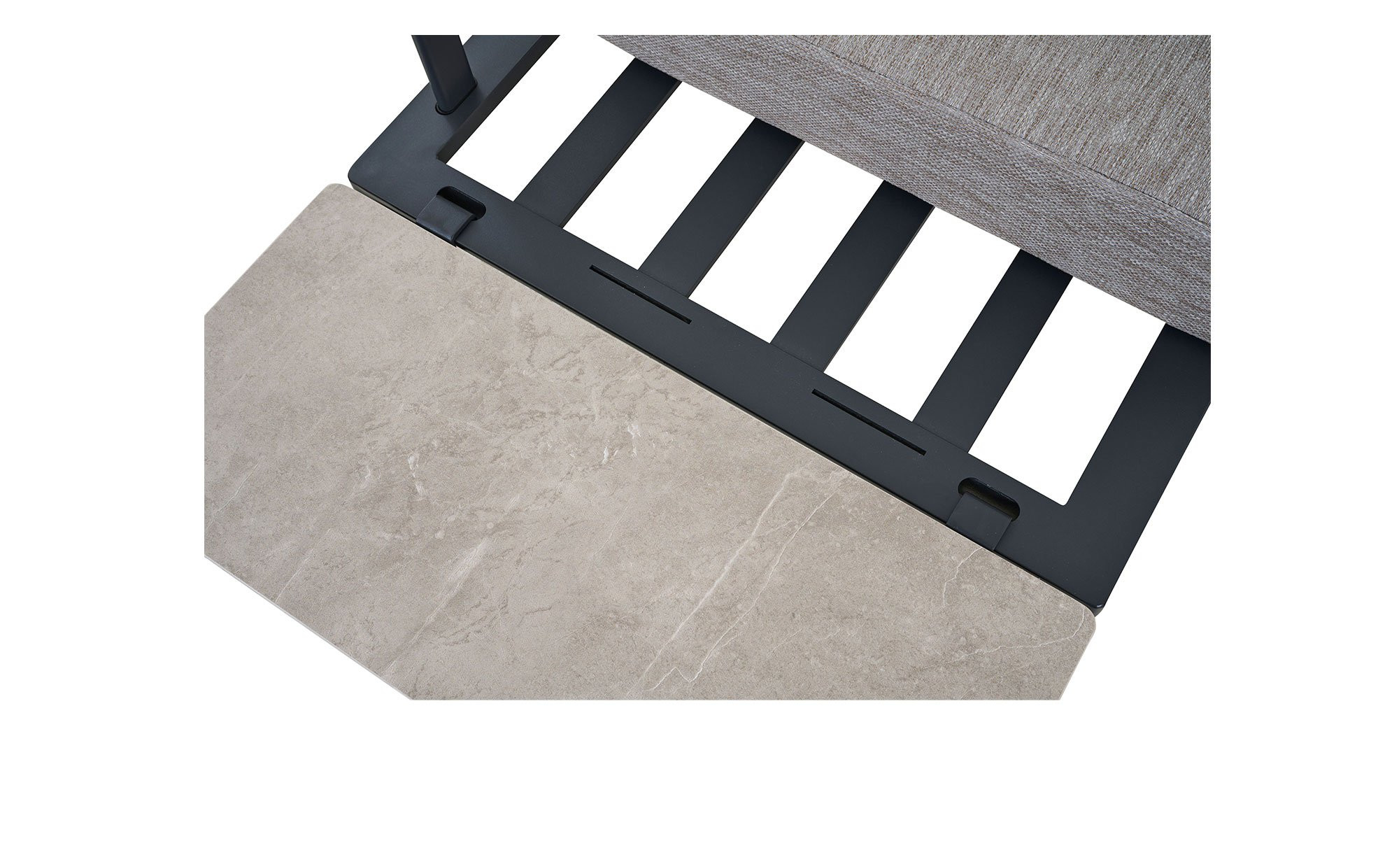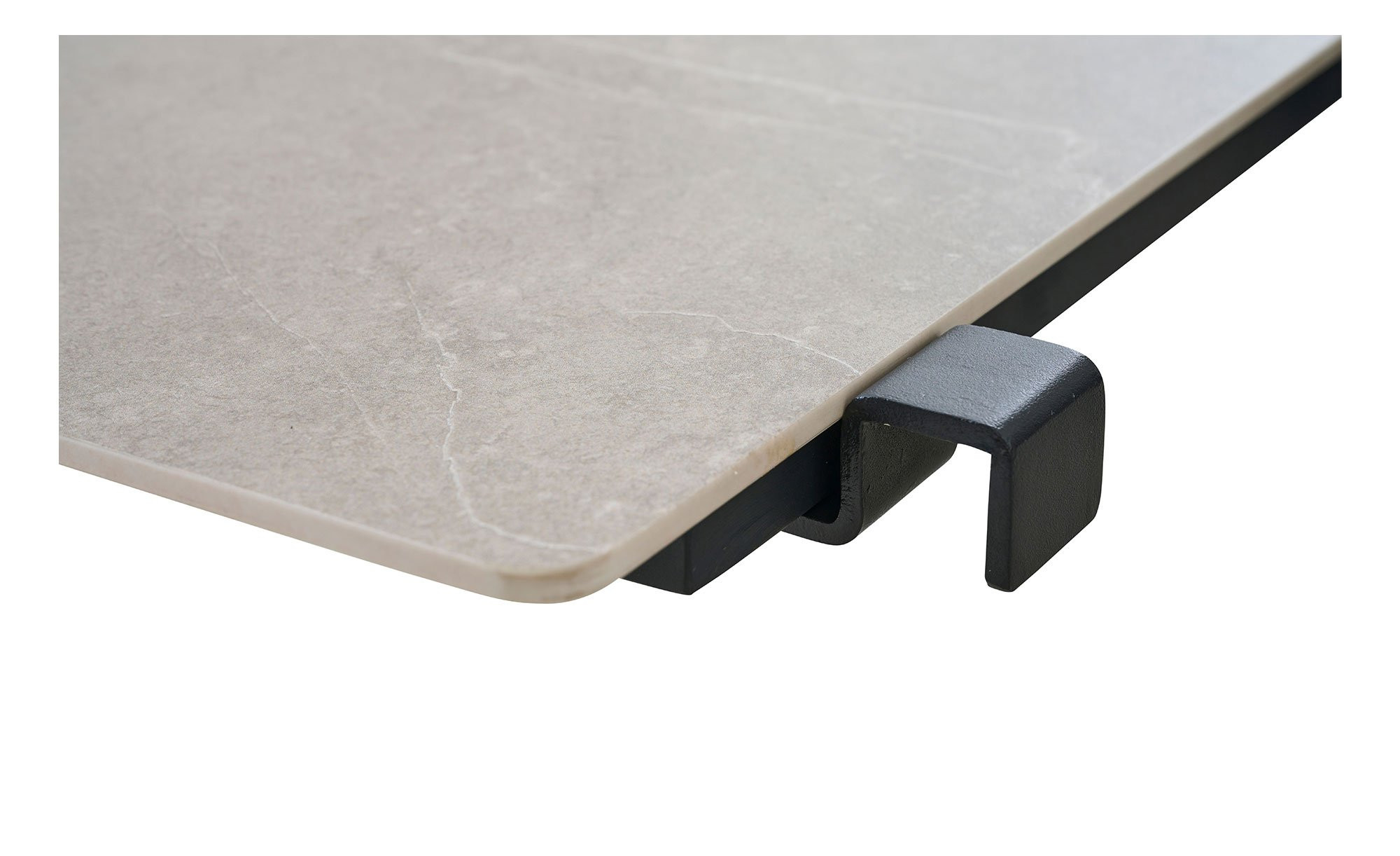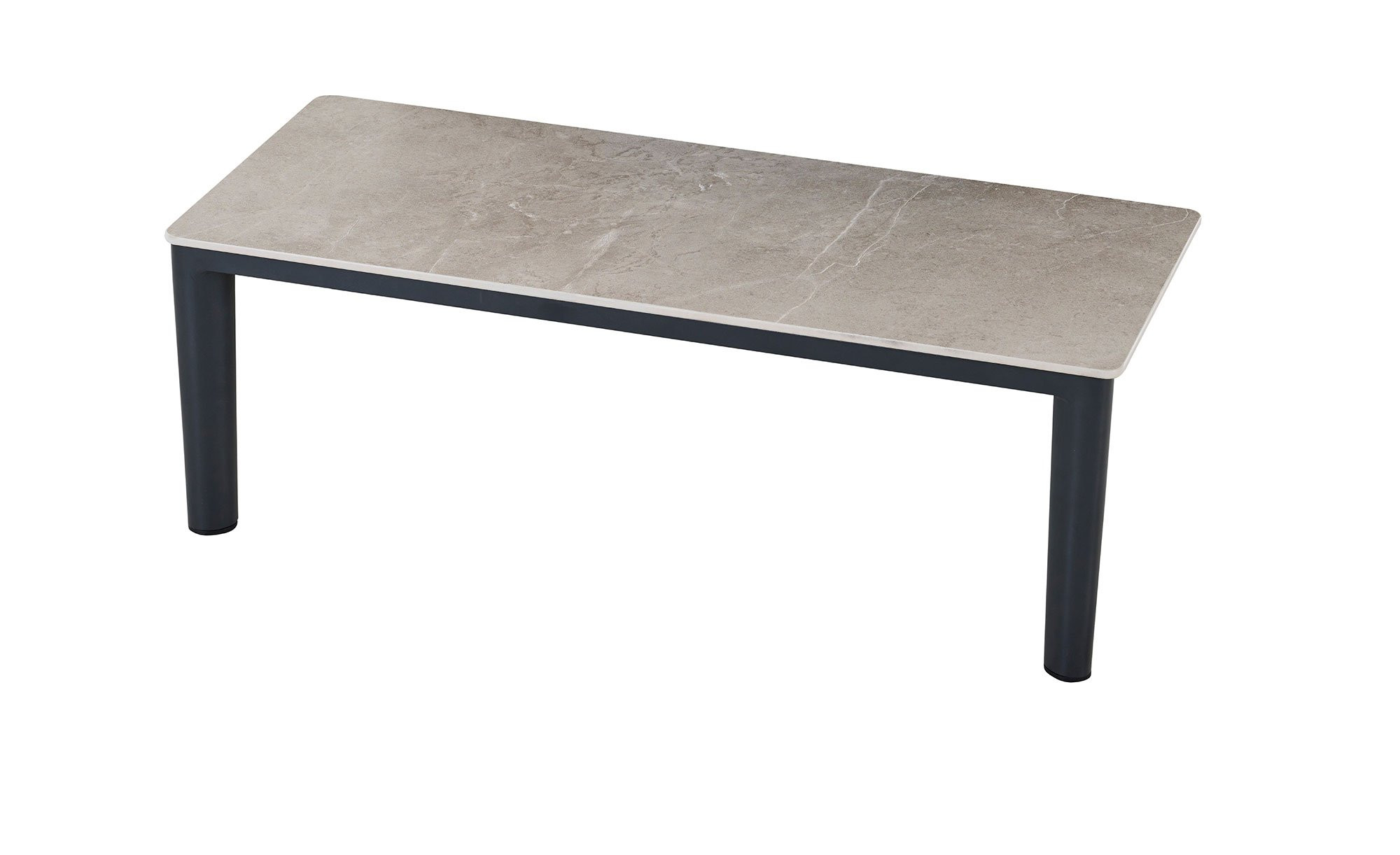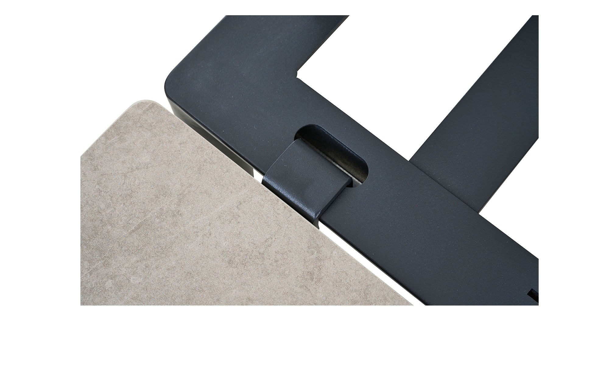 Der praktisch positionierbare Seitentisch von MONDO verfügt über eine rechteckige Platte aus Sinterstein. Sie ist in einer hellen Beton-Optik gestaltet und passt somit sehr gut zum vierfüßigen Aluminiumgestell mit Pulverbeschichtung in mattem Anthrazit.