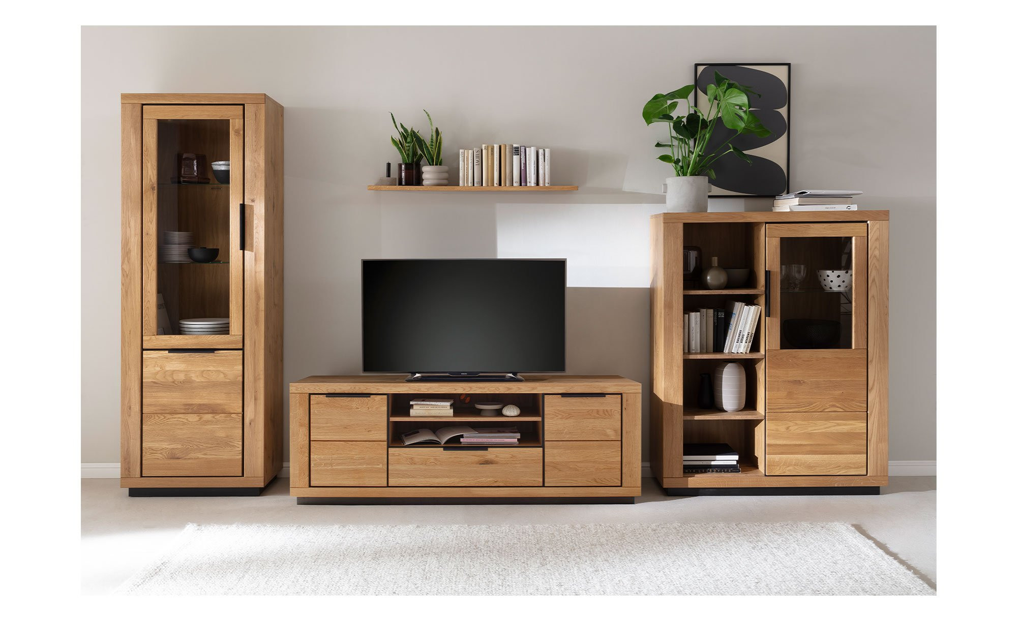 Der ca. 183 x 65 x 54 cm große Artikel verfügt über einen Korpus aus Holzwerkstoff. Dieser ist in der Farbe Eiche-Nachbildung gestaltet. Hinzu kommt massive, geölte Wildeiche mit durchgehender Lamelle an der Vorderseite sowie massive Wildeiche-Absetzungen. Auch das Innendekor ist in einem passenden Look gehalten. Als Fuß fungiert hingegen ein schwarzer Sockel aus Holzwerkstoff und auch die schwarzen Metallgriffe mit Pulverbeschichtung bilden gelungene Kontraste.