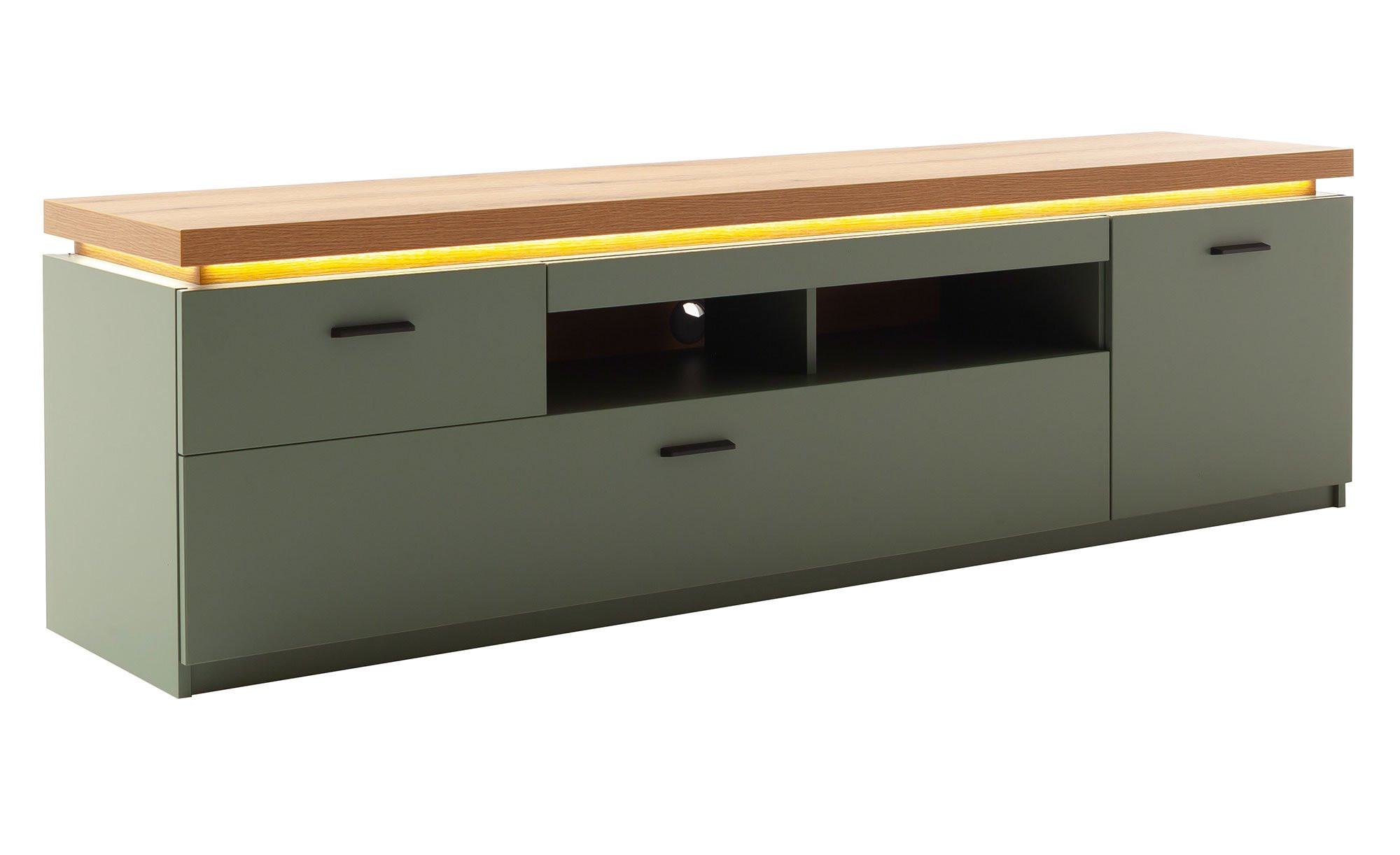 Mittig in der Fachrückwand erwartet Sie ein praktischer Kabeldurchlass, zusätzlich sorgt eine LED-Beleuchtung am Oberboden für eine ansprechende Lichtstimmung im Raum. Schwarze Kunststofffüße garantieren den stabilen Stand, während schwarzgraue Metallgriffe das Erscheinungsbild stilvoll abrunden.