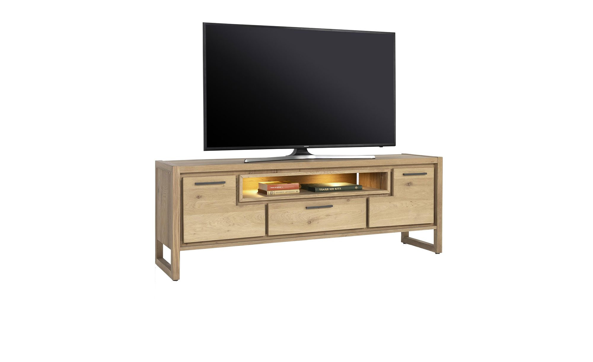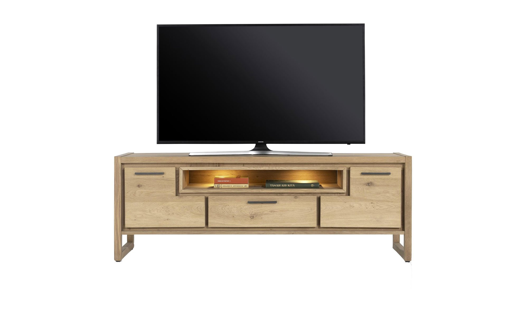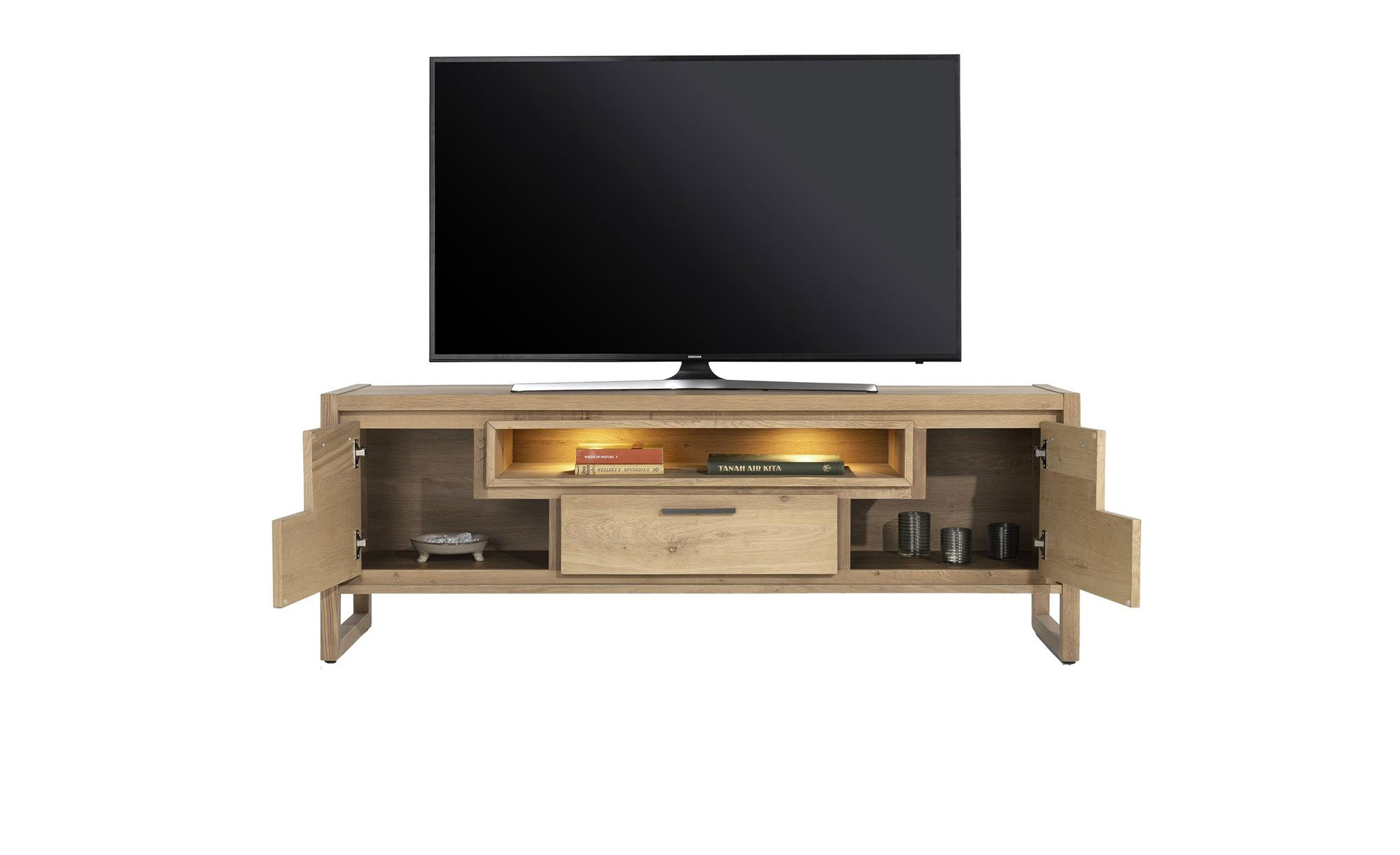 Jede Menge Stauraum erwartet Sie hinter den beiden gedämpften Türen, in einem Soft-Close-Schubkasten sowie im offenen Fach an der Vorderseite. Zudem entsteht der perfekte Rahmen zum Aufstellen eines TV-Geräts.