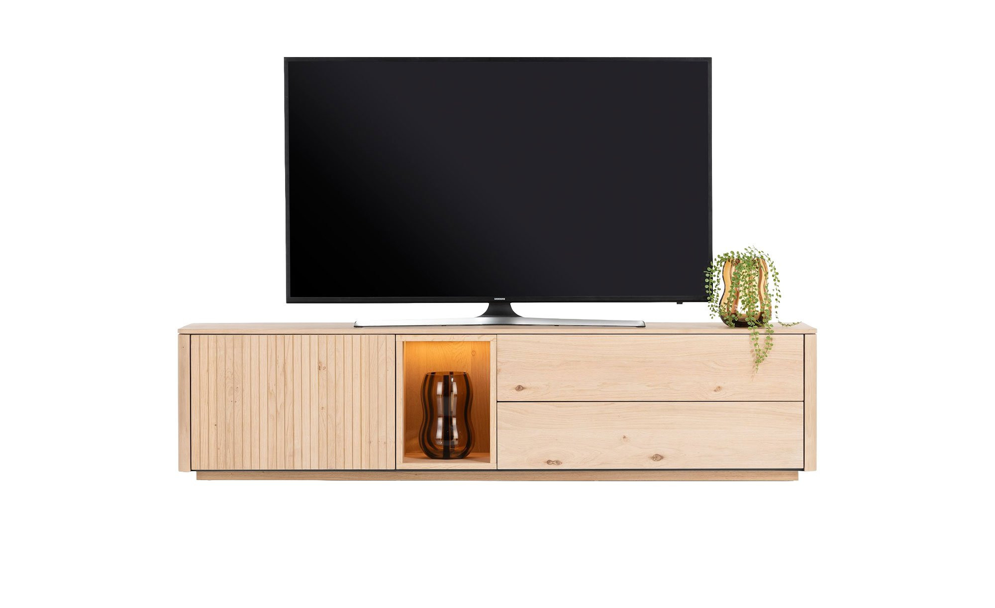 Hinter einer Tür erwartet Sie bei dem Lowboard Trenton ein Innenbereich mit integriertem Boden. Daneben befindet sich ein offenes Fach mit integrierter LED-Beleuchtung für eine stimmungsvolle Illumination. Abgerundet wird das Platzangebot durch zwei Schubladen. Dank eines Push-to-Open-Systems erfolgten das Öffnen und Schließen der Elemente sehr geräuscharm.