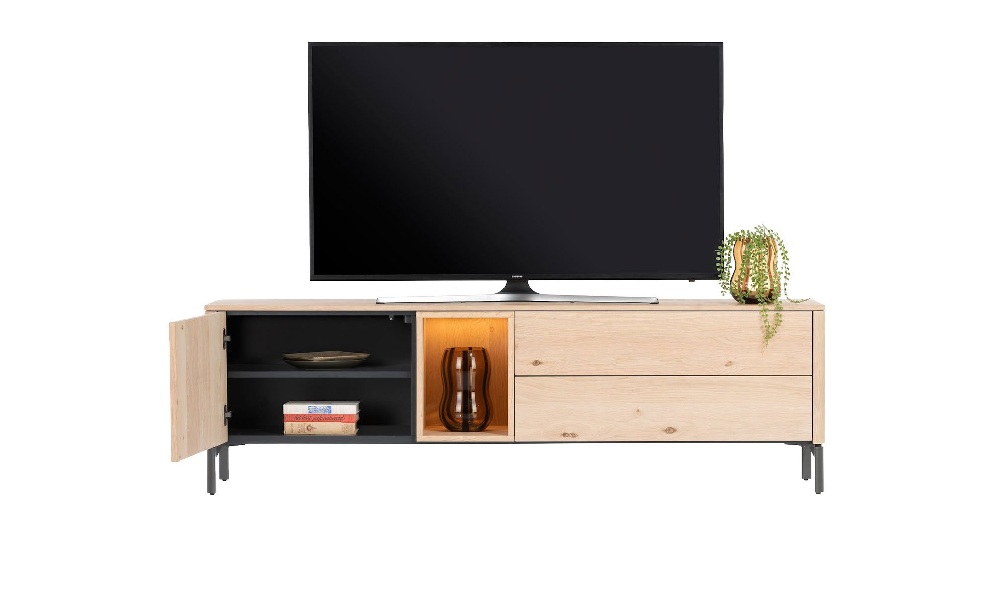 Front und Korpus des ca. 180 x 56 x 42 cm großen Möbelstücks begeistern mit einem natürlichen Furnier aus echter Eiche. Zum Teil ist dieses in einem ansprechenden Lamellenmuster gestaltet. Für einen modernen Einfluss sorgt das stabile Metallgestell mit Füßen im Farbton Graphit.