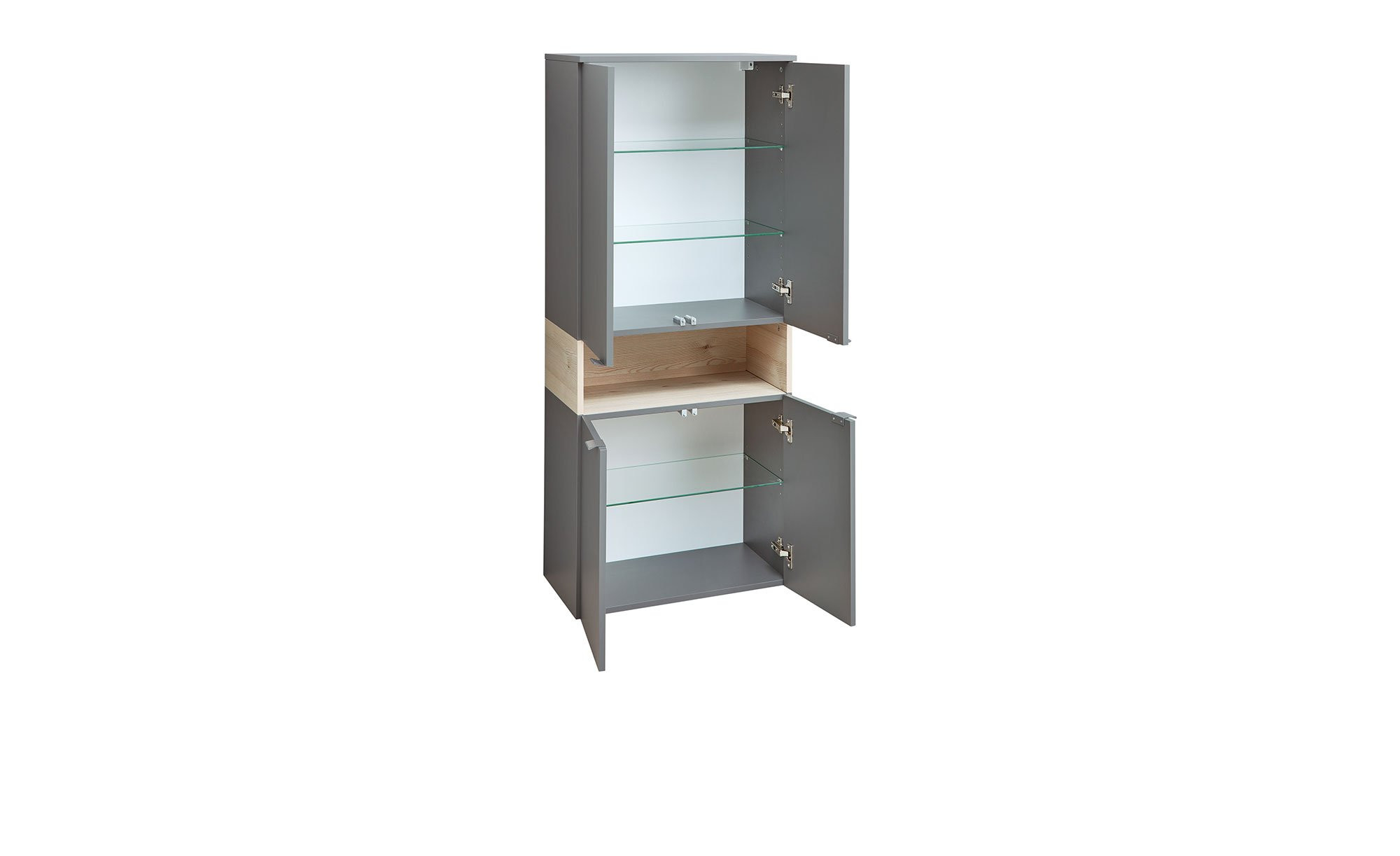 Zum ca. 60 x 142 x 33 cm großen Schrank gehören auch quarzgraue Griffe, mit denen Sie die vier gedämpften Türen problemlos öffnen und schließen können. Mittig dazwischen befindet sich ein großes offenes Fach, im Innern wurden drei Einlegeböden integriert.