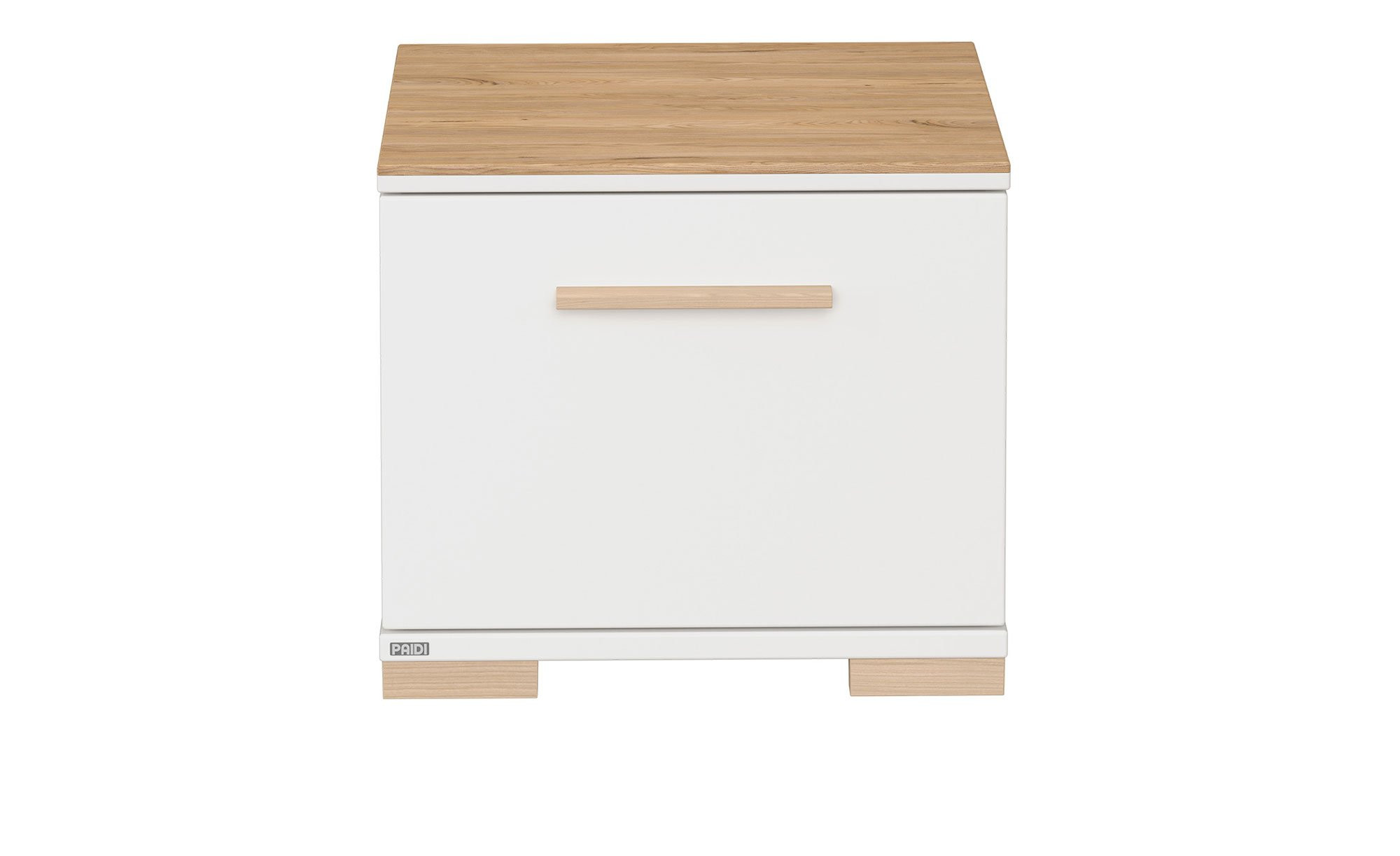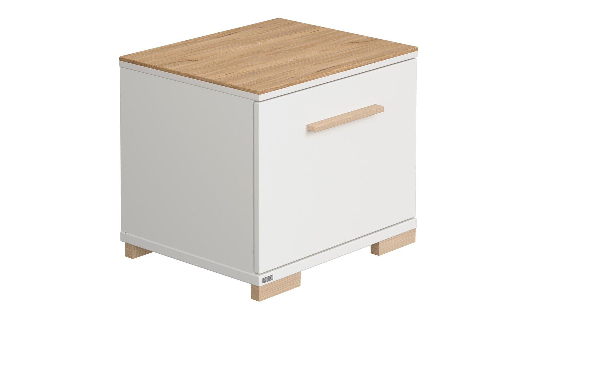 Front und Korpus des ca. 48 x 42 x 40 cm großen Möbelstücks bestehen aus Holzwerkstoff. Während letzterer mit einem natürlichen Eiche Montana Dekor begeistert, ist die Vorderseite in Off-White gehalten. Der natürliche Holz-Look findet sich hingegen auch an der Deckplatte, den Füßen und dem Griff wieder.