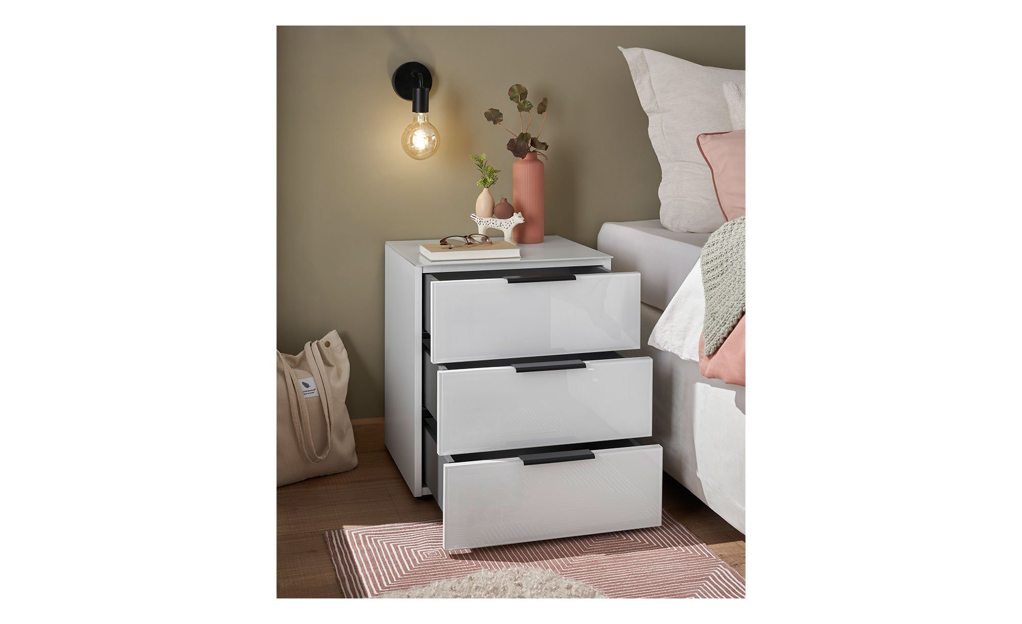 Als gelungener Akzent wirken die schwarzen Kunststoffgriffe, mit deren Hilfe sich die drei integrierten Schubkästen problemlos öffnen und schließen lassen.