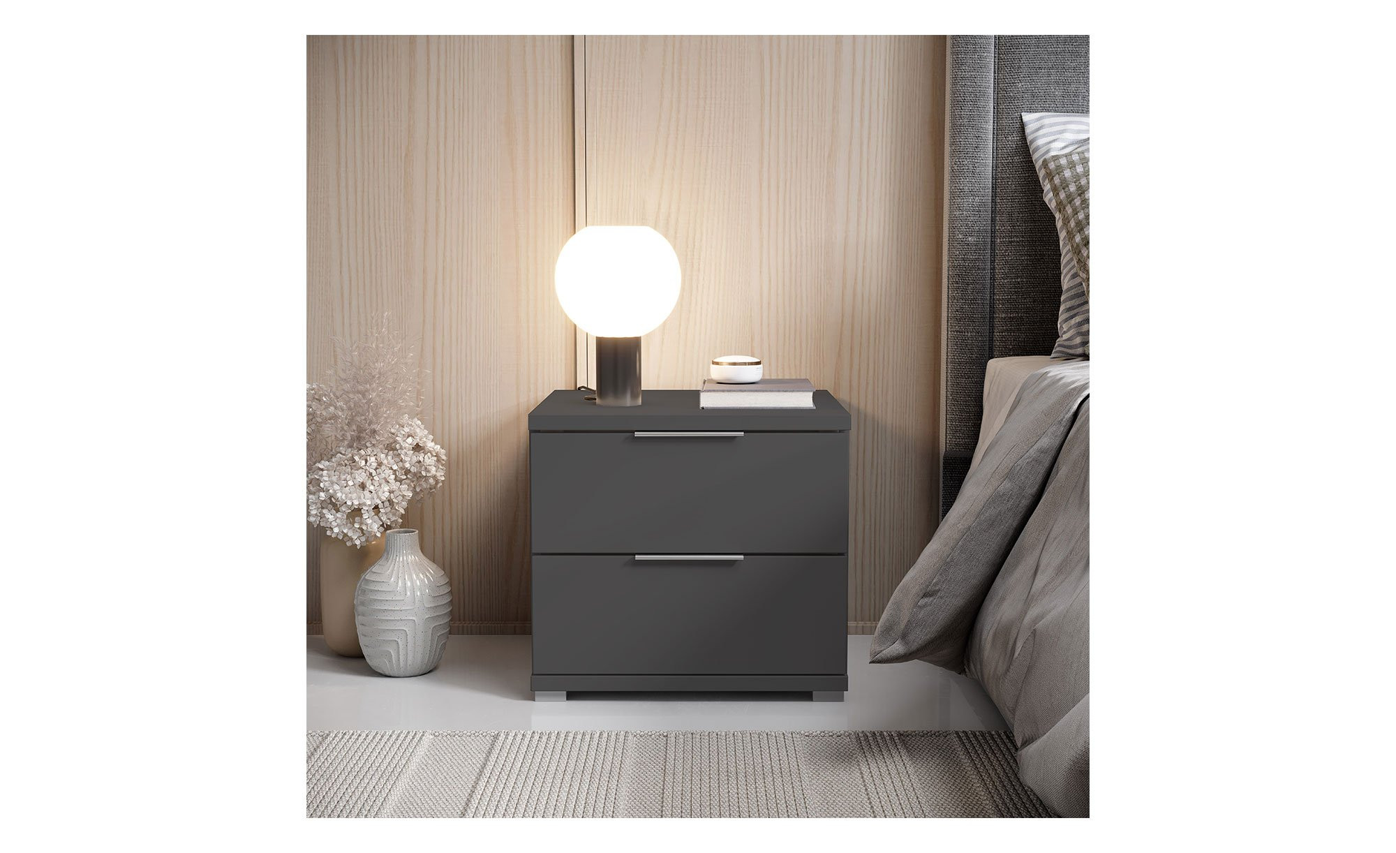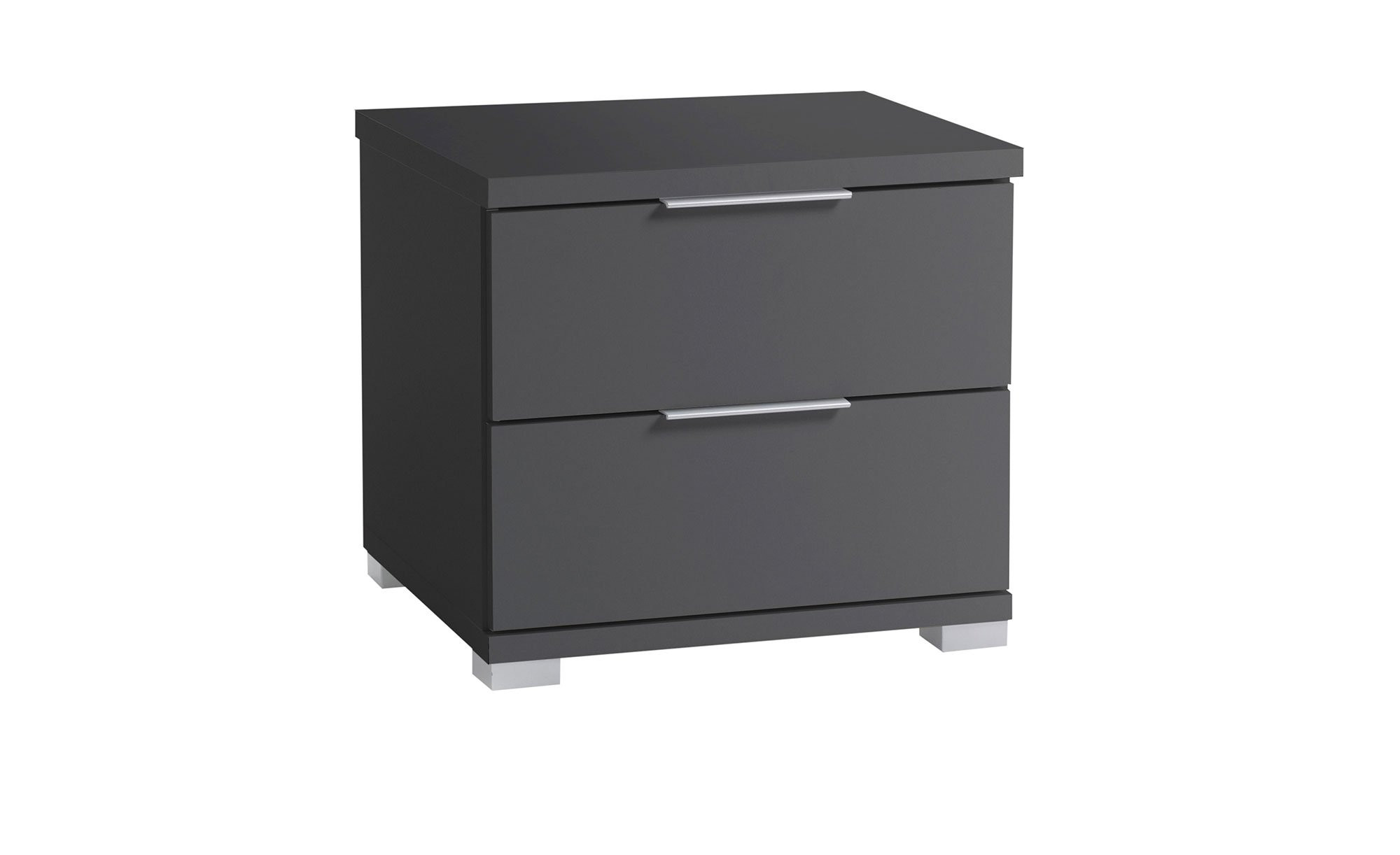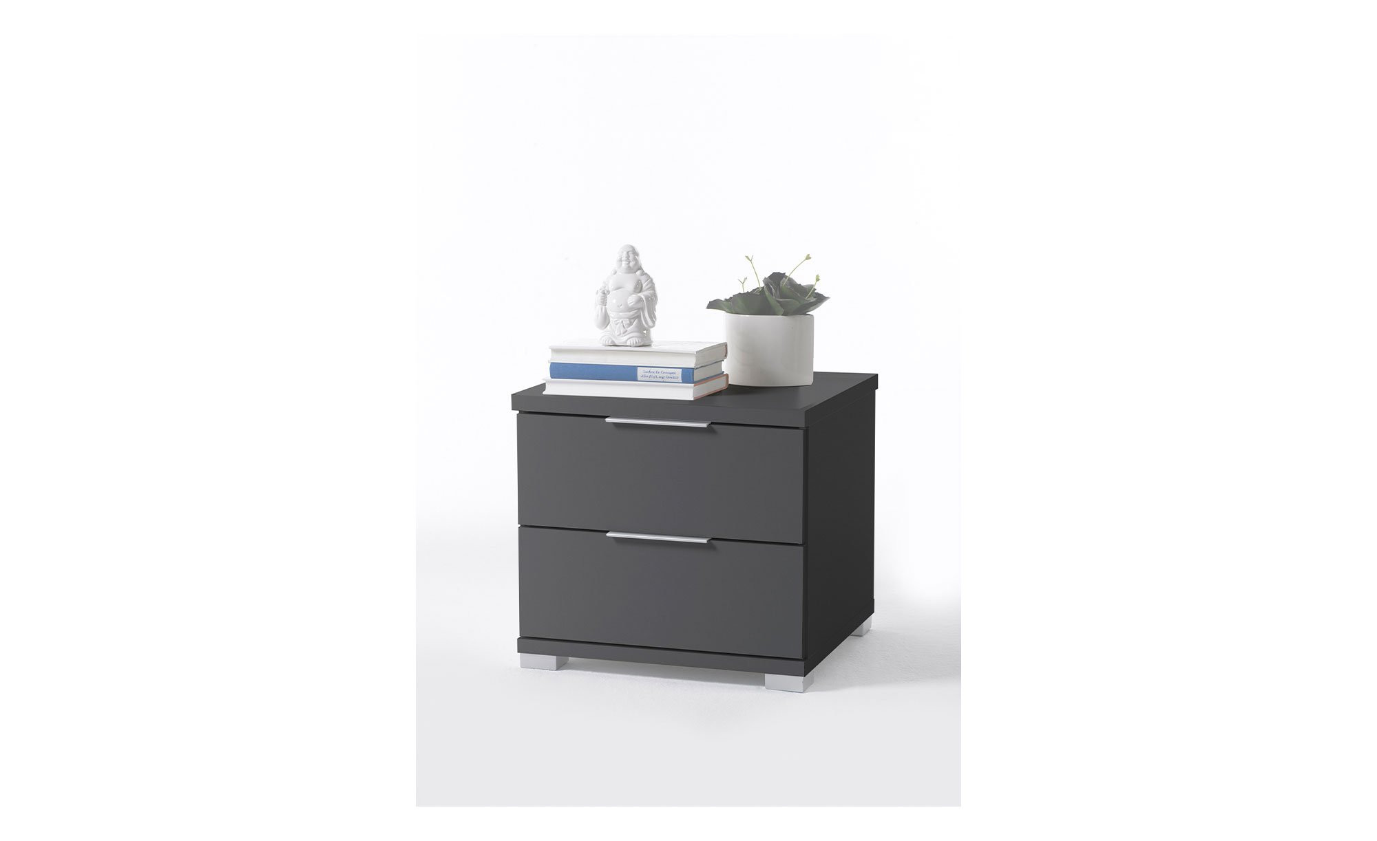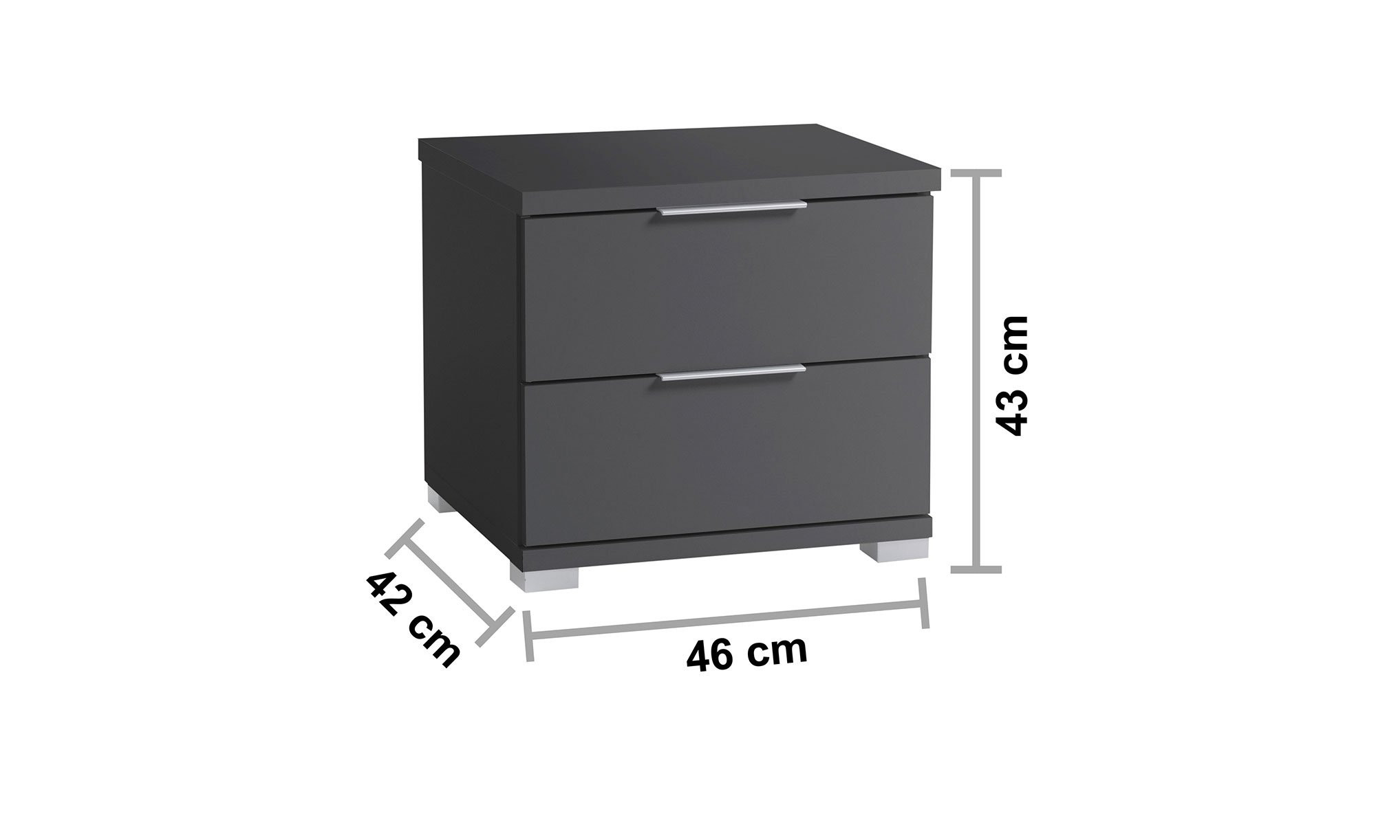 Die alufarbenen Füße und Kunststoffgriffe setzen Akzente und sorgen für eine stimmige Optik. Zwei Schubkästen bieten zudem Platz für alles, was Sie nachts griffbereit haben möchten.