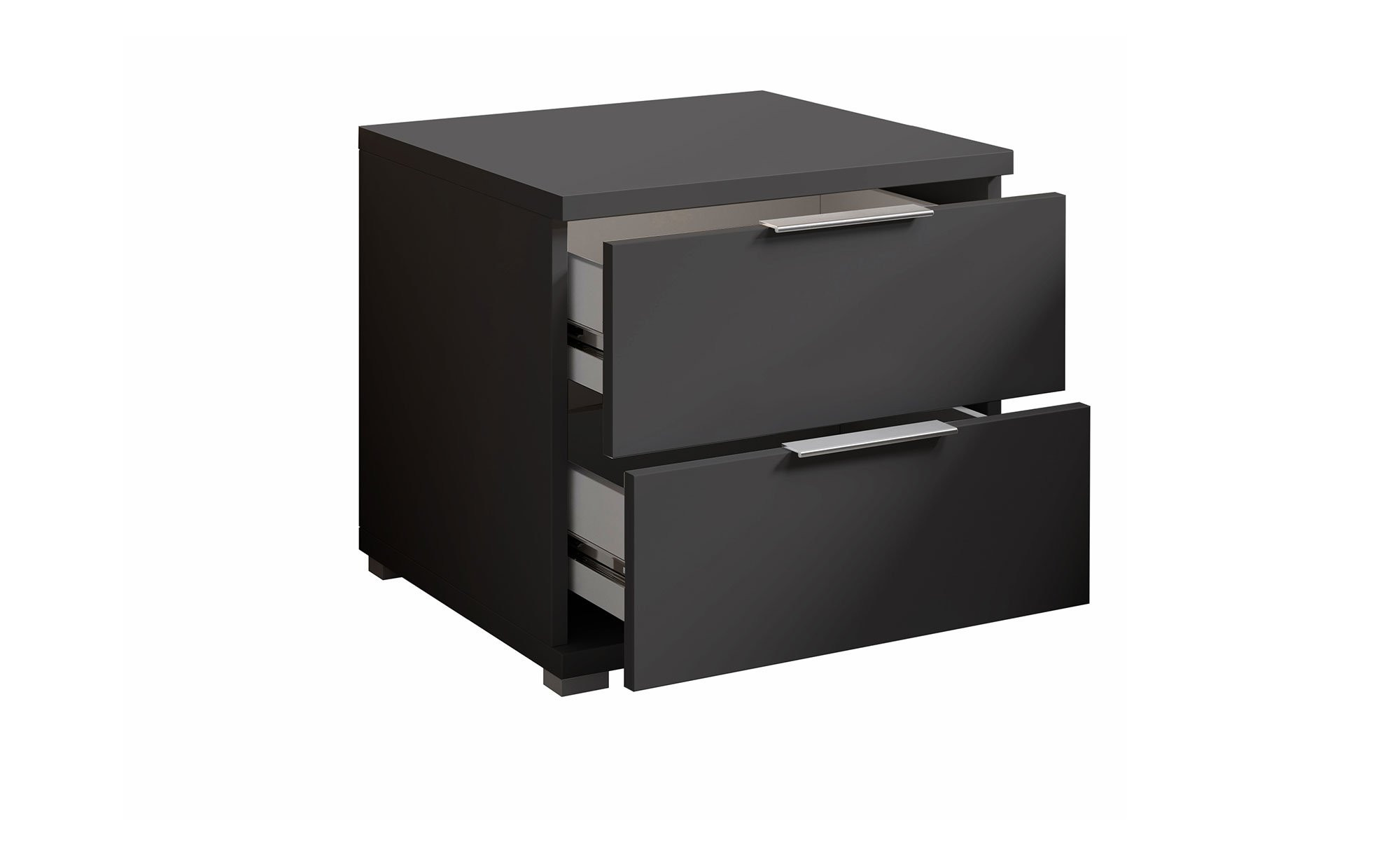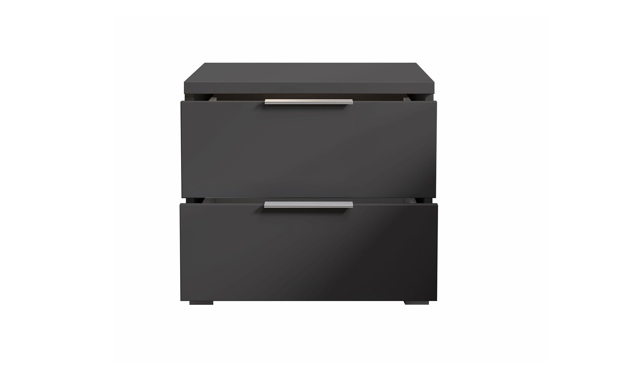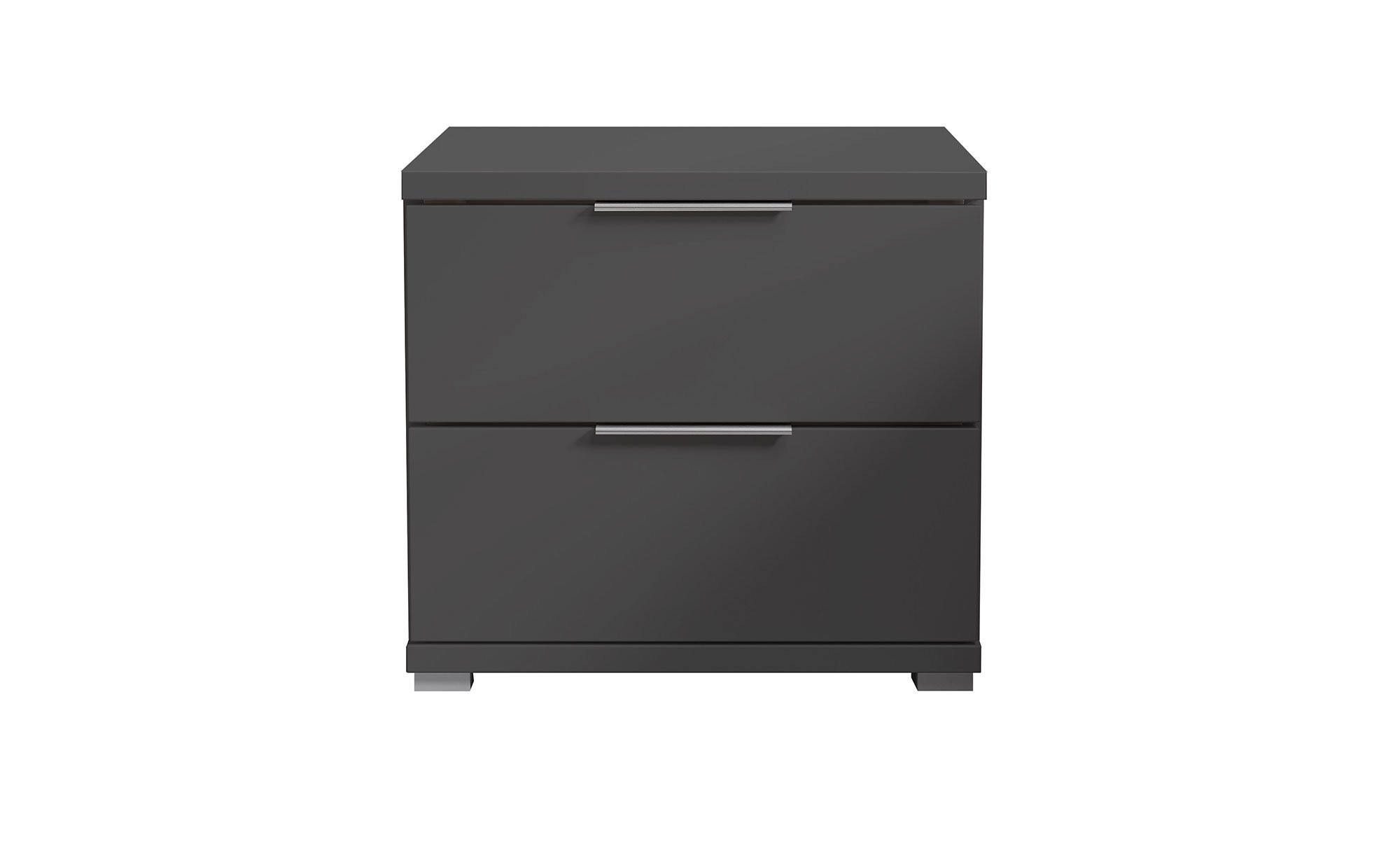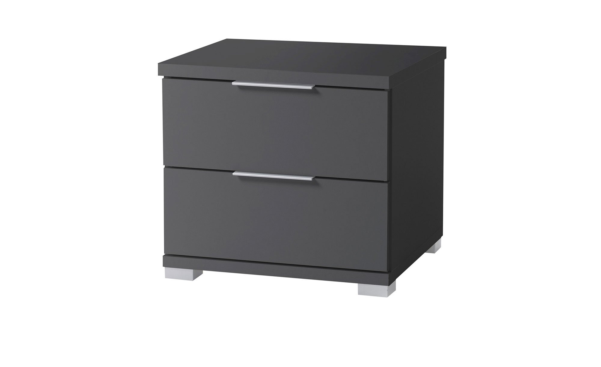 Die alufarbenen Füße und Kunststoffgriffe setzen Akzente und sorgen für eine stimmige Optik. Zwei Schubkästen bieten zudem Platz für alles, was Sie nachts griffbereit haben möchten.