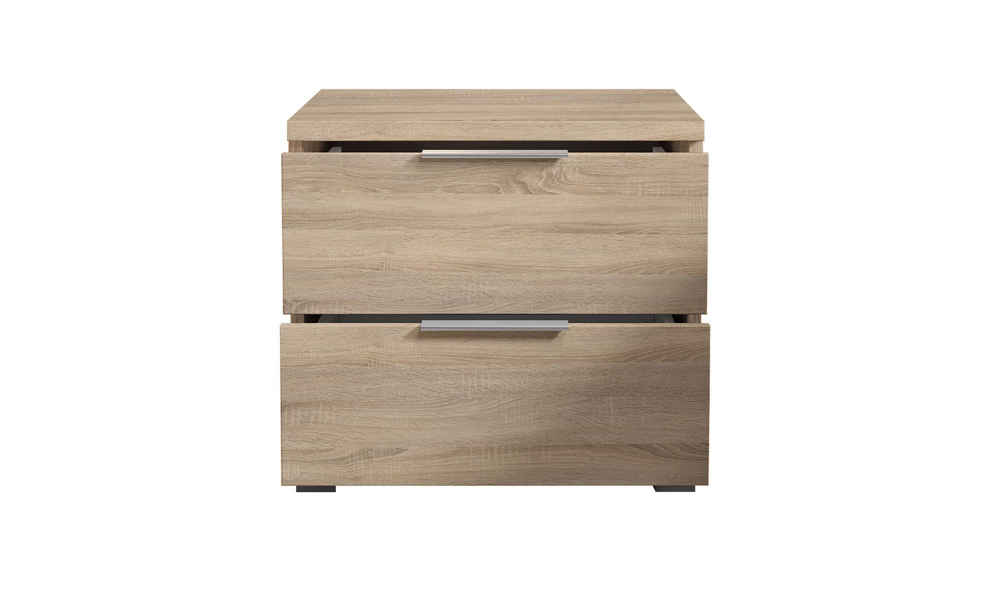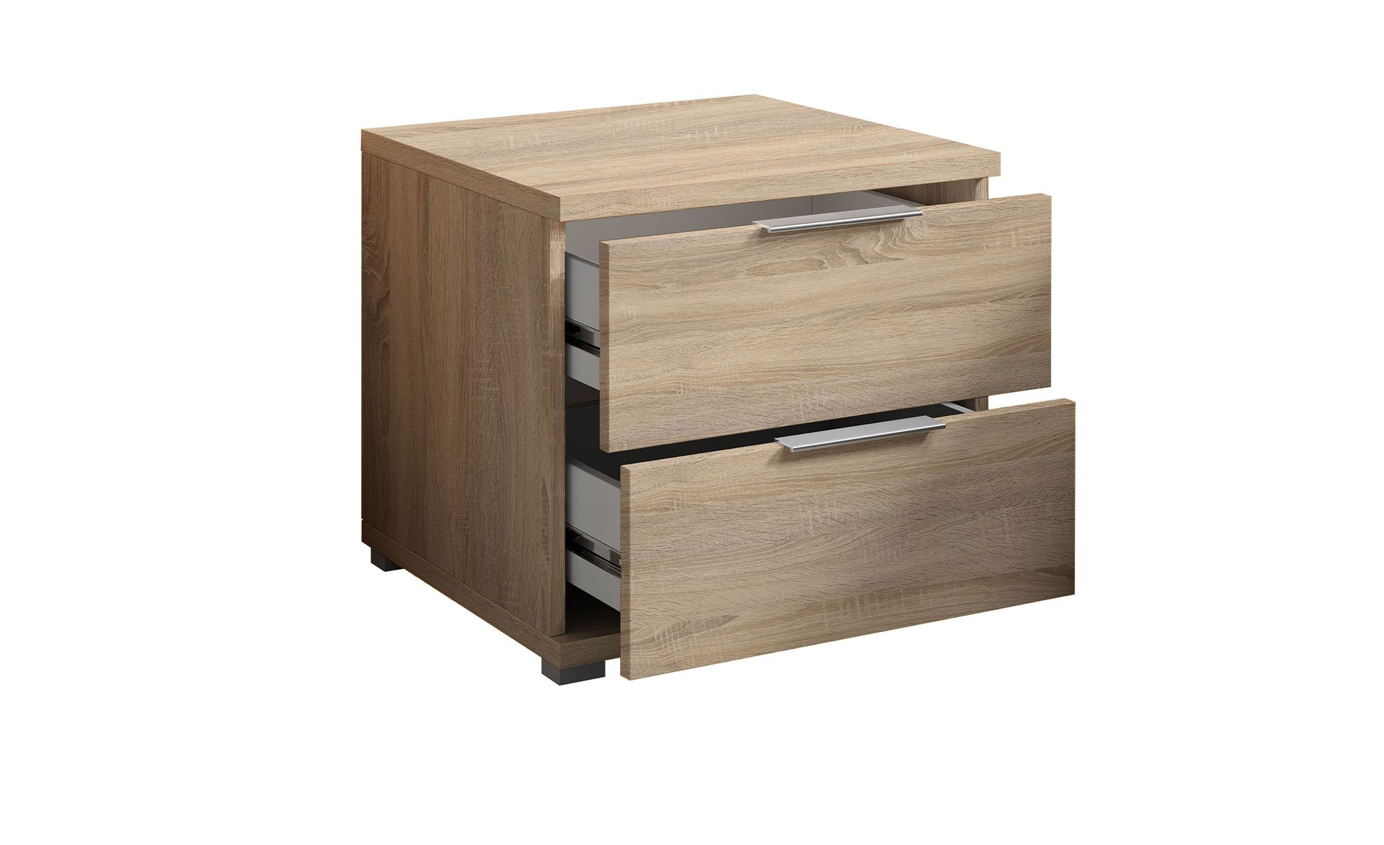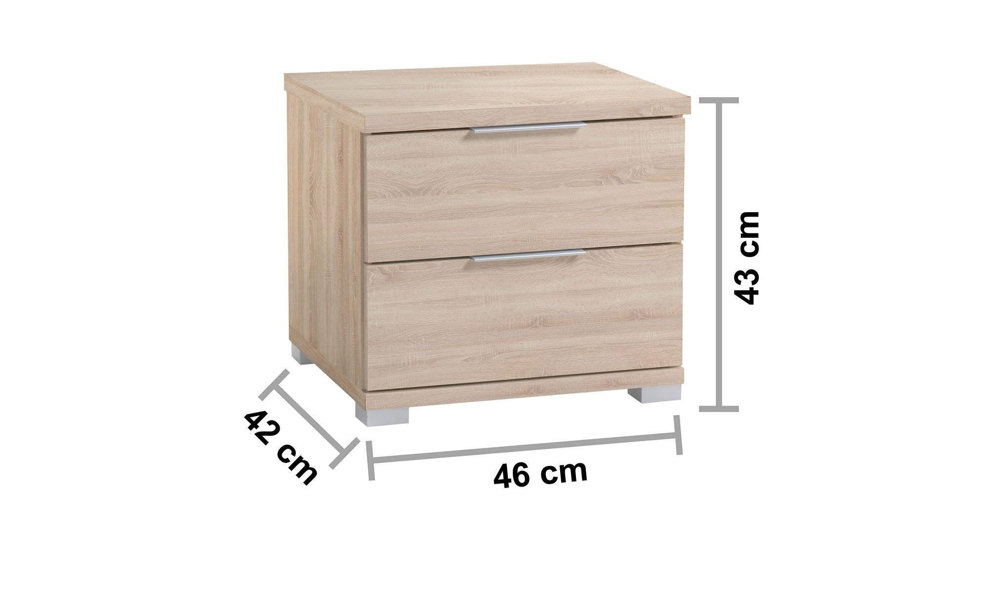 Ein Format von ca. 46 x 43 x 42 cm macht das Möbelstück zum vielseitigen Begleiter. Es besteht aus Holzwerkstoff in einem natürlichen Eiche Sonoma Dekor. Das Innendekor ist ebenfalls in diesem Holz-Ton gestaltet und verfügt zusätzlich über weiße Bestandteile. Eine Melaminharz-Beschichtung schützt Front und Korpus vor Gebrauchsspuren.