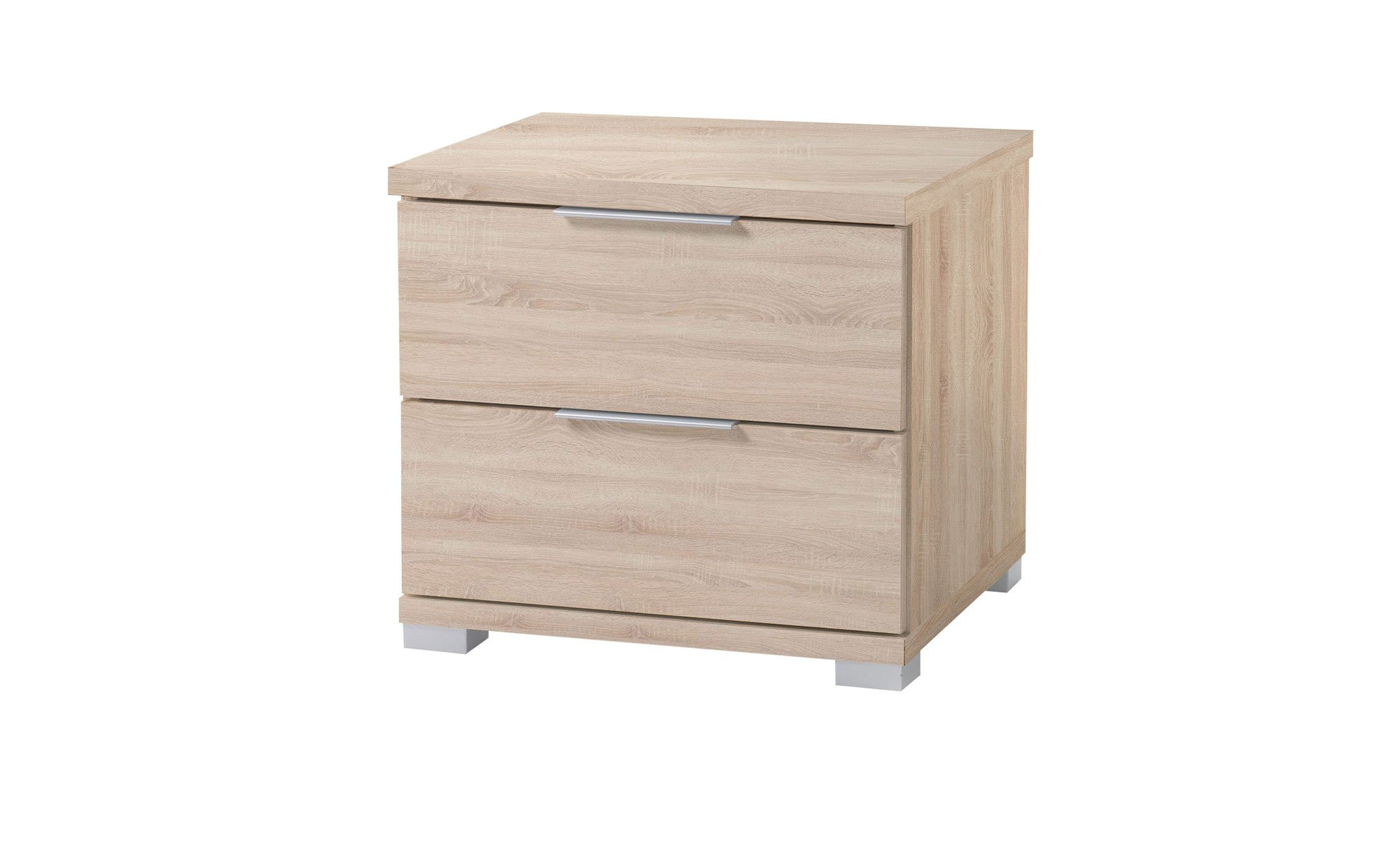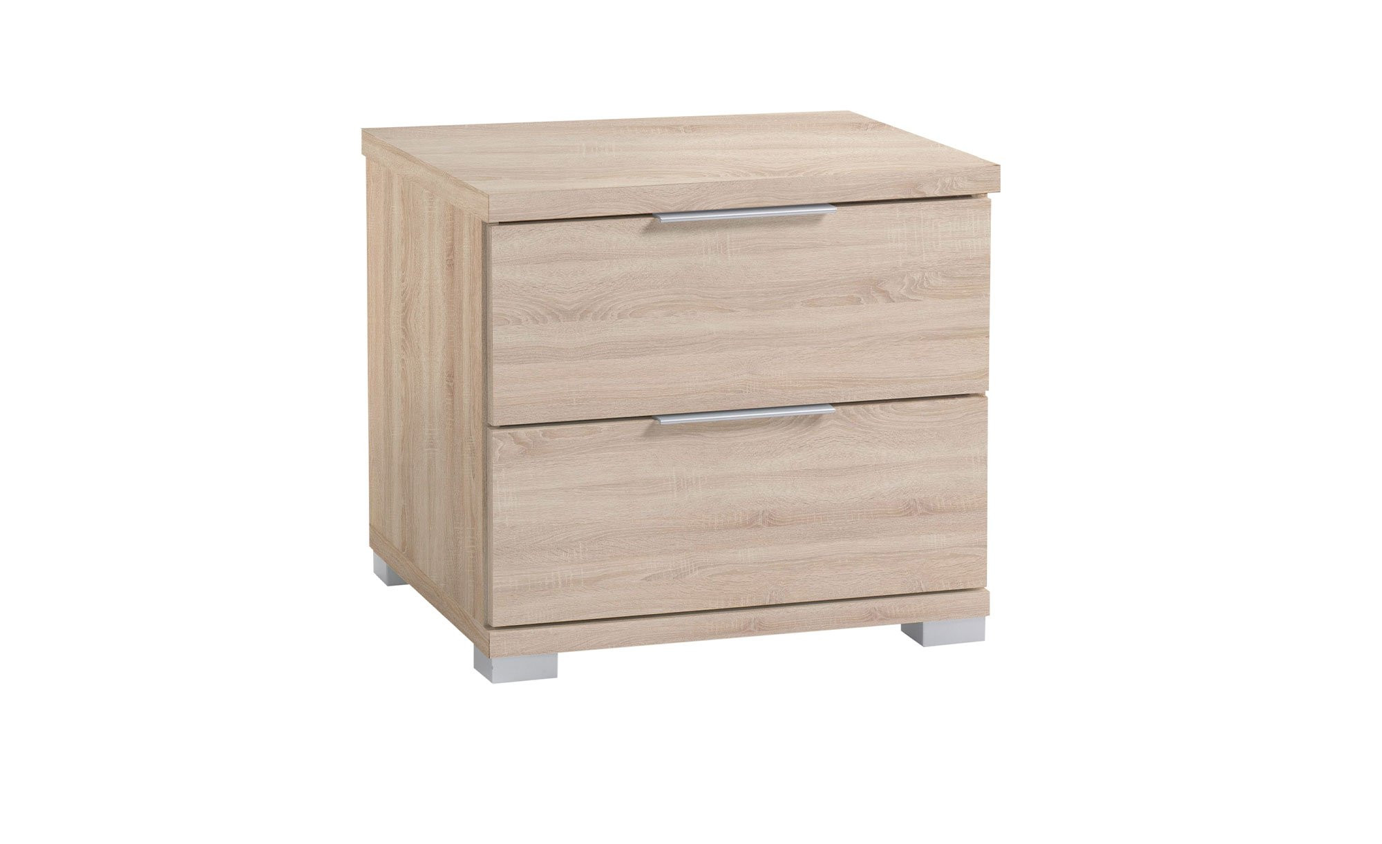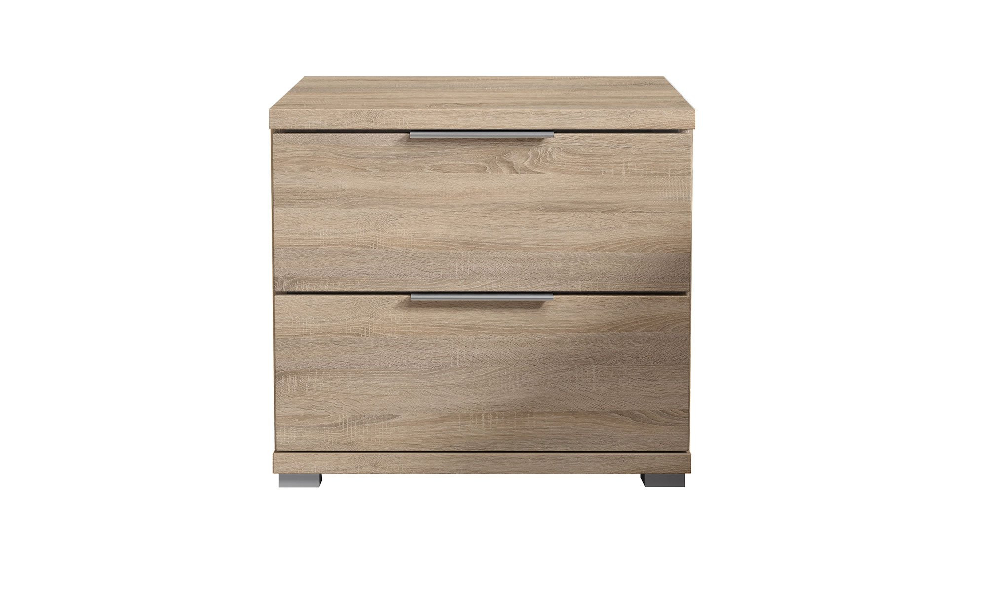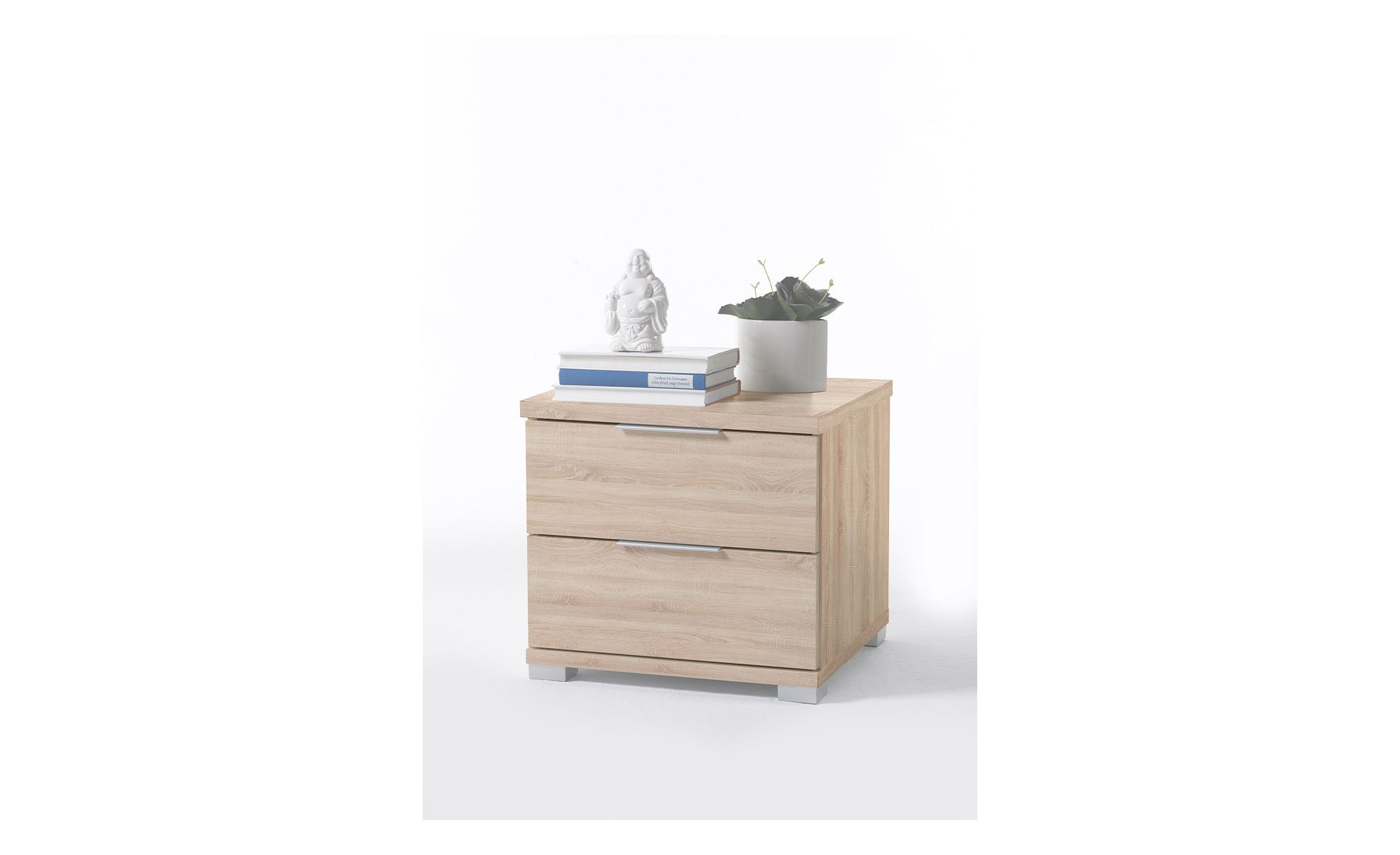 Ein Format von ca. 46 x 43 x 42 cm macht das Möbelstück zum vielseitigen Begleiter. Es besteht aus Holzwerkstoff in einem natürlichen Eiche Sonoma Dekor. Das Innendekor ist ebenfalls in diesem Holz-Ton gestaltet und verfügt zusätzlich über weiße Bestandteile. Eine Melaminharz-Beschichtung schützt Front und Korpus vor Gebrauchsspuren.