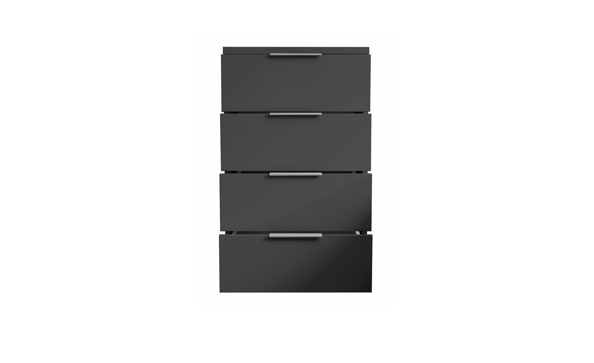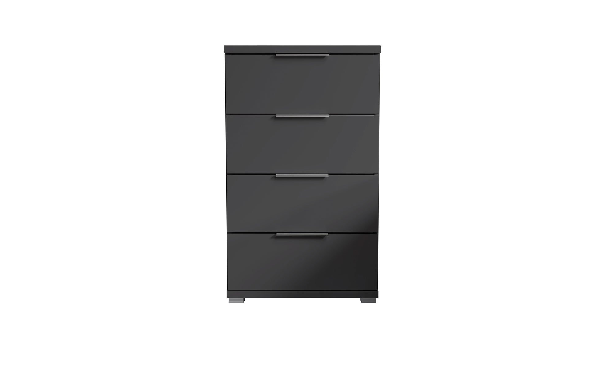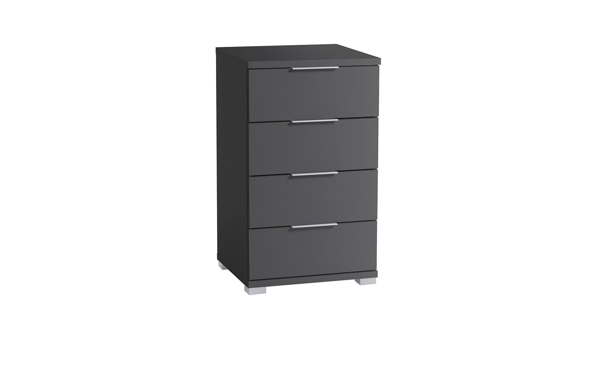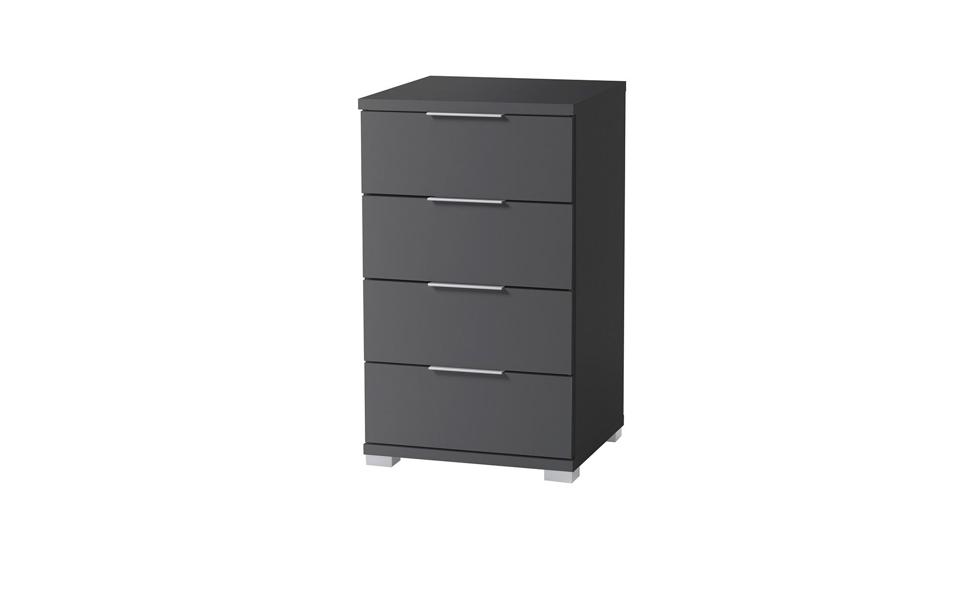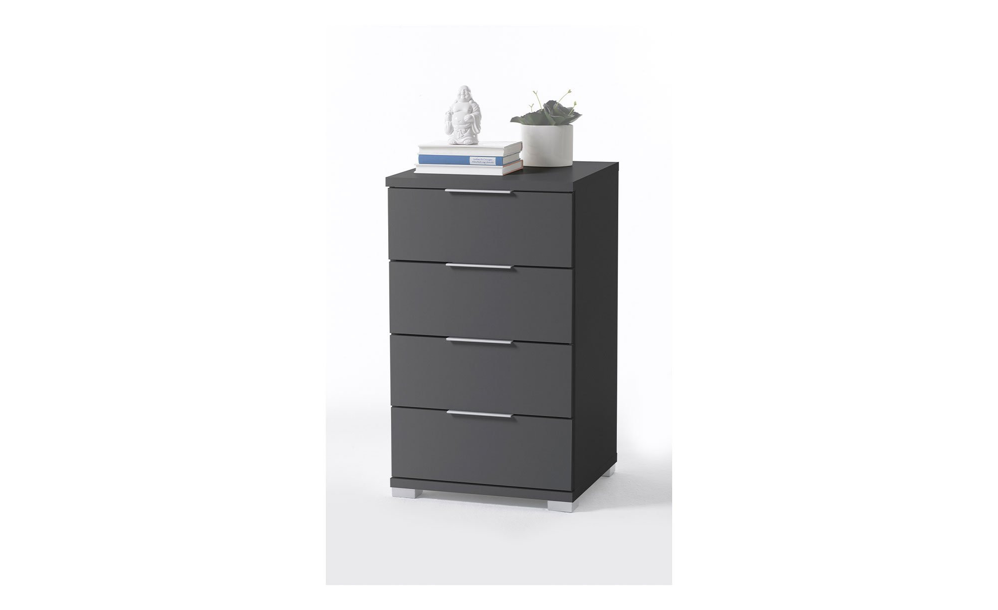 Graphitfarbiger Holzwerkstoff mit Melaminharz-Beschichtung trifft bei diesem Artikel auf alufarbene Kunststoffgriffe und -füße – eine Kombination, die schlicht und stilvoll zugleich ist. Das Innendekor ist in Graphit und Weiß gehalten.