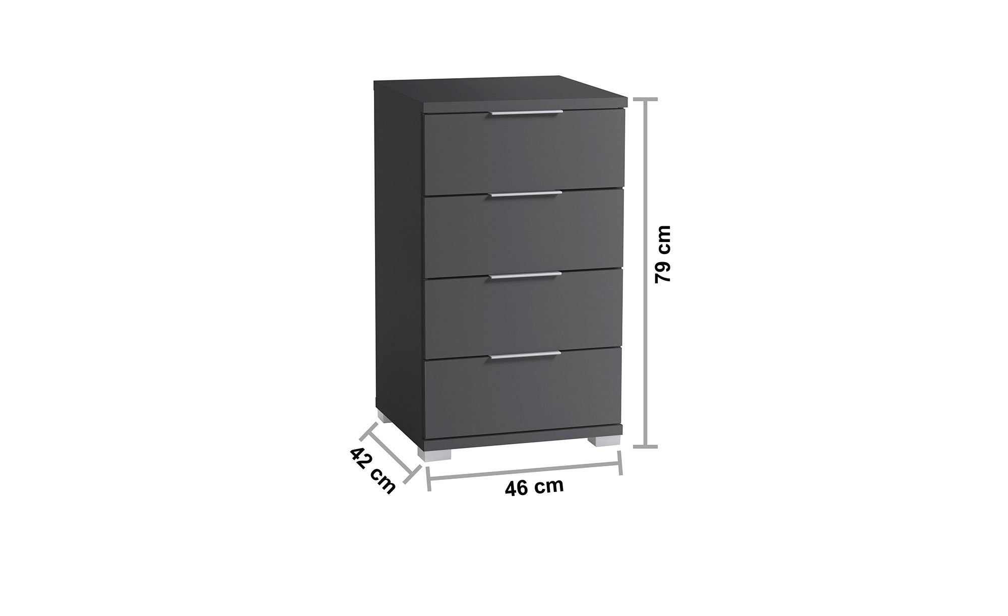 Vier Schubkästen eignen sich zum Verstauen Ihrer Abendlektüre, Ladekabel oder anderer Kleinigkeiten. Mit Maßen von ca. 46 x 79 x 42 cm macht das Möbelstück auch in kleineren Räumen eine hervorragende Figur.