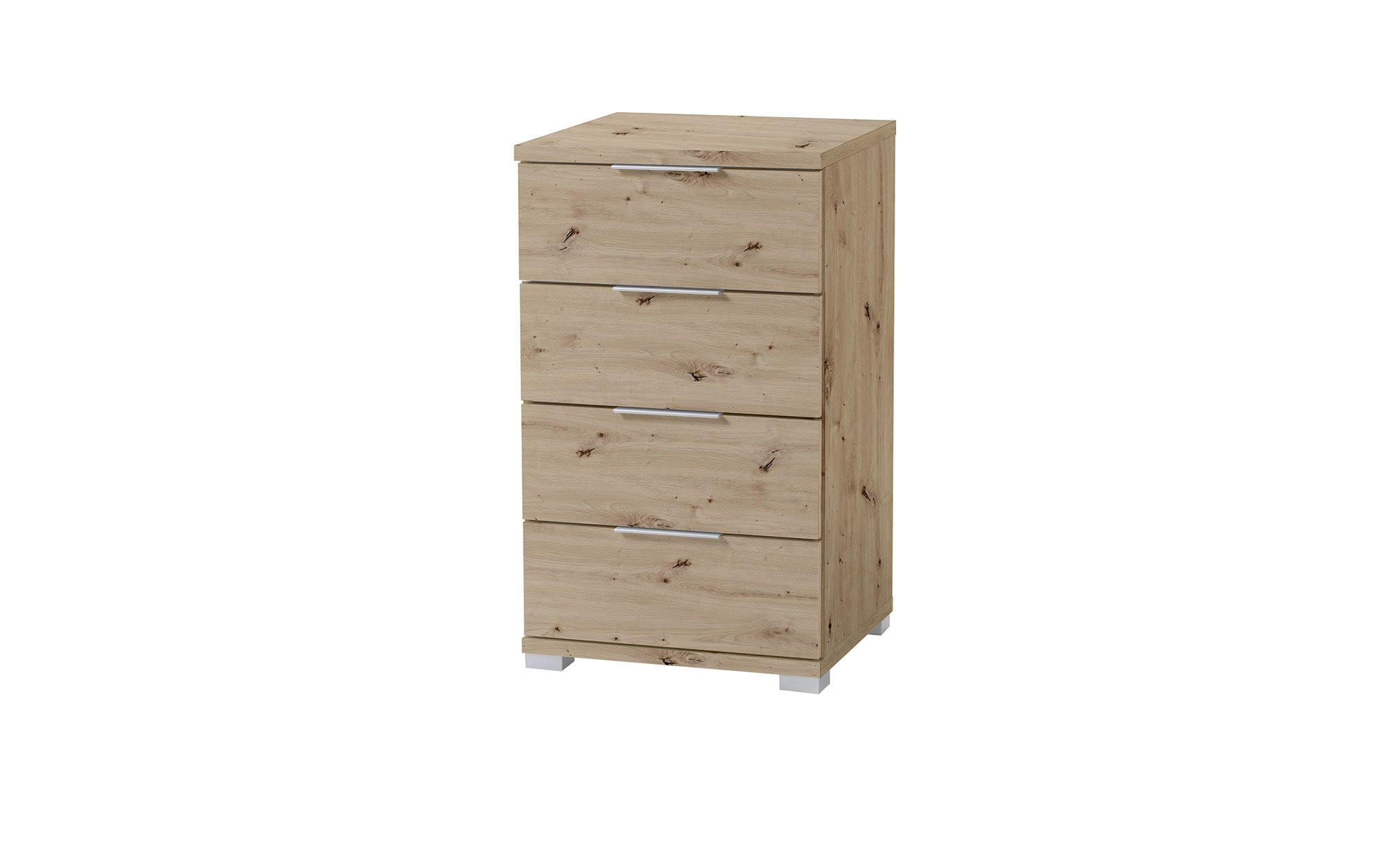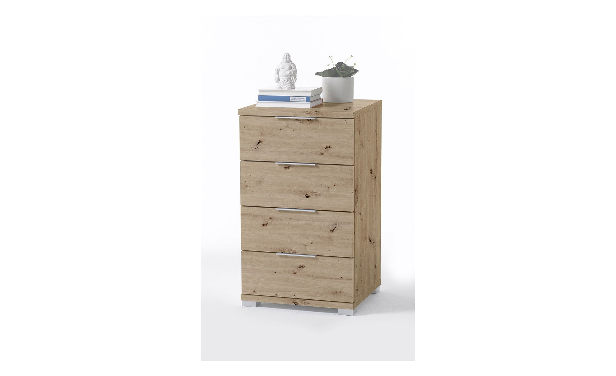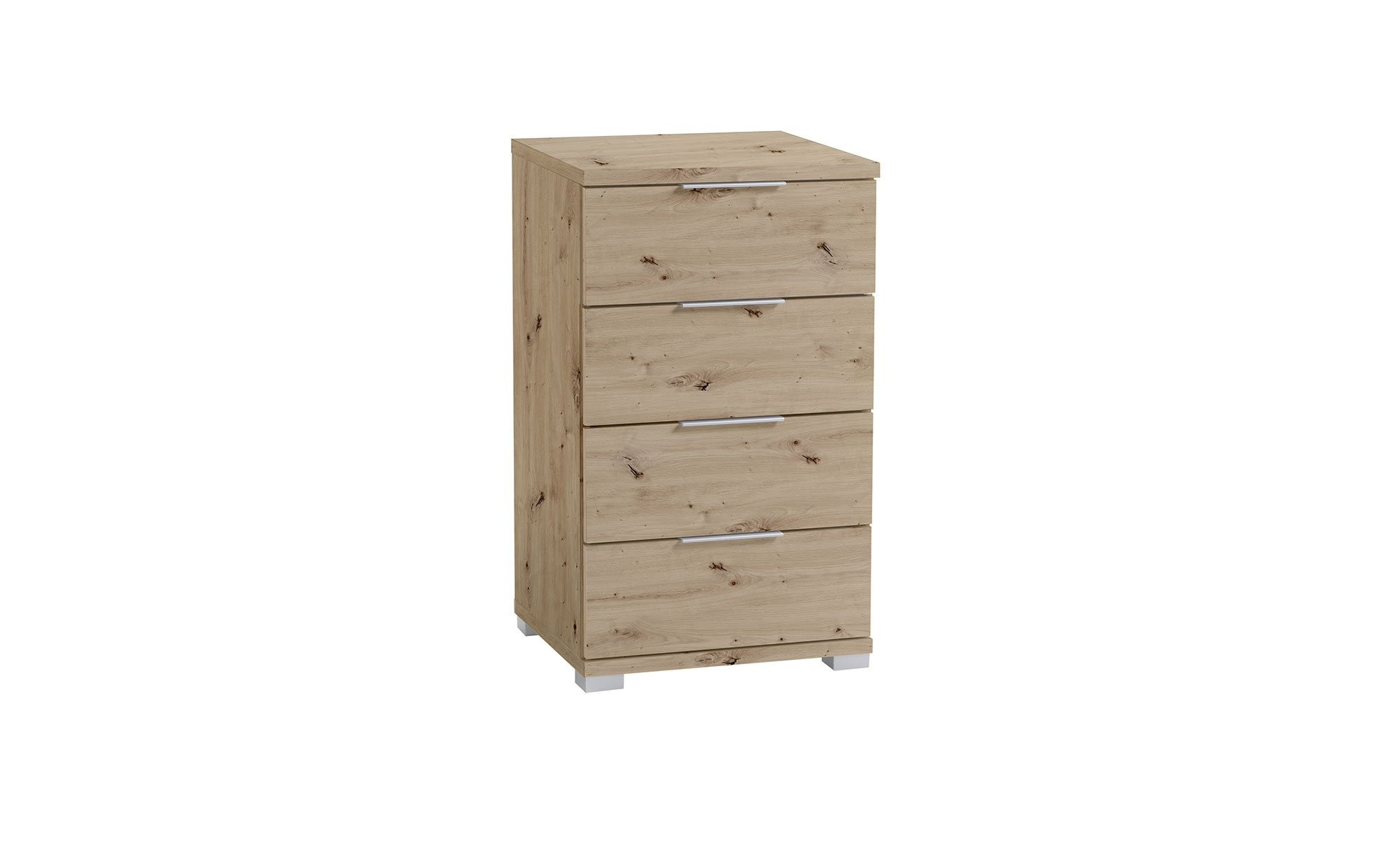 Neben alufarbigen Füßen wurden auch ebensolche Kunststoffgriffe integriert. Sie helfen Ihnen beim Öffnen und Schließen der vier Schubladen.
